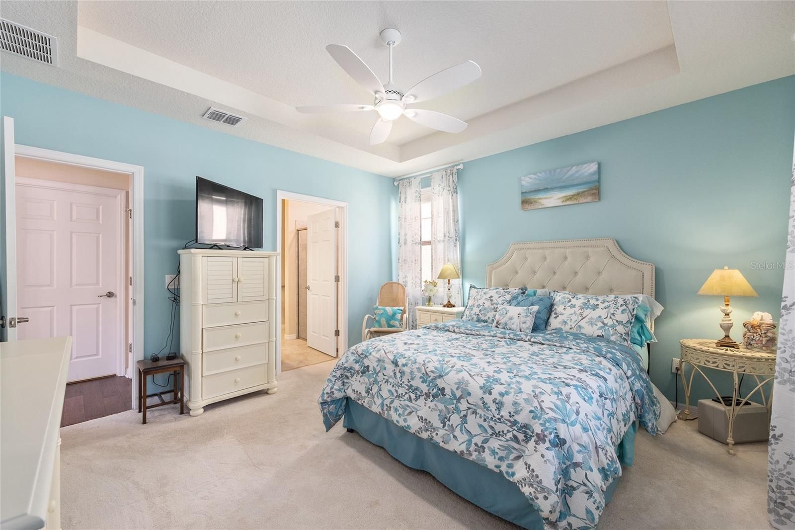 - Ceiling Fan(s), Eat-in Kitchen, High Ceilings, Open Floorplan, Main Level Primary, Solid Surface Counters, Solid-Wood Cabinets, Split Bedrooms, Stone Counters, Thermostat, Tray Ceiling(s), Window Treatments