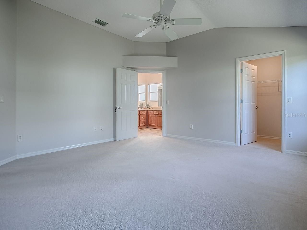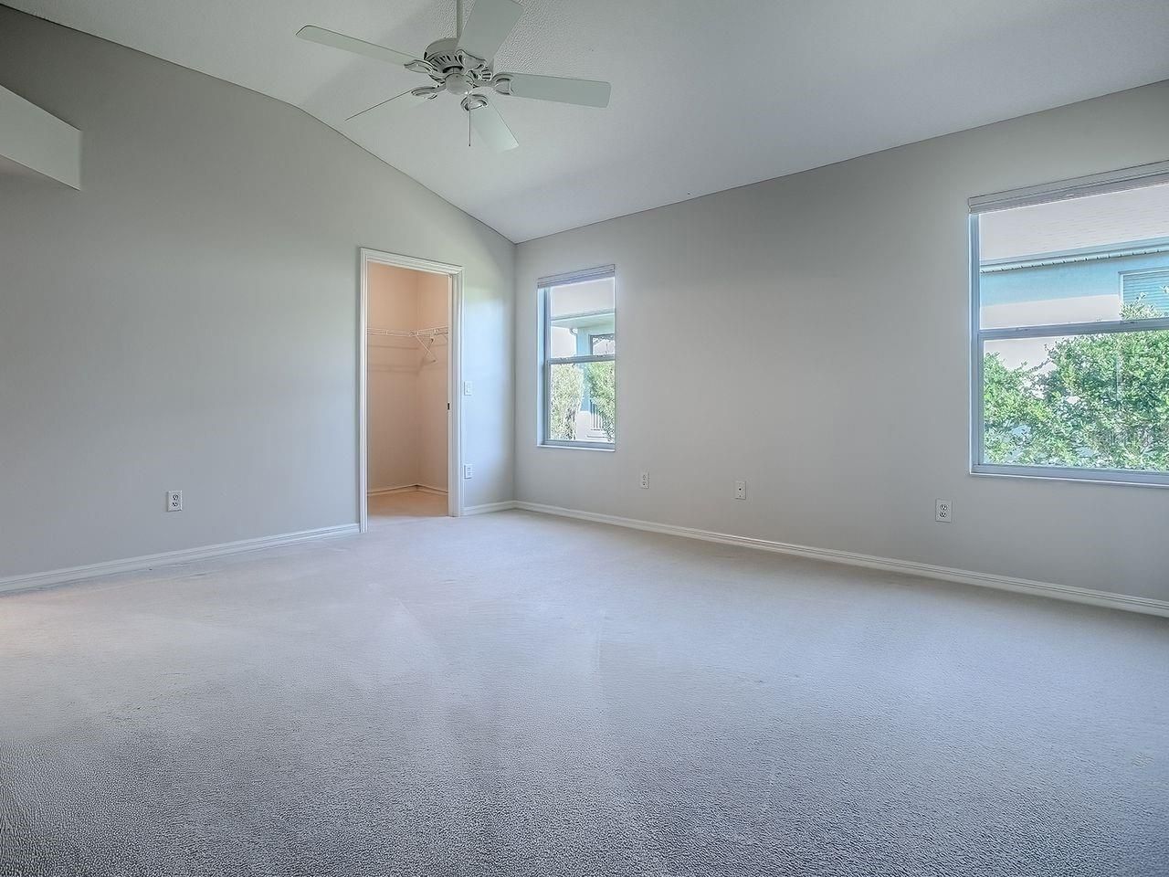 - Ceiling Fan(s), Chair Rail, Crown Molding, Eat-in Kitchen, High Ceilings, Open Floorplan, Main Level Primary, Solid-Wood Cabinets, Split Bedrooms, Thermostat, Walk-In Closet(s), Window Treatments