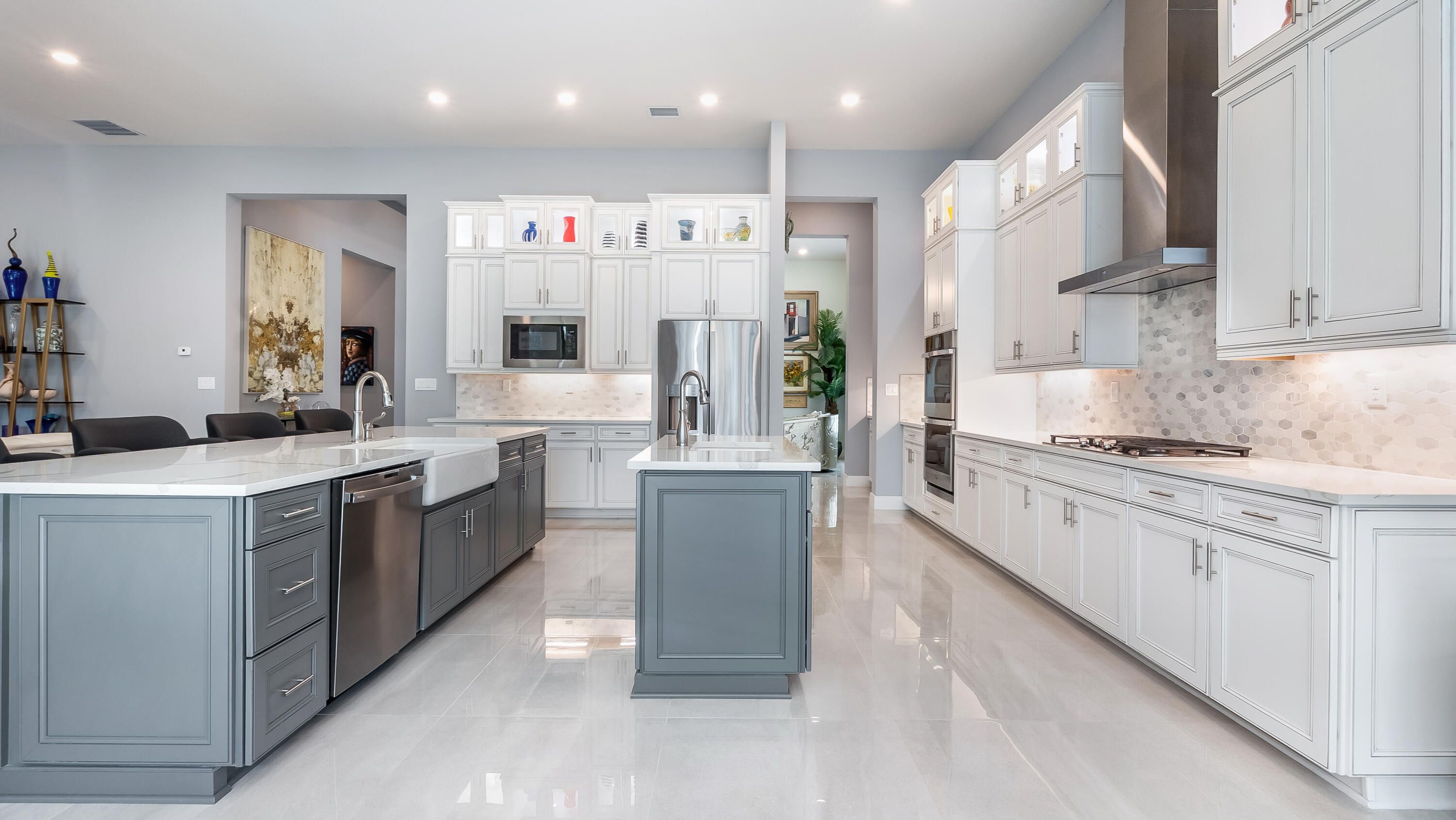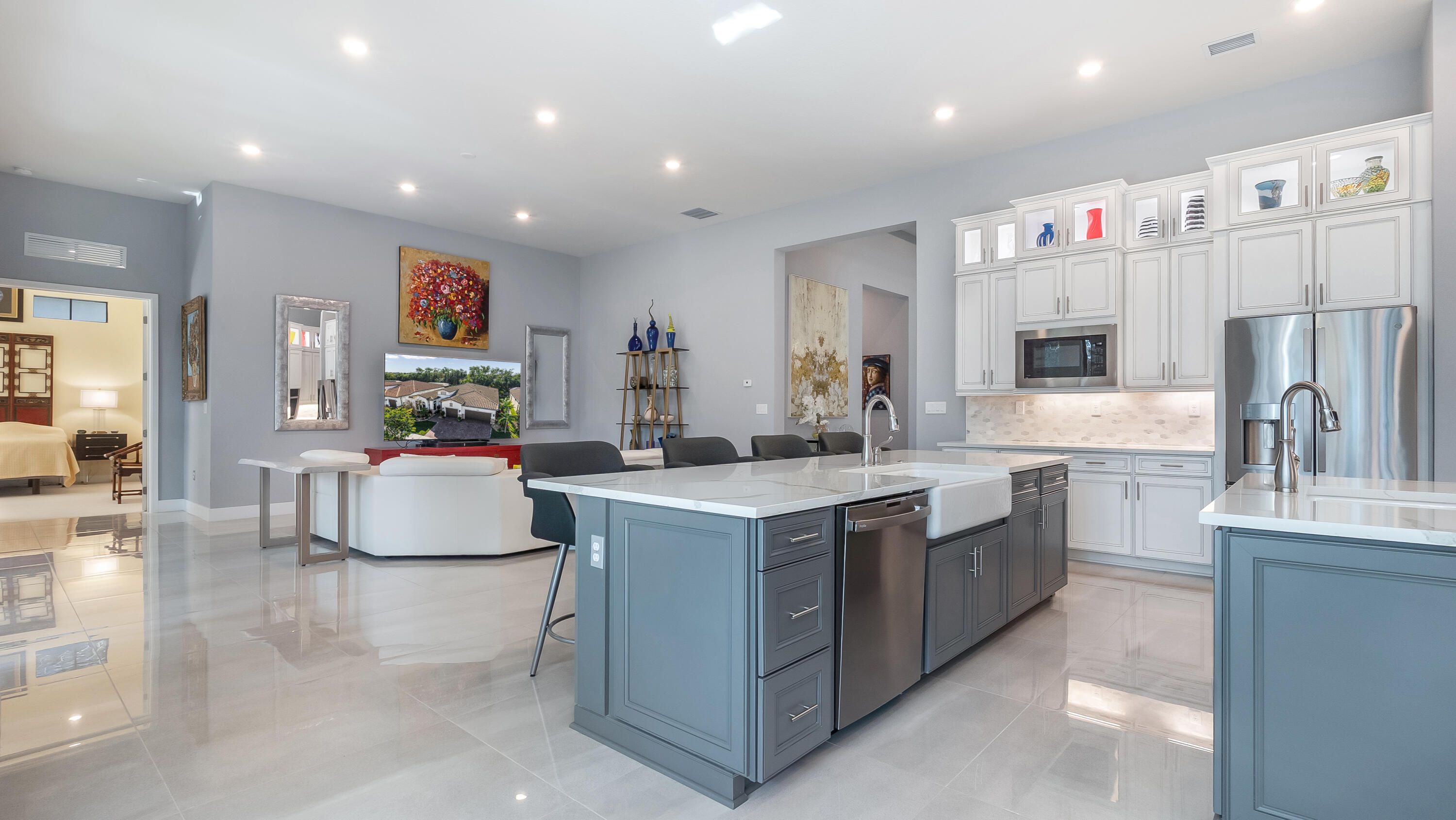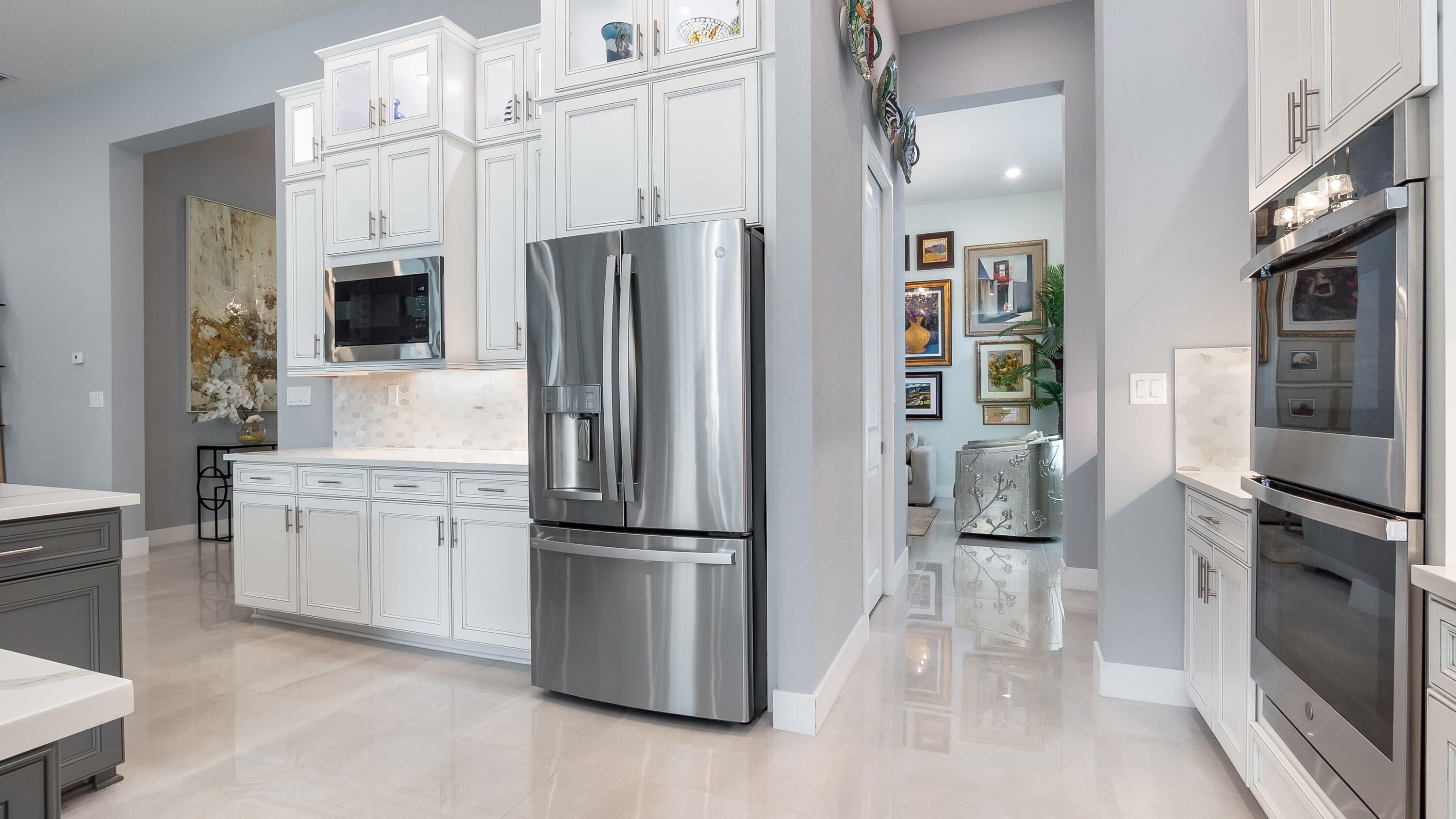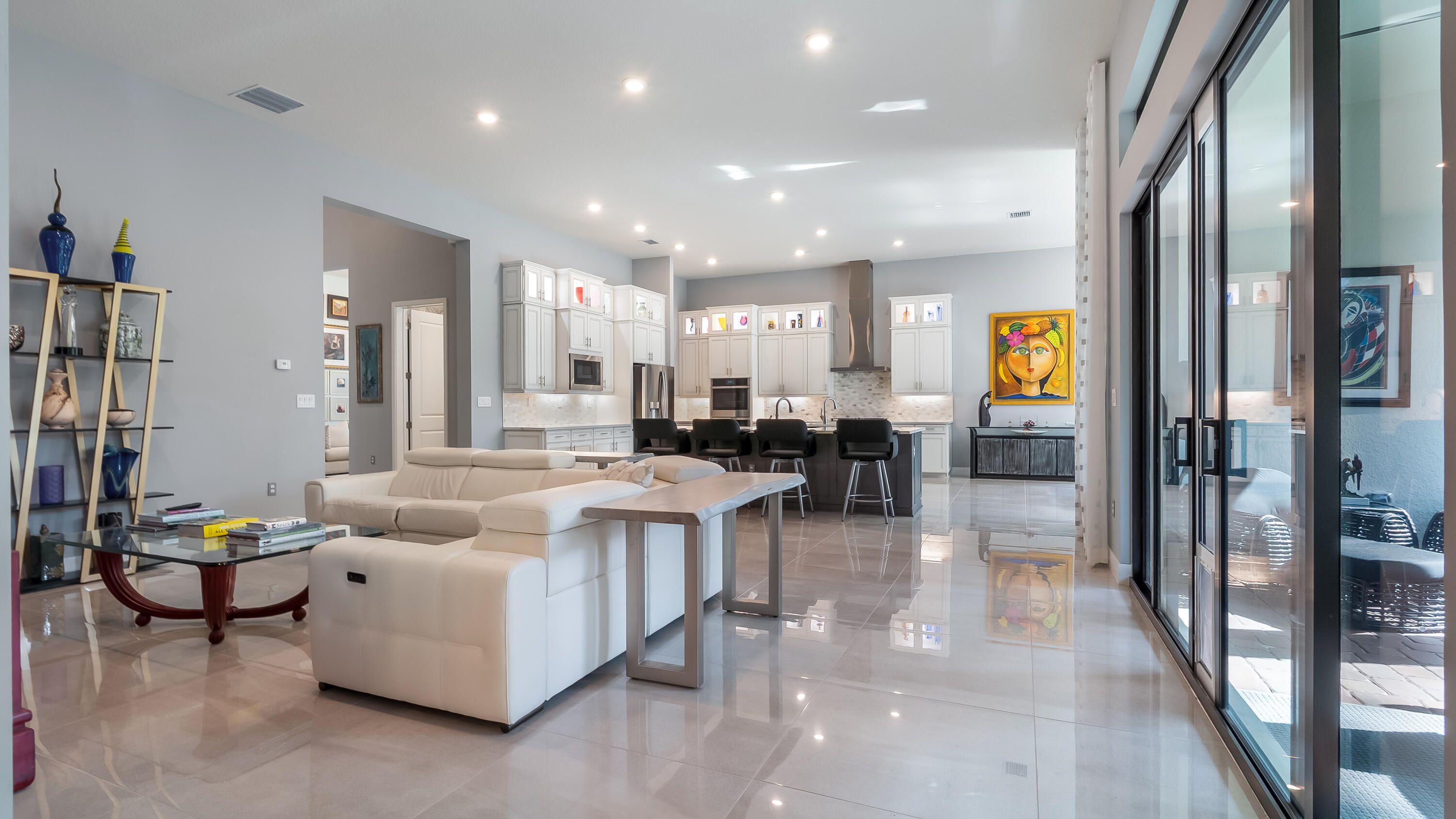 Here is a rare opportunity to own a practically brand new, turnkey, move-in ready multigenerational home located within the prestigious 55+ gated community of The Falls at Parkland. The highly sought-after Islamorada model is one of the most unique floorplans in the community and is thoughtfully designed for true multigenerational living. This residence offers 4 bedrooms, 3 full bathrooms, a powder room, a 3-car garage, and a private in-law or live-in nurse suite complete with its own separate entrance. Inside, the home features 32x32 porcelain tile throughout the main living areas, a desirable split floorplan, and upgraded carpet in all bedrooms. Every bedroom includes custom built-out closets, providing exceptional storage throughout the home. The kitchen serves as the heart of the home and is truly impressive with double kitchen islands, upgraded stacked cabinetry with glass, quartz countertops, dual sinks, natural gas cooking, a custom built-out walk-in pantry, and a whole-kitchen water filtration system. This space is ideal for both entertaining and everyday living. The primary suite is privately situated in its own wing and offers a spa-inspired bathroom with dual sinks, a walk-in shower with upgraded tile, and one of the largest custom walk-in closets in the community. Additional features include impact glass throughout and seamless indoor-outdoor living. Enjoy the screened-in patio overlooking a large, fully fenced backyard with no rear neighbors, offering privacy and tranquility. Residents of The Falls at Parkland enjoy resort-style amenities including a grand ballroom, billiard room, multiple card rooms, a full-service fitness center with classes, a yoga studio, a resort-style pool, pickleball and tennis courts, a full-service café, a private theatre, and much more.