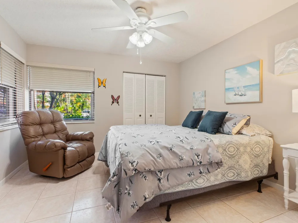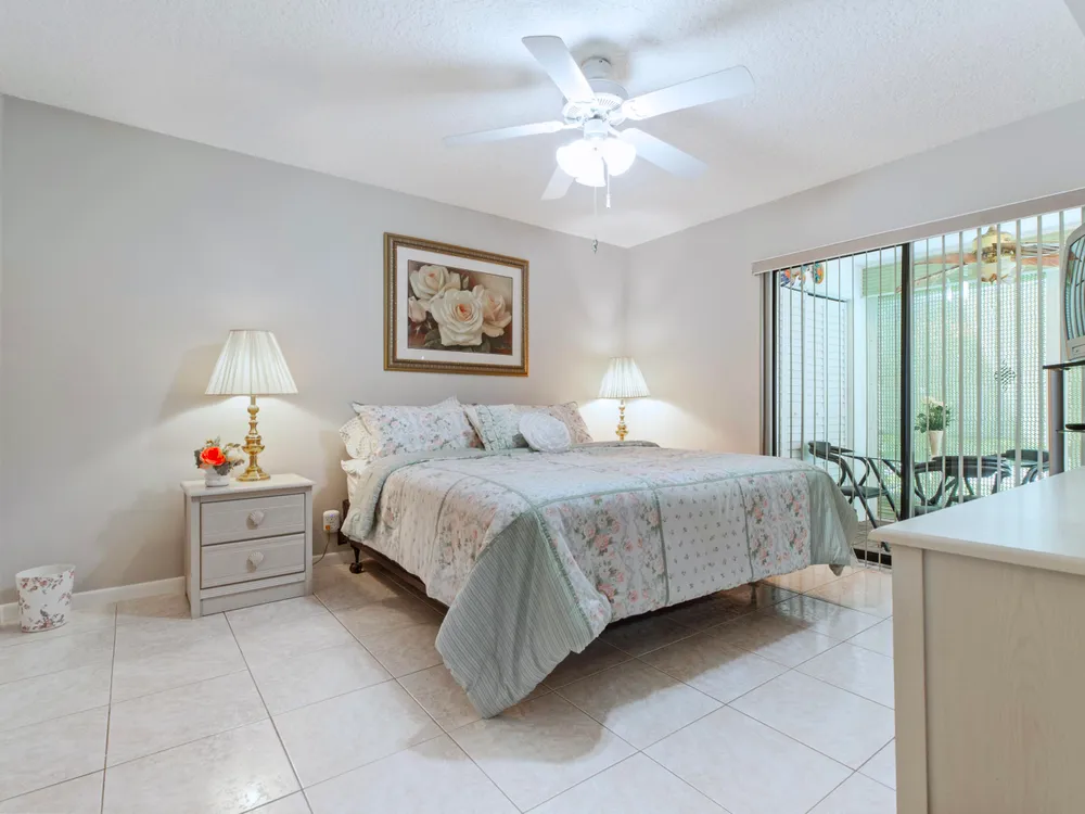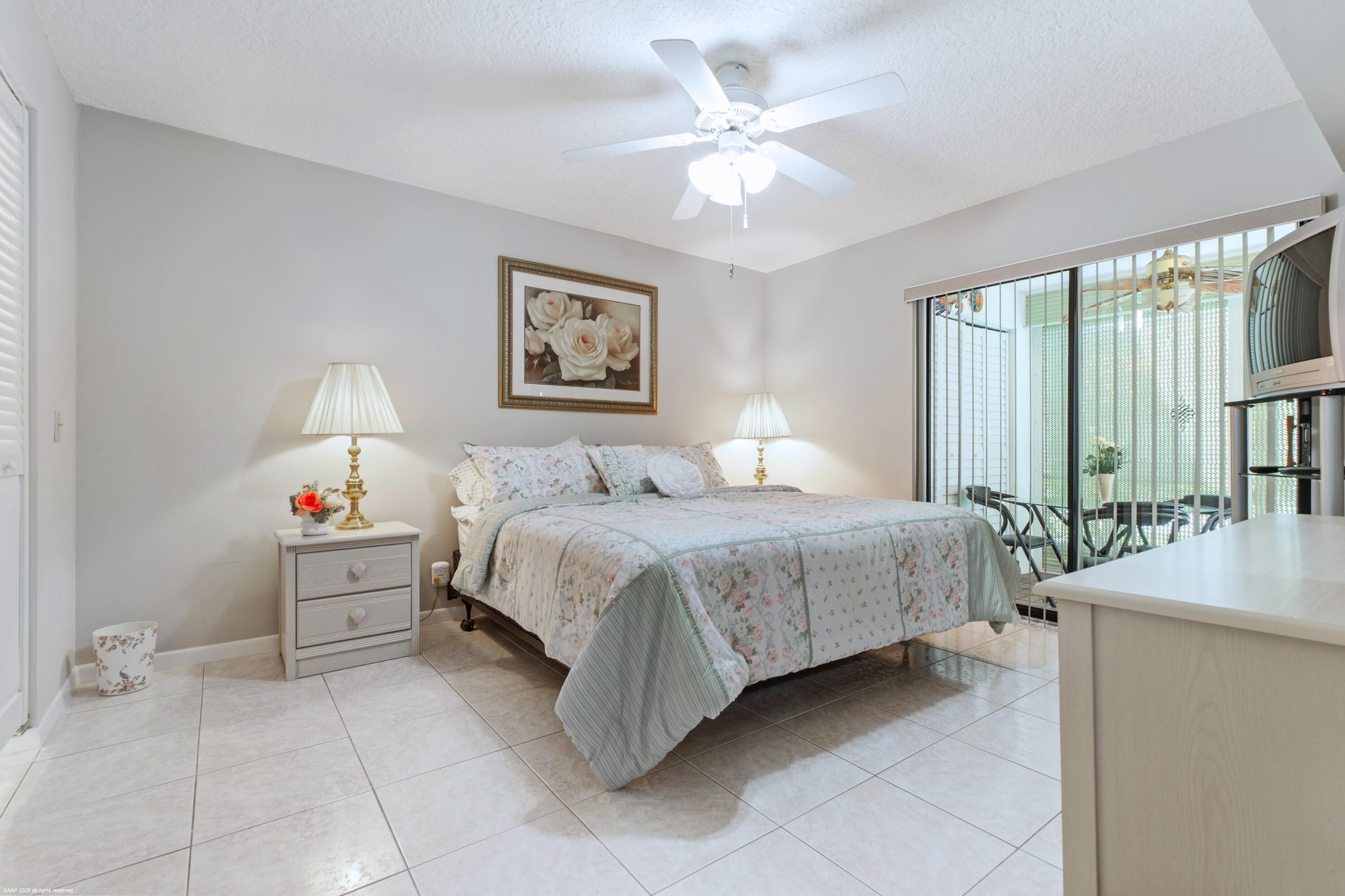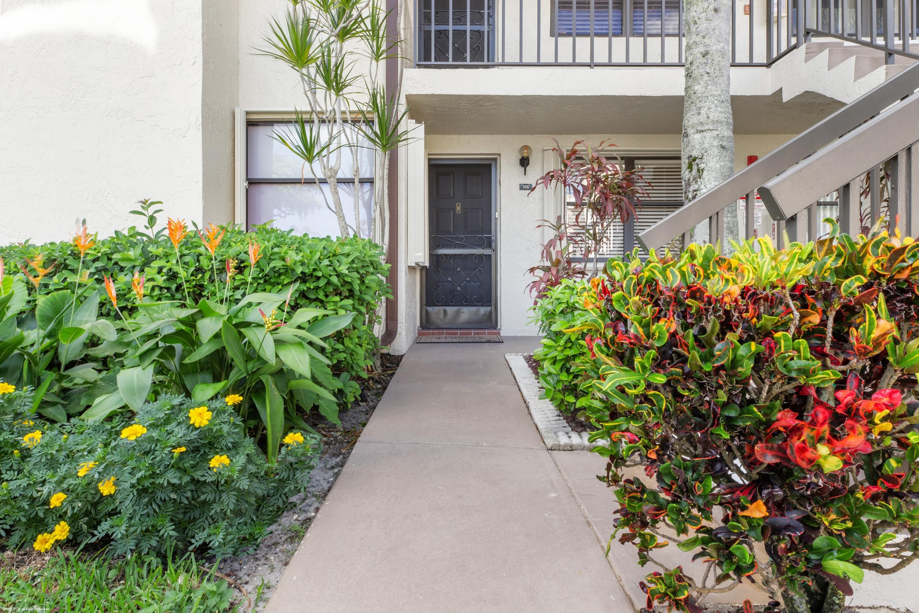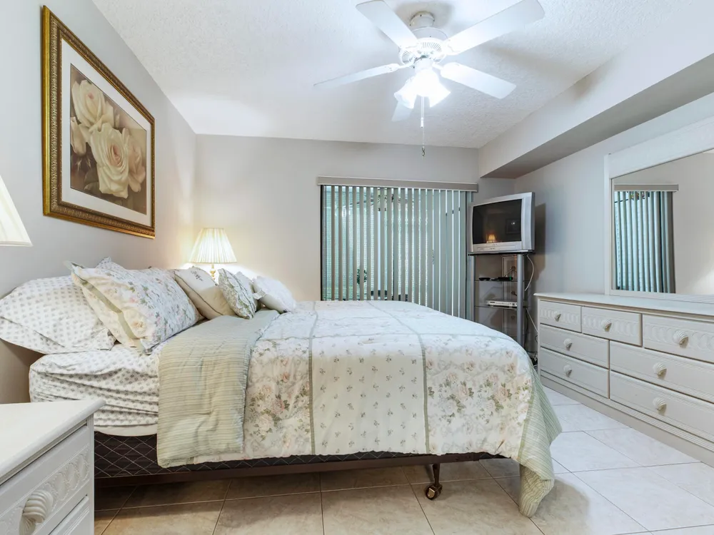 First floor condo unit located within walking distance to the satellite pool. Freshly painted and well maintained 2 bedroom 2 bathroom with an open layout. Tiled floors throught for a seamless flow. Primary suite has a large walk in closet and a separate vanity with a private enclosed shower. Inside laundry closet. A screened in and tiled patio with a large storage closet offers peace and tranquility.The condo has been outfitted with accordian shutters for ease and peace of mind during the summer months. Recently installed window treatments. This condo is being offered fully furnished.