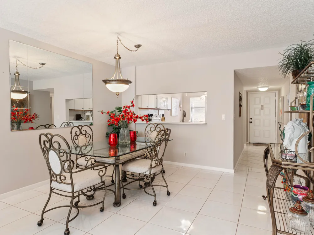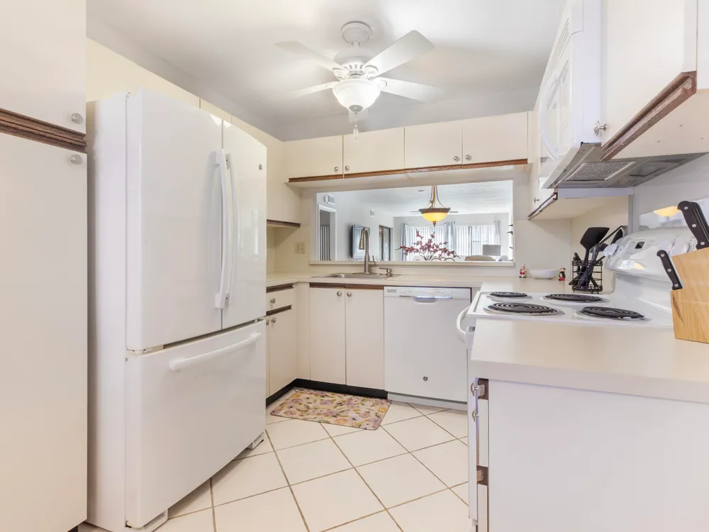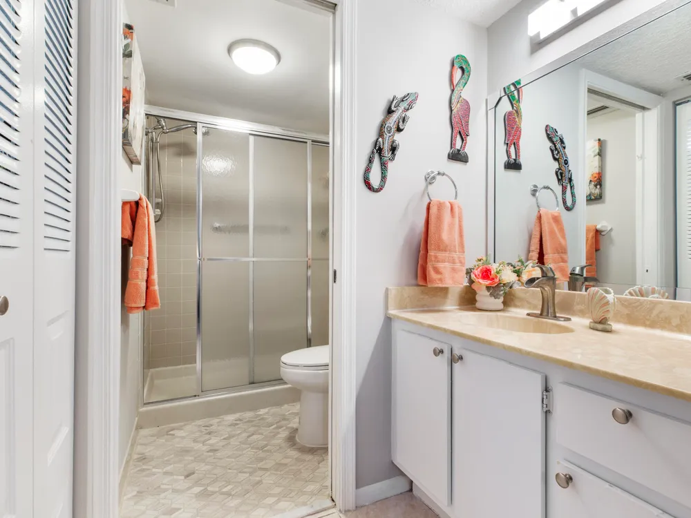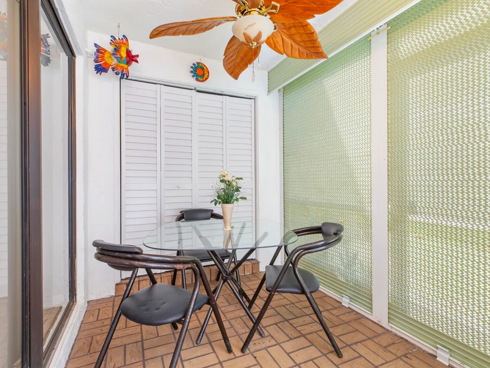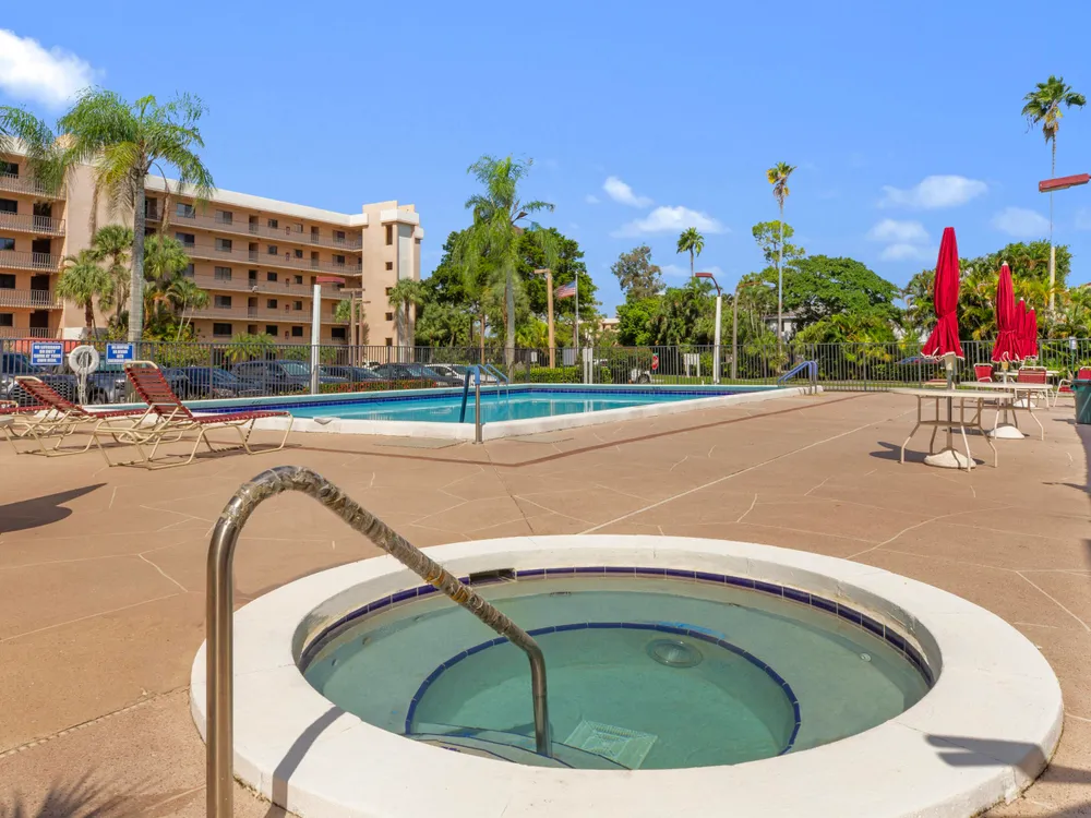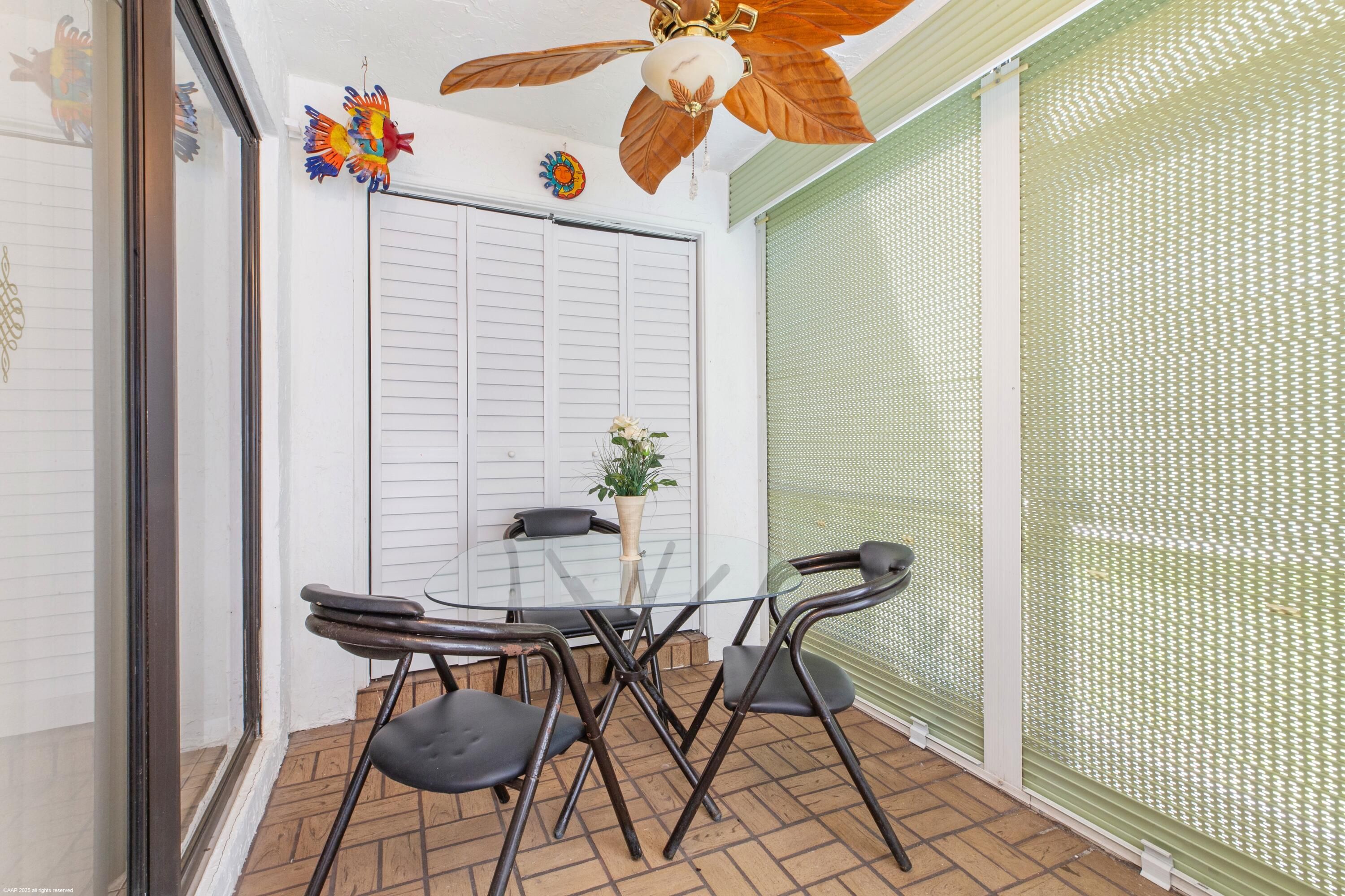 First floor condo unit located within walking distance to the satellite pool. Freshly painted and well maintained 2 bedroom 2 bathroom with an open layout. Tiled floors throught for a seamless flow. Primary suite has a large walk in closet and a separate vanity with a private enclosed shower. Inside laundry closet. A screened in and tiled patio with a large storage closet offers peace and tranquility.The condo has been outfitted with accordian shutters for ease and peace of mind during the summer months. Recently installed window treatments. This condo is being offered fully furnished.