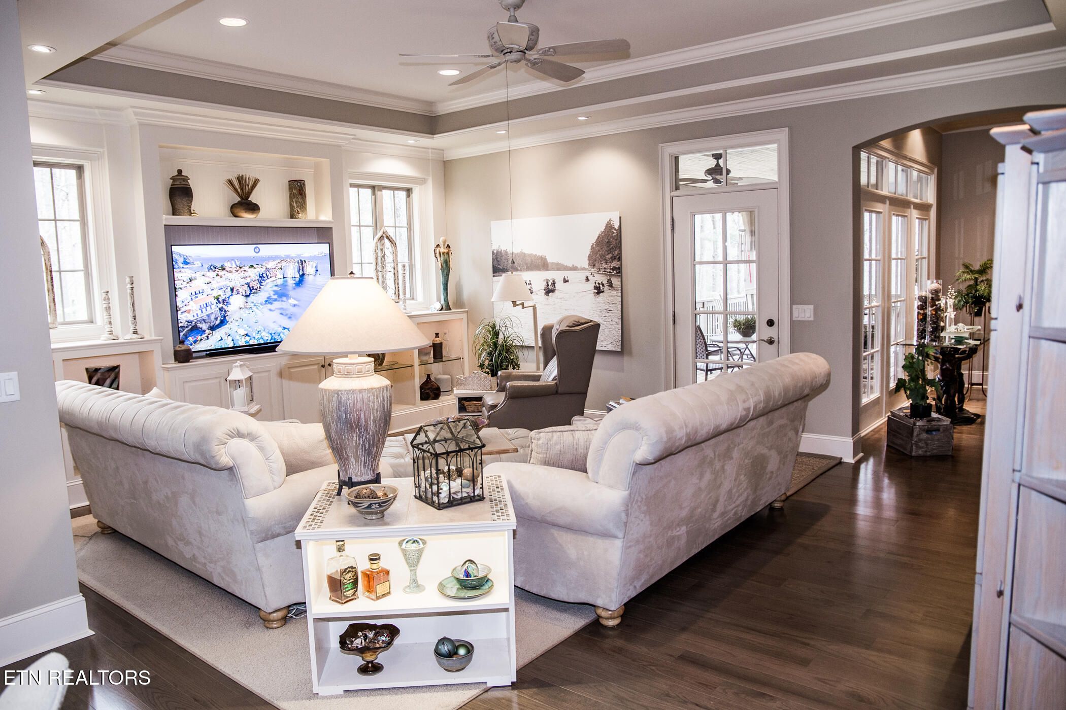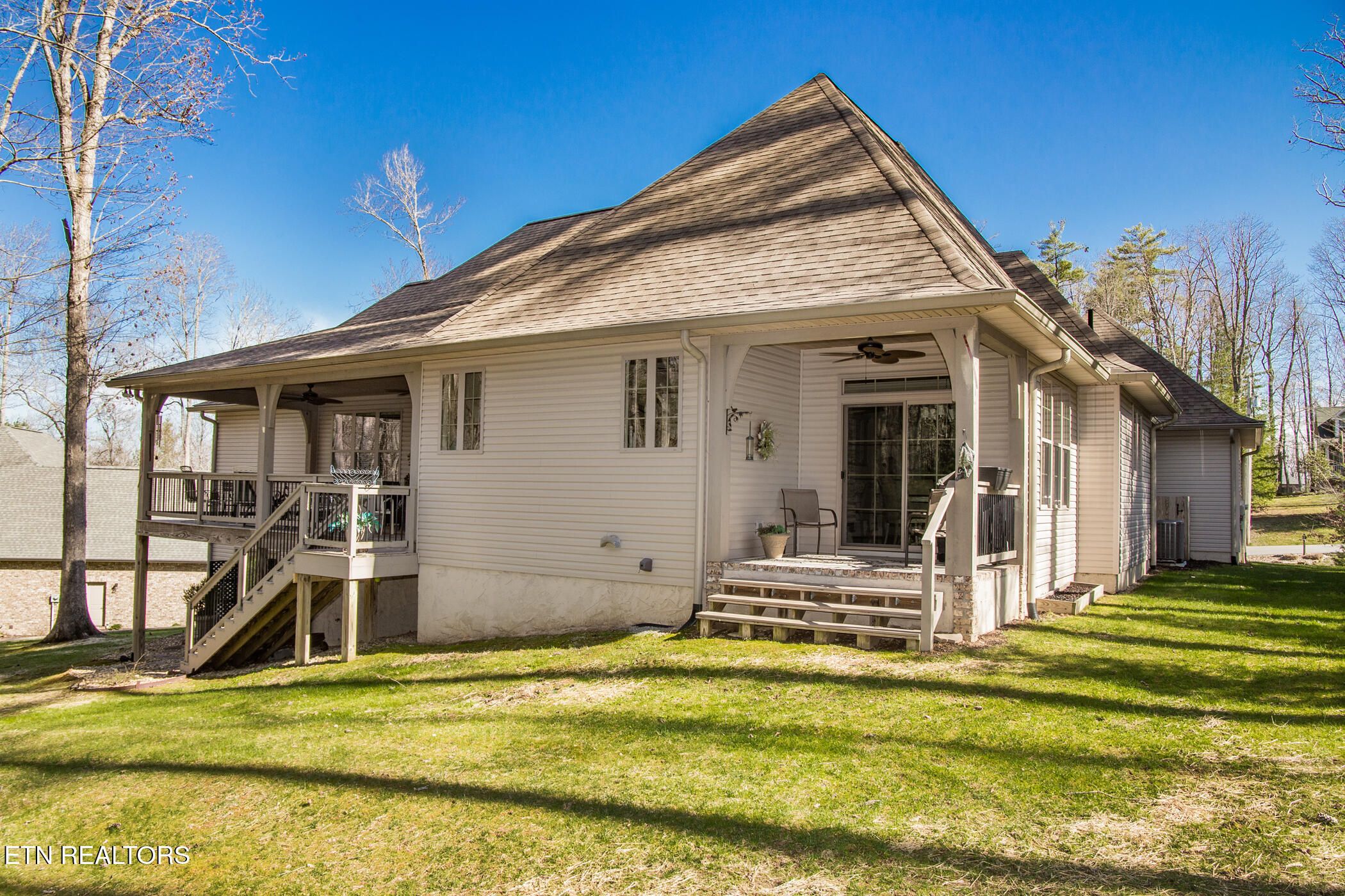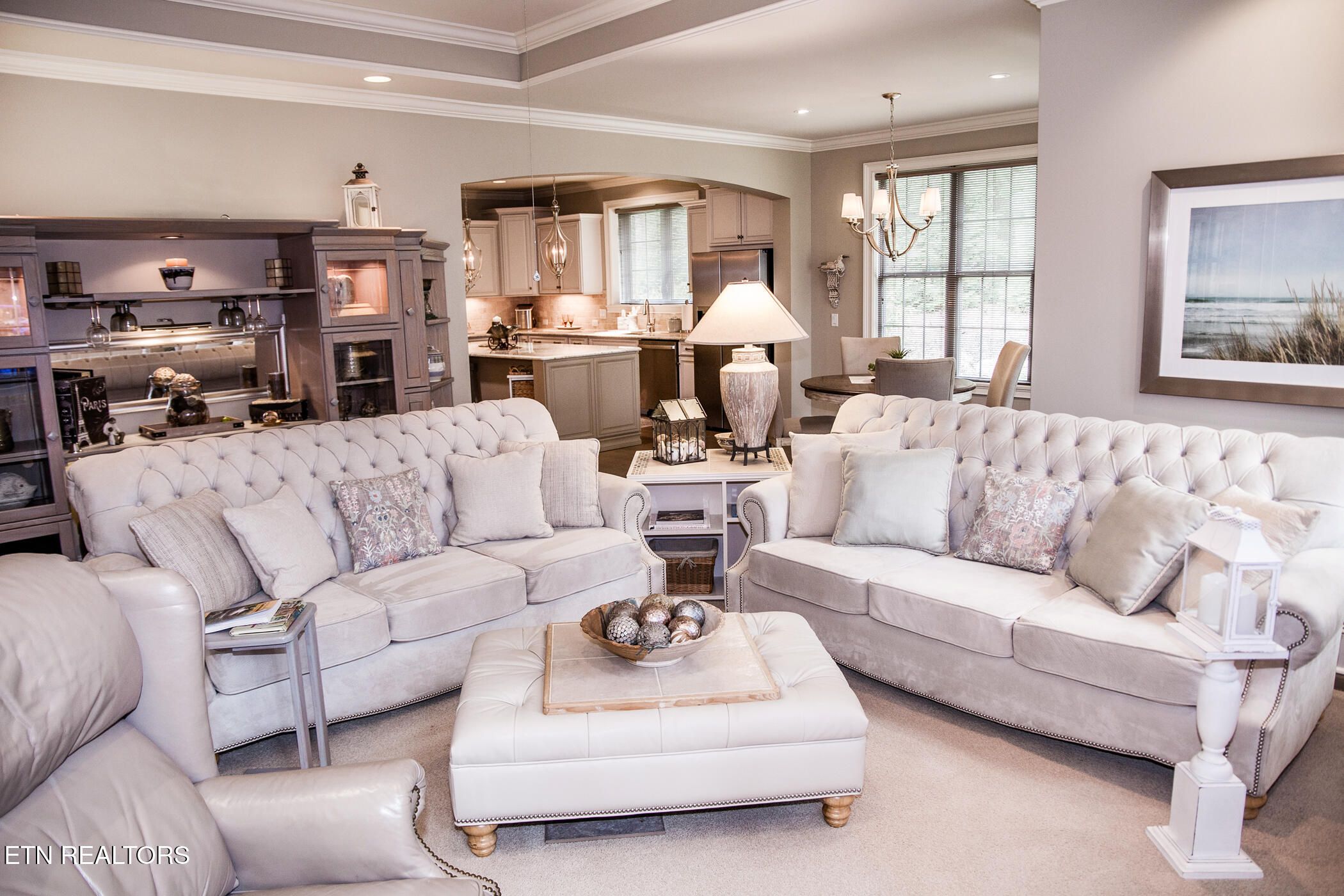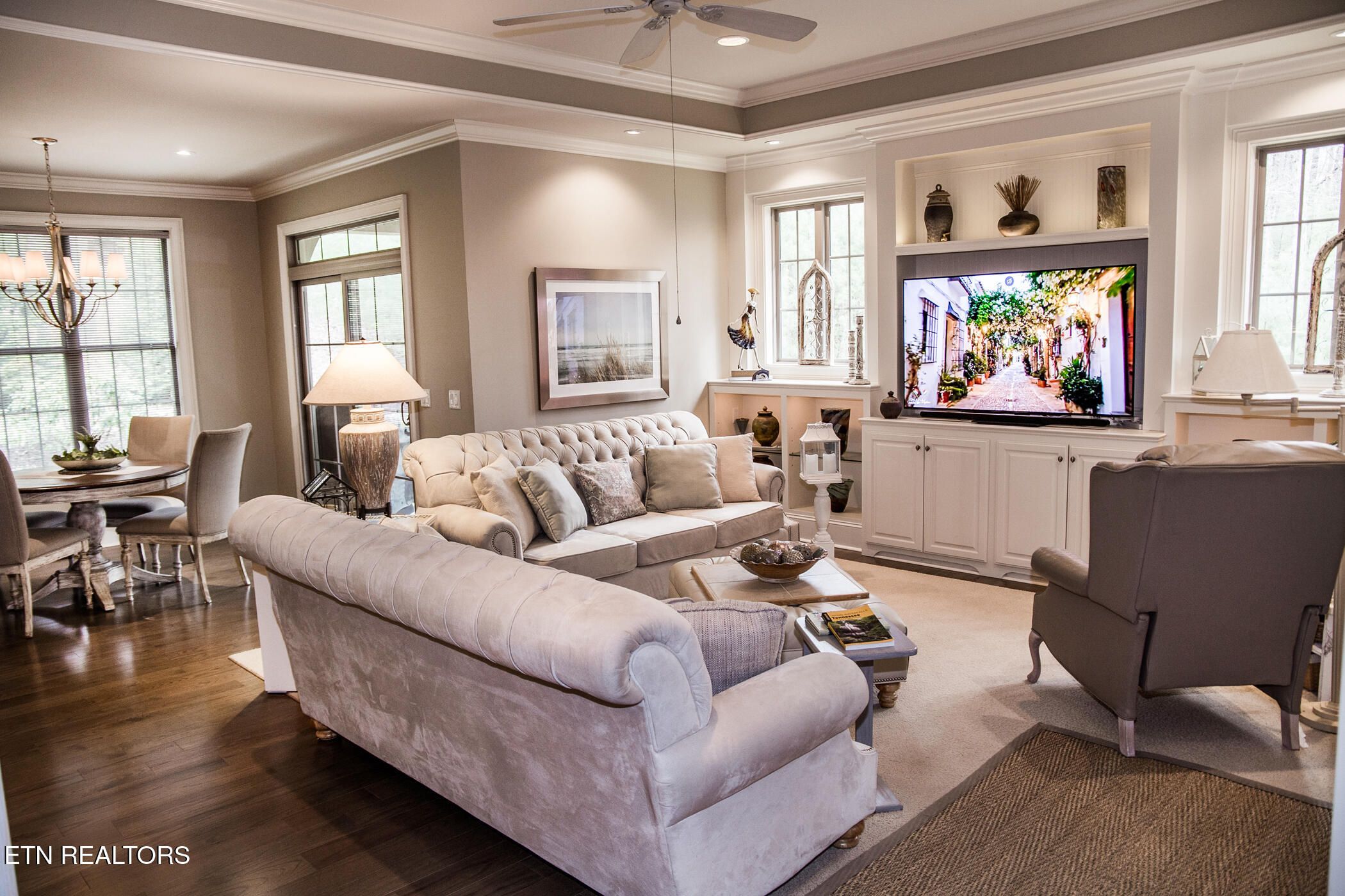 LIKE-NEW BELGIAN STYLE HOME on PRIVATE WOODED LOT NEAR GOLF COURSE - MOVE-IN READY in FAIRFIELD GLADE TN. Belgian style, architecturally designed and built by Fairfield Glade's Premier Builder -Zurich Homes-. Located on a very quiet cul-de-sac street on over 1/2 an acre of professionally landscaped property with only trees & nature visible in your private backyard. This very desirable neighborhood offers easy access to 5 challenging Golf courses - 11 lakes for boating & fishing - miles of walking paths & hiking trails - Tennis & Pickelball courts - indoor & outdoor pools - all while being tucked away in a very peaceful setting just outside of Crossville TN. Built in 2015, this beautifully maintained 2,736 Sq Ft. Gallery home offers the perfect blend of modern finishes, comfort, and privacy. You enter through a beautiful foyer with a space designed for custom art work. The foyer leads into the formal dining room with a unique antique sand cast bronze chandelier (which is optional), surrounded by custom down-lighting on dimmers. The dining room allows you to view the peaceful wooded area behind your home. The adjoining open great room has beautiful built-ins, allowing you to position your main TV to allow viewing from the Great room, Breakfast nook and Chef's kitchen. from the great room you can access the large covered back deck with enough room to entertain your family and friends. The picture perfect chef's kitchen boasts a breakfast nook, a large island with ample storage, walk-in pantry, a small cooks desk, and access to a covered grilling deck. The large primary bedroom suite has a view to the picturesque wooded back area and a large en-suite bathroom with his & hers vanities, oversized custom ceramic tile shower and spacious walk-in closet. A gallery off the foyer separates the front and back of the home. The track lighting makes this the perfect space to display art work.The home includes custom lighting throughout. The front of the home has a cozy study with a fireplace, allowing for a second room to view your TV movies. The half bath is conveniently situated just across the hallway from the study. There are 2 guest rooms that share a Jack & Jill bath with tub shower. The laundry area also has a built-in desk and 2 additional storage closets. Plenty of additional storage can be found above the over-sized 2-car garage. A large conditioned concrete basement/crawlspace is designed for a workshop with lighting and separate electrical sub-panel. This space includes a peg-board wall that separates it from the encapsulated stand up crawlspace area. The conditioned portion of the basement could also be used for an art room, exercise space, hobby room or a game table area. The stand up crawlspace area can also be used for additional storage as well as access to the home's plumbing & HVAC systems. This well maintained house with it's thoughtful design and finishes presents itself as a show-stopper in this exclusive neighborhood. A home with this level of privacy & charm is hard to find. Located in the amenity rich Fairfield Glade Resort community this could be your own private slice of East Tennessee living. (all information is deemed to be reliable, but is not guaranteed & should be independently verified). (if the optional dining room chandelier is not purchased, the owner will remove it & the buyer will install a fixture of their choosing at their expense).