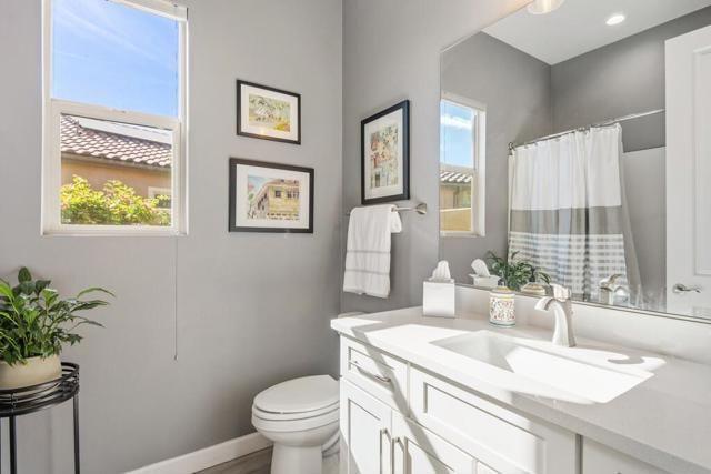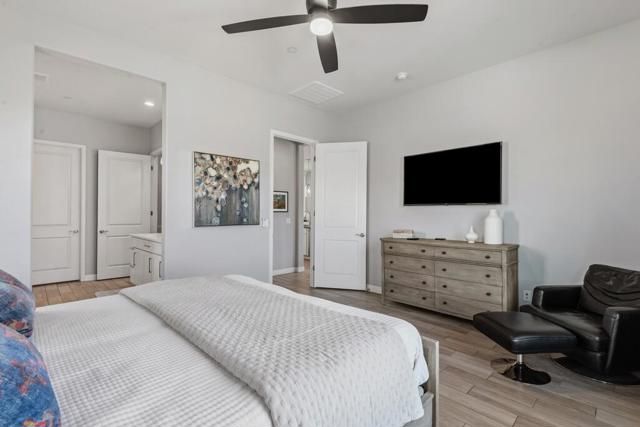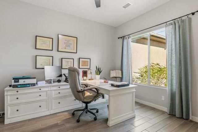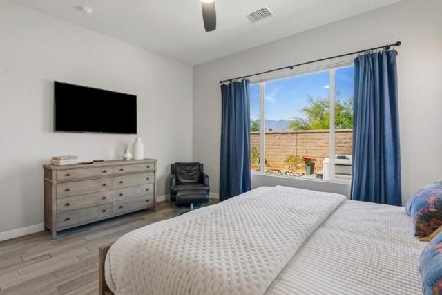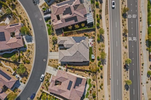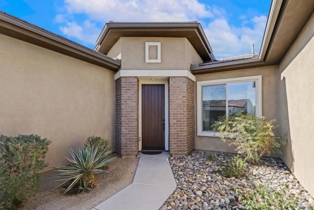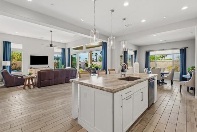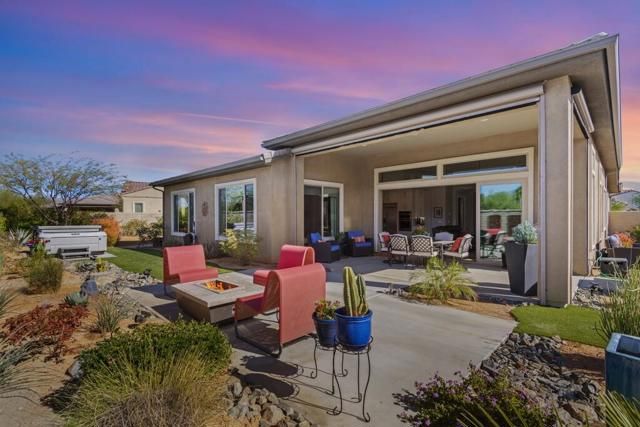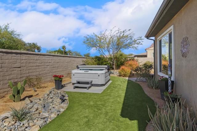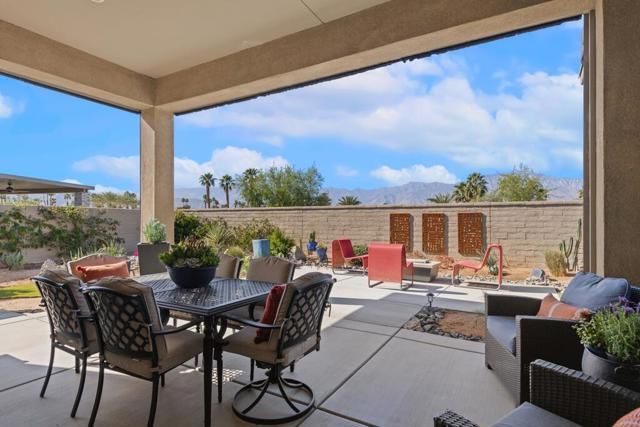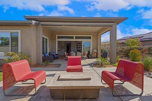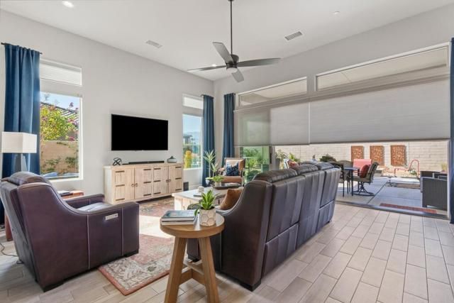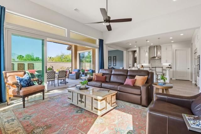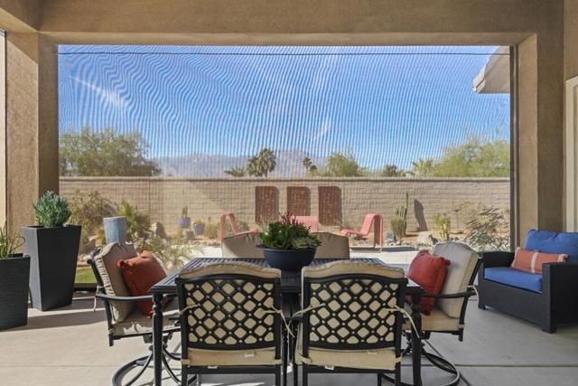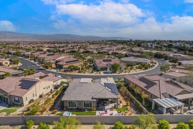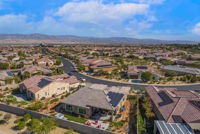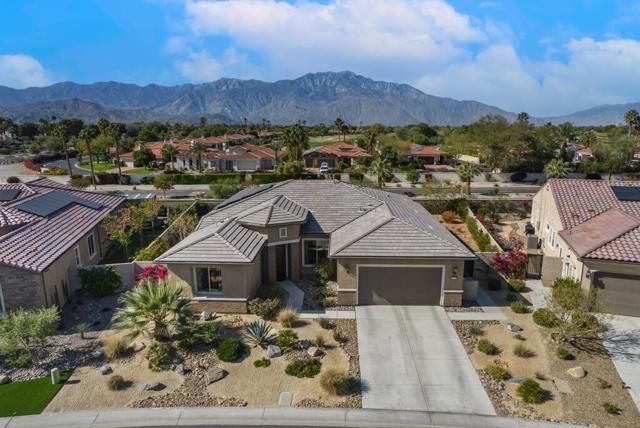 Del Webb Rancho Mirage is the premier 55+ community with walking trails, expanding views and convenient shopping and dining. Residents enjoy a low HOA fee that includes high speed internet, cable and streaming services. Clubhouse, pools, tennis courts, pickleball, putting green, fitness center and endless social activities and events. 77 Barolo Phase 1, Plan 3 Serenity home captures panoramic mountain views- all enhanced by OWNED SOLAR and thoughtful upgrades throughout. Inside, the open-concept layout features two bedrooms, TWO ADDITIONAL ROOMS for a den/office/media rooms, and two baths - Wood-look tile flooring, custom window treatments, tankless water heater and owned water softener. The chef's kitchen is the center of the home with upgraded KitchenAid appliances - including a built-in refrigerator - 42'' upper cabinets with crown molding, and executive island with extra storage, and double-honed granite countertops. The primary suite has quartz walk-in low threshold shower with a bench, dual vanities and a generous walk-in closet. The guest bedroom provides privacy for visiting friends and family. The home also has a Multi panel sliding door in the family room which leads to an outdoor patio with automatic outdoor screens which create an indoor/outdoor living/dining area.Step outside to a stunning, fully landscaped backyard oasis perfect for year-round desert living. Enjoy the panoramic mountain views, gather around the built-in firepit, or enjoy the above ground jacuzzi.