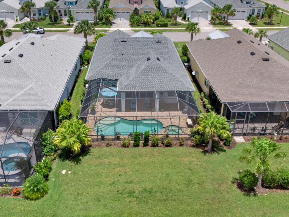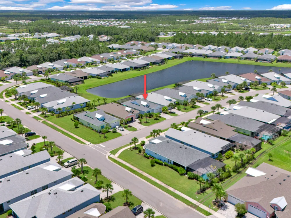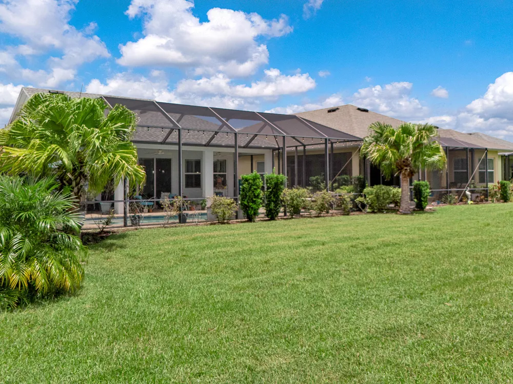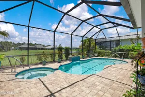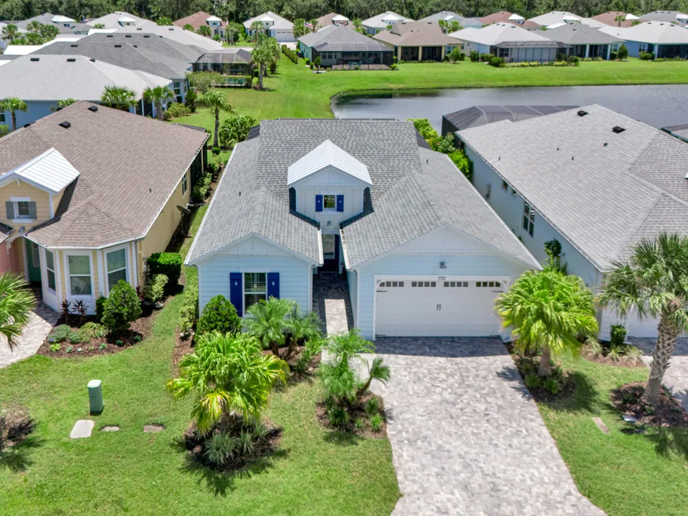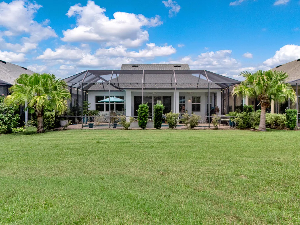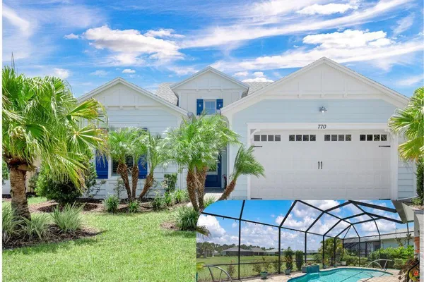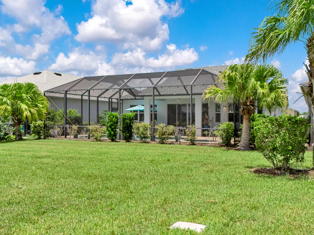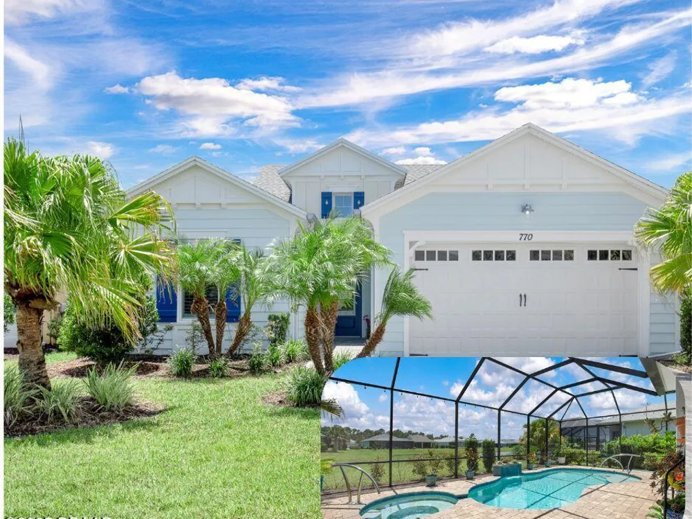 Tropical-inspired Coconut model single-family pool & spa home delivers the ultimate in Florida resort-style living. Heated with gas & has an app to operate. Plank tile flooring flows throughout the common areas, complemented by elegant crown molding & a den/office with double glass doors. The bright, open-concept great room connects seamlessly to a designer kitchen featuring 42'' crown-topped white cabinetry, quartz counters, glass tile backsplash, under & upper cabinet lighting & gas range. Plantation shutters accent the breakfast nook, guest bedroom & den windows, while the laundry room includes custom built-in shelving for added convenience. The spacious primary suite offers a retreat with spa-style bath & walk-in closet, & guest rooms are privately situated. Overhead storage. Step outside to your own paradise with a sparkling pool & spa, expansive paver lanai, & lush tropical landscaping perfect for relaxing or entertaining. 5 star amenities are a golf cart ride away in paradise