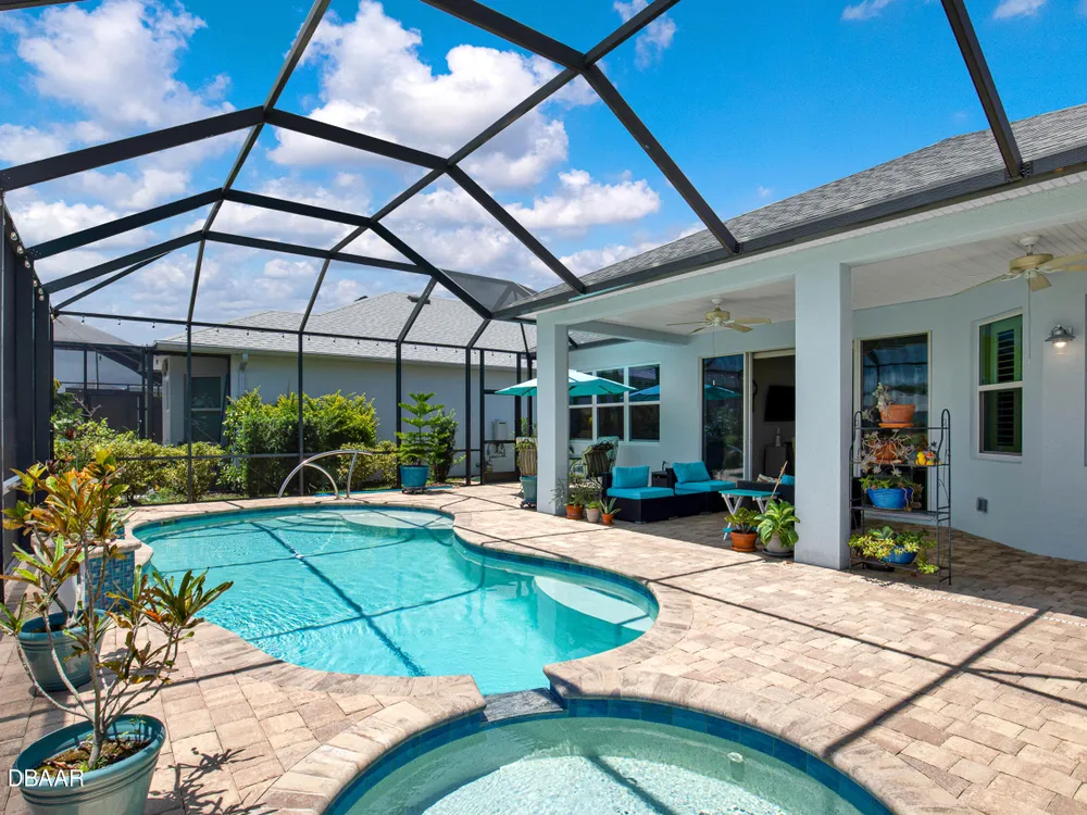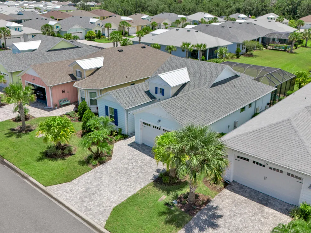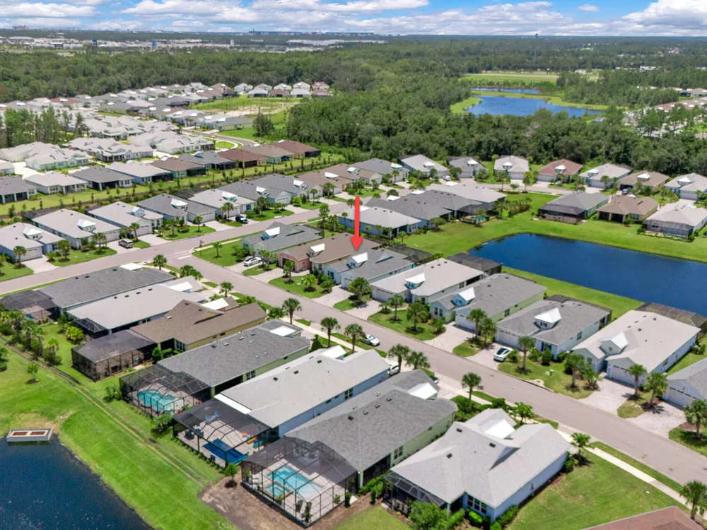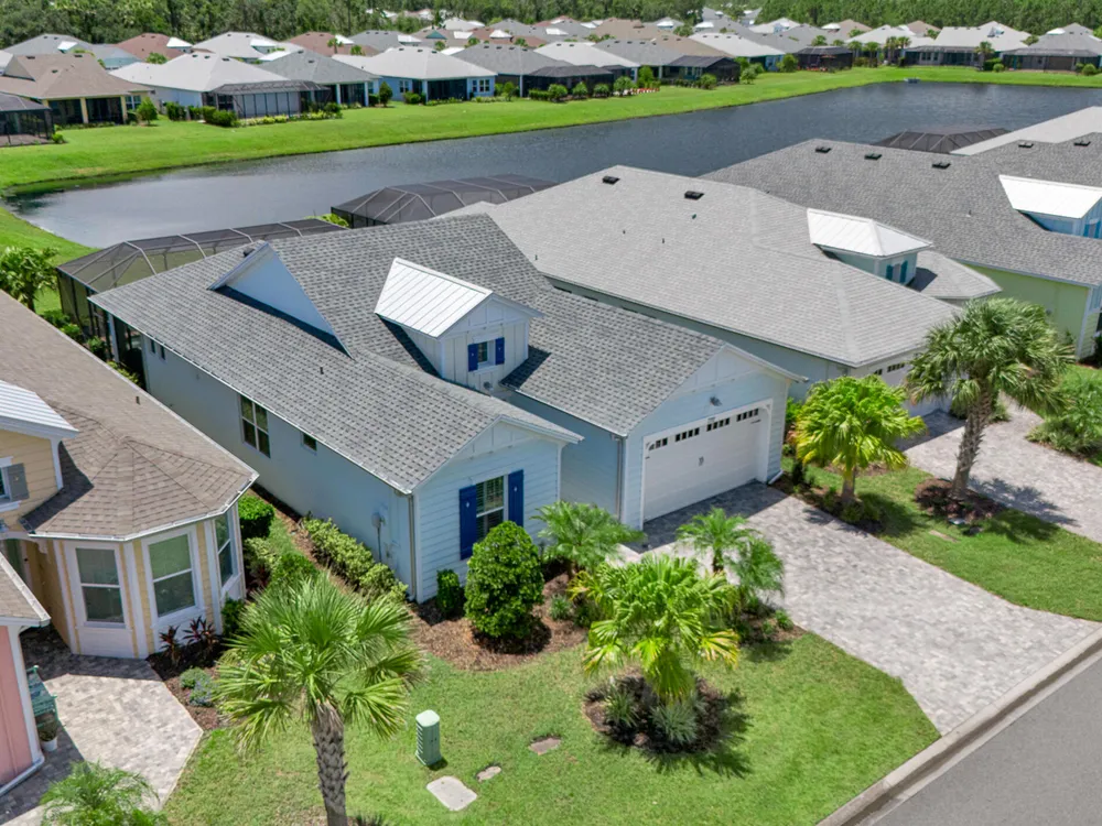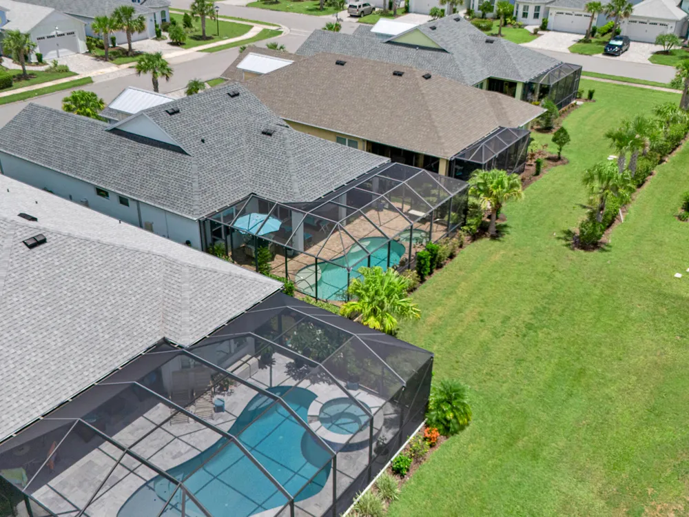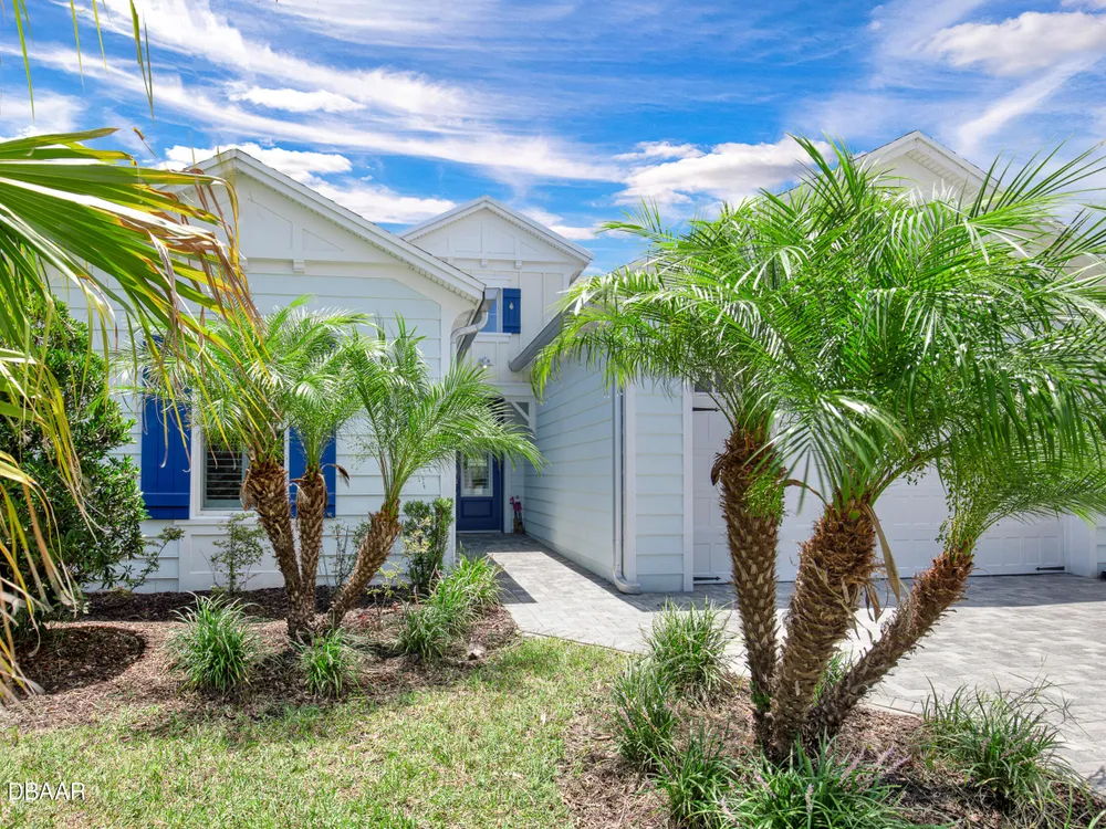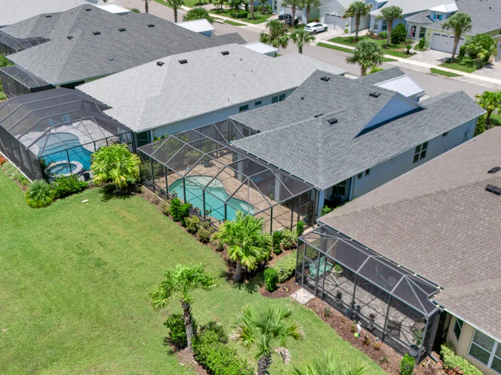 Tropical-inspired Coconut model single-family pool & spa home delivers the ultimate in Florida resort-style living. Heated with gas & has an app to operate. Plank tile flooring flows throughout the common areas, complemented by elegant crown molding & a den/office with double glass doors. The bright, open-concept great room connects seamlessly to a designer kitchen featuring 42'' crown-topped white cabinetry, quartz counters, glass tile backsplash, under & upper cabinet lighting & gas range. Plantation shutters accent the breakfast nook, guest bedroom & den windows, while the laundry room includes custom built-in shelving for added convenience. The spacious primary suite offers a retreat with spa-style bath & walk-in closet, & guest rooms are privately situated. Overhead storage. Step outside to your own paradise with a sparkling pool & spa, expansive paver lanai, & lush tropical landscaping perfect for relaxing or entertaining. 5 star amenities are a golf cart ride away in paradise
