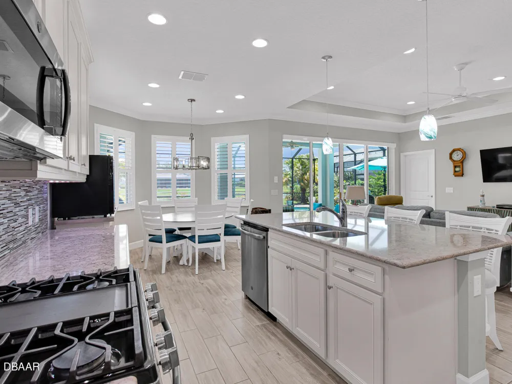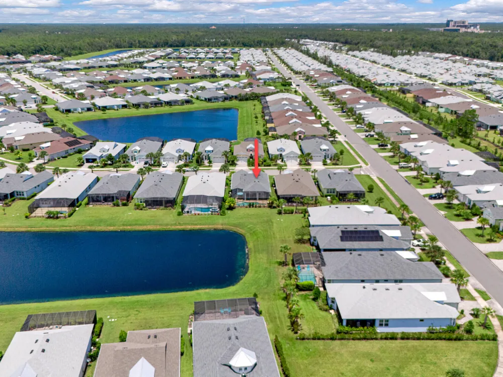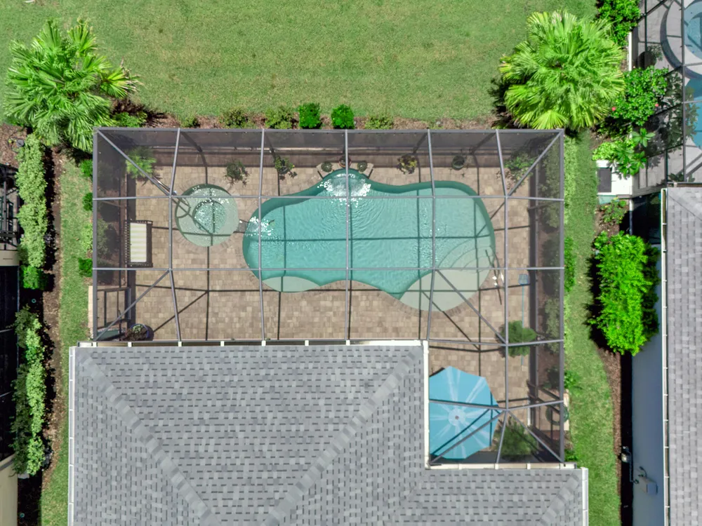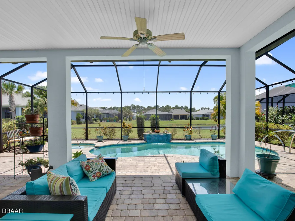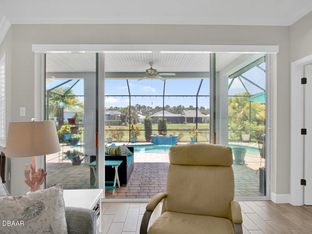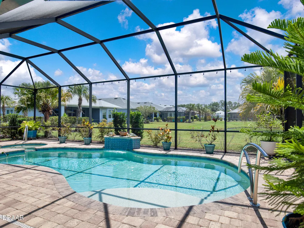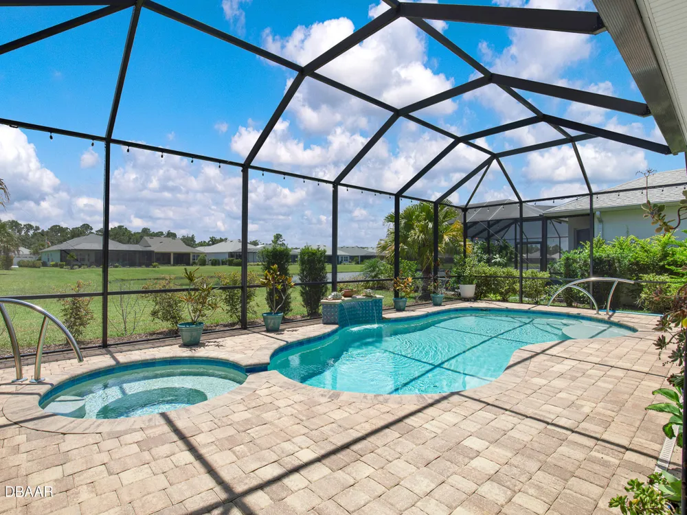 Tropical-inspired Coconut model single-family pool & spa home delivers the ultimate in Florida resort-style living. Heated with gas & has an app to operate. Plank tile flooring flows throughout the common areas, complemented by elegant crown molding & a den/office with double glass doors. The bright, open-concept great room connects seamlessly to a designer kitchen featuring 42'' crown-topped white cabinetry, quartz counters, glass tile backsplash, under & upper cabinet lighting & gas range. Plantation shutters accent the breakfast nook, guest bedroom & den windows, while the laundry room includes custom built-in shelving for added convenience. The spacious primary suite offers a retreat with spa-style bath & walk-in closet, & guest rooms are privately situated. Overhead storage. Step outside to your own paradise with a sparkling pool & spa, expansive paver lanai, & lush tropical landscaping perfect for relaxing or entertaining. 5 star amenities are a golf cart ride away in paradise