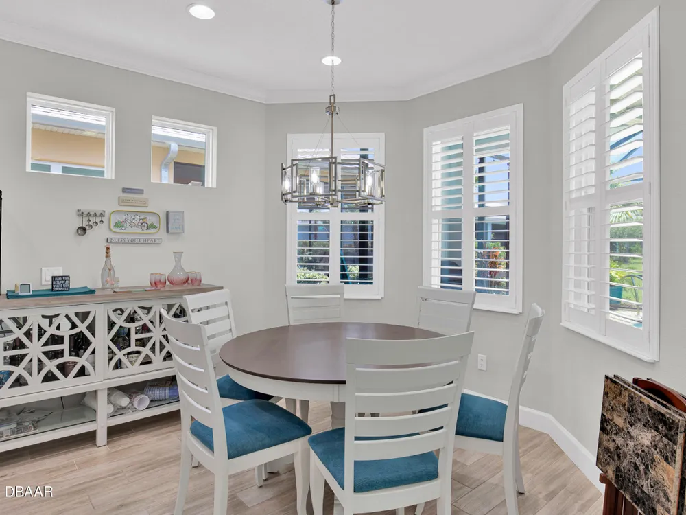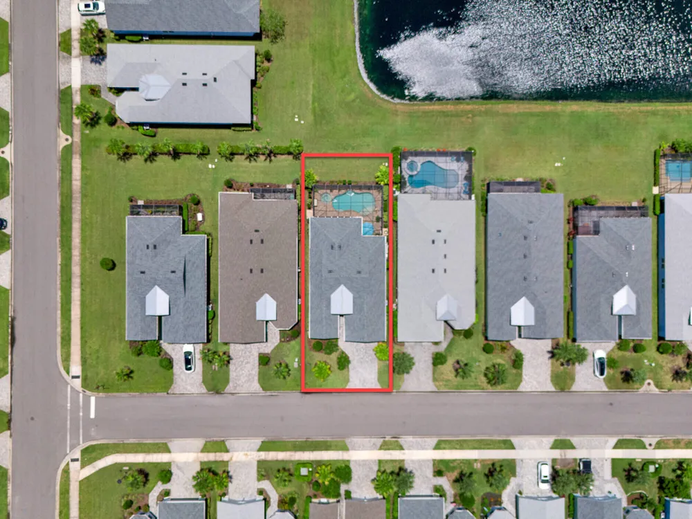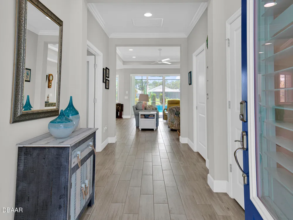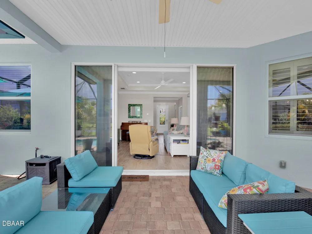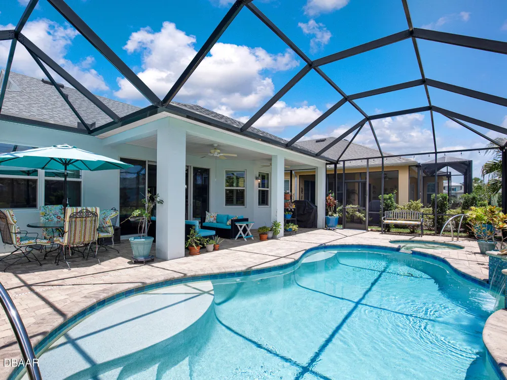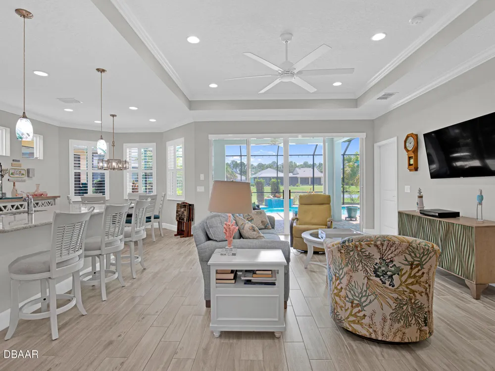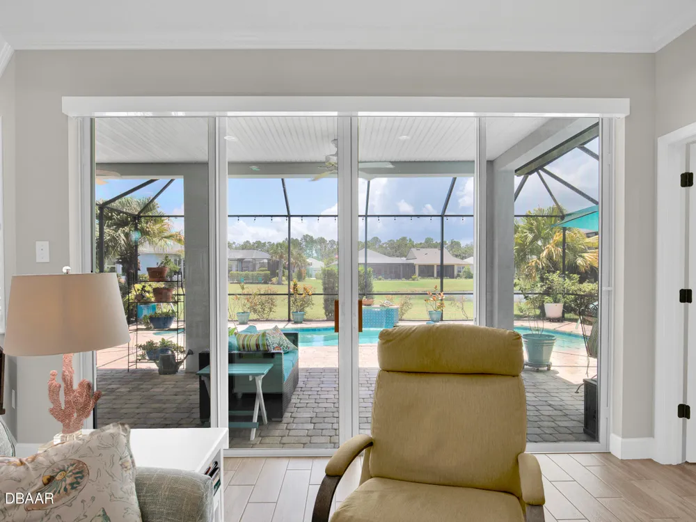 Tropical-inspired Coconut model single-family pool & spa home delivers the ultimate in Florida resort-style living. Heated with gas & has an app to operate. Plank tile flooring flows throughout the common areas, complemented by elegant crown molding & a den/office with double glass doors. The bright, open-concept great room connects seamlessly to a designer kitchen featuring 42'' crown-topped white cabinetry, quartz counters, glass tile backsplash, under & upper cabinet lighting & gas range. Plantation shutters accent the breakfast nook, guest bedroom & den windows, while the laundry room includes custom built-in shelving for added convenience. The spacious primary suite offers a retreat with spa-style bath & walk-in closet, & guest rooms are privately situated. Overhead storage. Step outside to your own paradise with a sparkling pool & spa, expansive paver lanai, & lush tropical landscaping perfect for relaxing or entertaining. 5 star amenities are a golf cart ride away in paradise