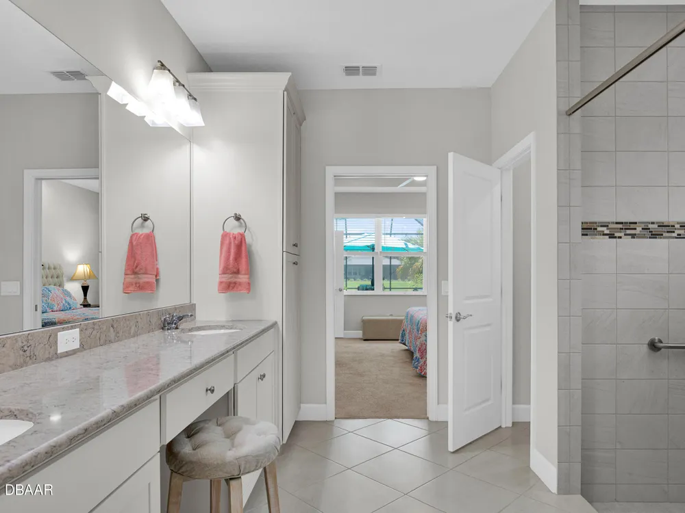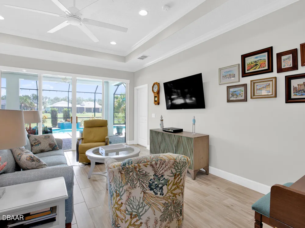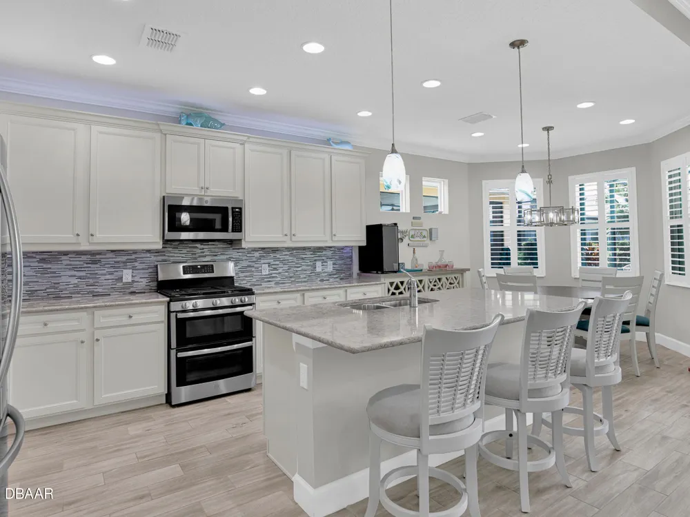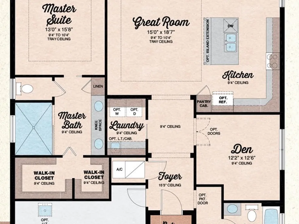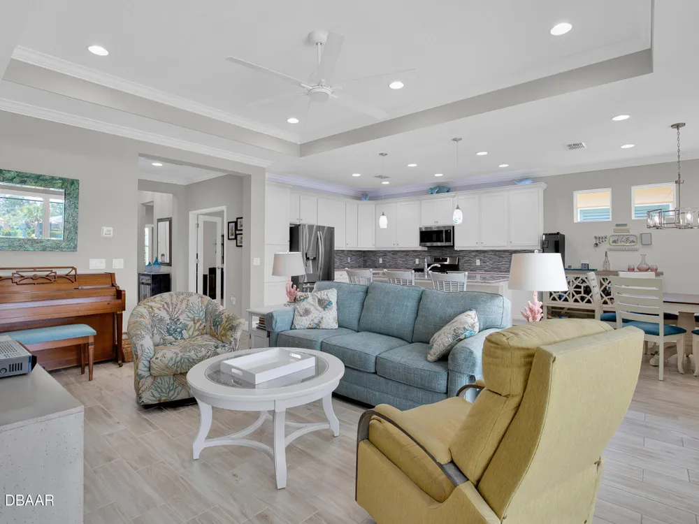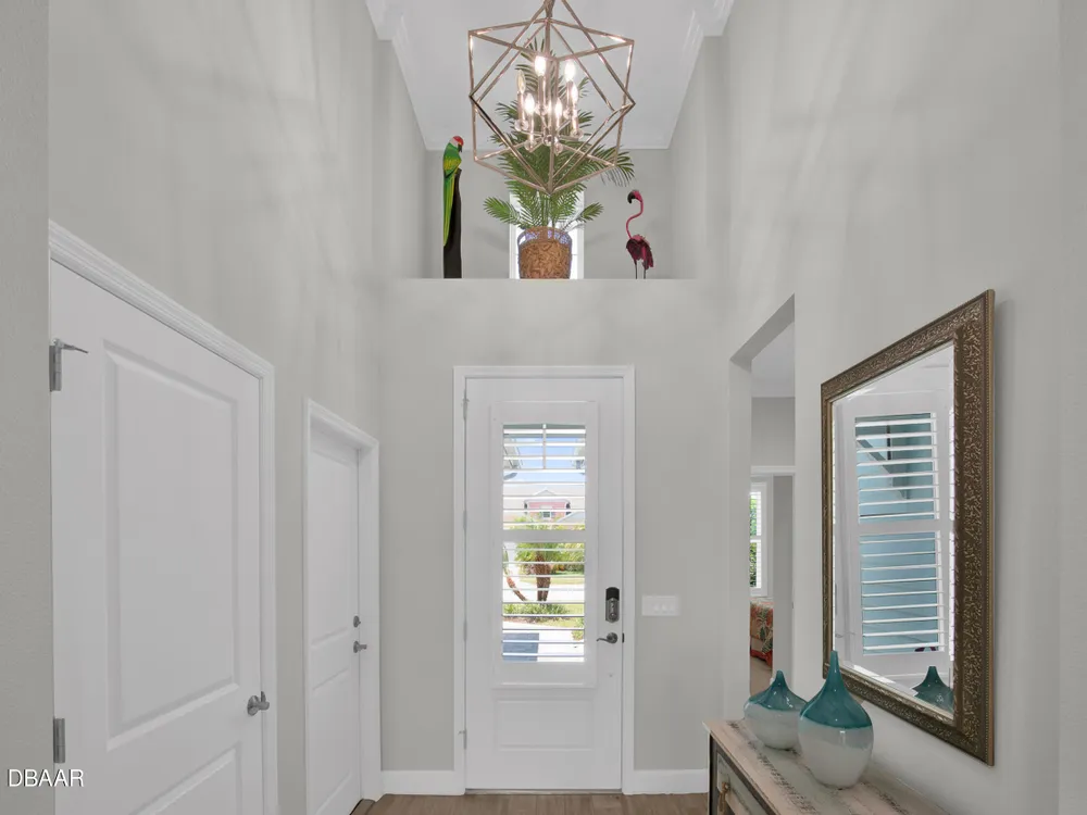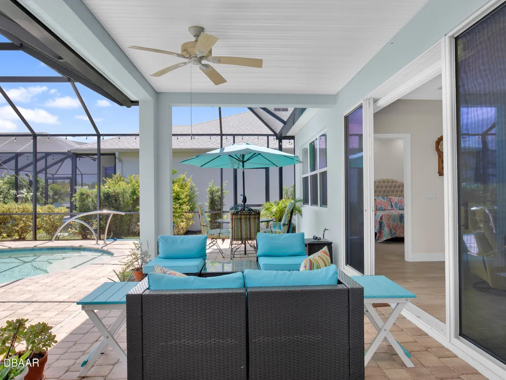 Tropical-inspired Coconut model single-family pool & spa home delivers the ultimate in Florida resort-style living. Heated with gas & has an app to operate. Plank tile flooring flows throughout the common areas, complemented by elegant crown molding & a den/office with double glass doors. The bright, open-concept great room connects seamlessly to a designer kitchen featuring 42'' crown-topped white cabinetry, quartz counters, glass tile backsplash, under & upper cabinet lighting & gas range. Plantation shutters accent the breakfast nook, guest bedroom & den windows, while the laundry room includes custom built-in shelving for added convenience. The spacious primary suite offers a retreat with spa-style bath & walk-in closet, & guest rooms are privately situated. Overhead storage. Step outside to your own paradise with a sparkling pool & spa, expansive paver lanai, & lush tropical landscaping perfect for relaxing or entertaining. 5 star amenities are a golf cart ride away in paradise