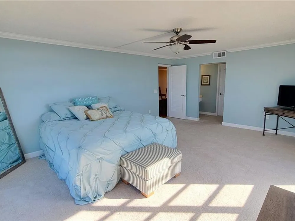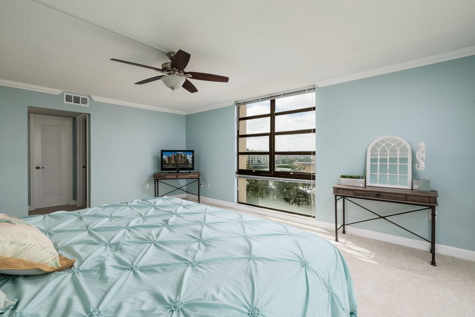 - Ceiling Fan(s), Crown Molding, Eat-in Kitchen, High Ceilings, Living/Dining Room, Open Floorplan, Main Level Primary, Solid-Wood Cabinets, Split Bedrooms, Stone Counters, Thermostat, Walk-In Closet(s), Wet Bar, Window Treatments
