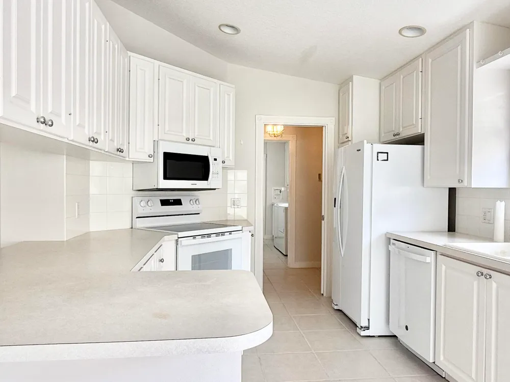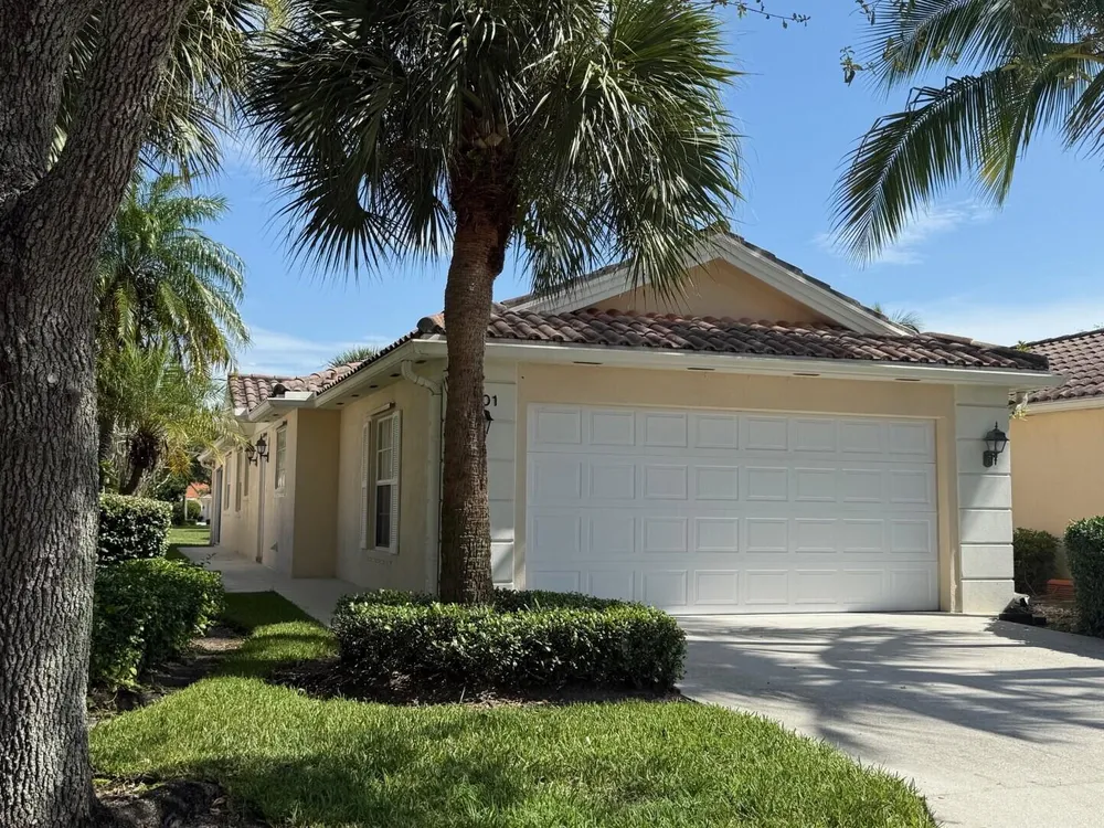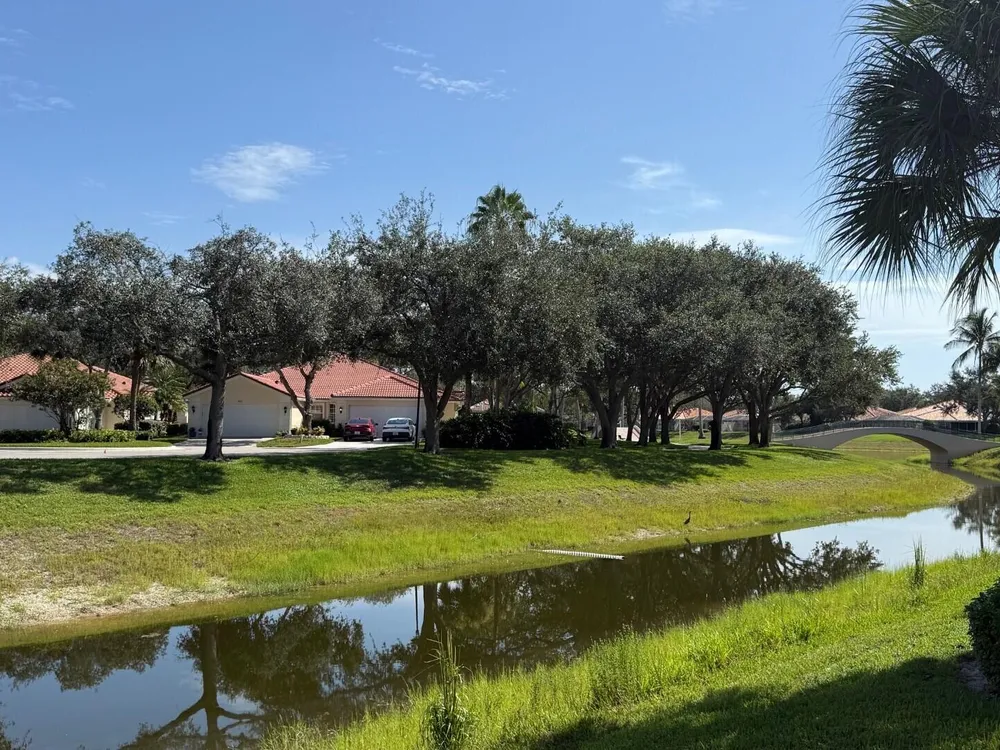Welcome to this stunning villa that blends comfort and style with serene lake and bridge views. Featuring an open floor plan with vaulted ceilings, this home is perfect for entertaining or relaxing in your own private retreat. Highlights include: --Spacious Great Room with custom wall unit and tile throughout the main living areas -Brand-new luxury plank vinyl flooring in both bedrooms-Principal suite with a large walk-in closet, en suite bath with double vanity, and walk-in shower-Guest bedroom with private bath, shower/tub combo, and walk-in closet -Lanai with sliding glass doors, creating a bright sunroom to enjoy year-round -Private backyard offering peace and privacyModern updates include a new AC (2022), brand-new GE oven/range, central vacuum system