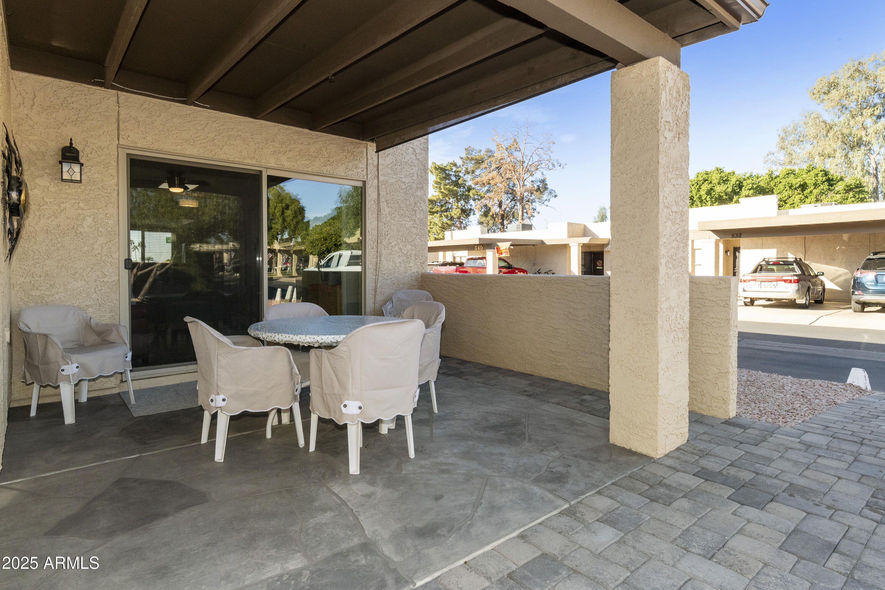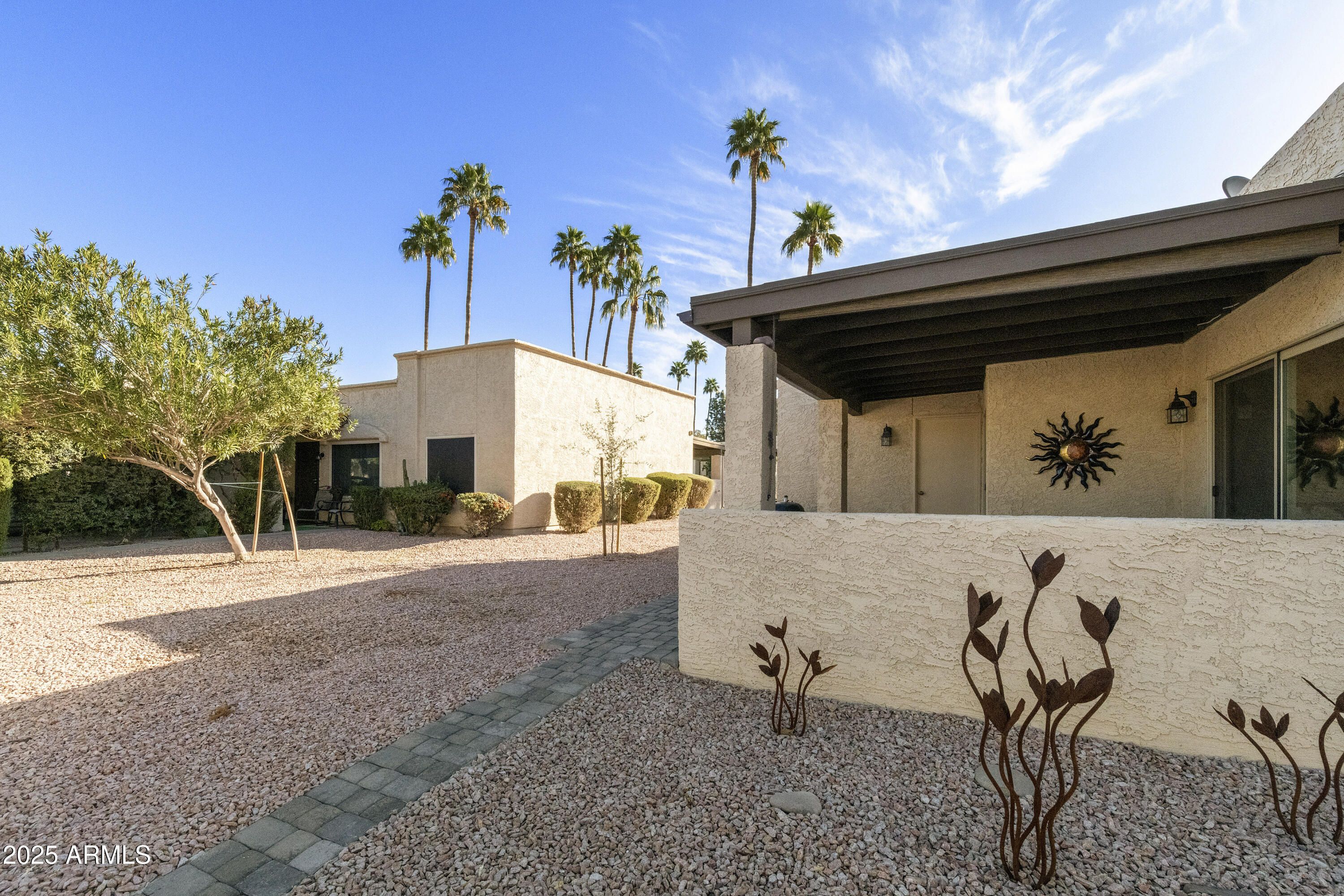Step into this beautifully updated, move-in-ready end unit in the highly sought-after 55+ community of Fountain of the Sun—offering the perfect blend of comfort and convenience. This light and bright home features a split-bedroom floor plan with a spacious master suite that includes a walk-in closet and private patio access. Interior highlights include tile flooring (2017), a spacious dining area, and a modernized kitchen (2021) with refrigerator, built-in microwave, oven, dishwasher, and disposal. The washer and dryer are conveniently located just outside the back door. Upgrades include a newly updated bath (2024), new HVAC unit (2023), new doors and hardware (2018), new lighting (2021), and freshly installed pavers (2025) in the front and back. CLICK MORE... Dual-pane, low-E vinyl windows add energy efficiency. Relax on the covered back patio overlooking the newly finished chipped granite yard, with desirable north/south exposure and a one-car carport. Sorry, this is a NO Pet area! Convenient to the US 60 and Red Mountain freeways, close to the Mesa Gateway Airport, Sky Harbor, and Costco! If shopping & dining out is your thing...Superstition Springs & San Tan Mall are a short drive away. Enjoy the Country Club & Golf Community offering a lake, and golf course. Lots of planned activities, pickleball, BOCCE, Fitness, billiards, library, horseshoes, arts & crafts, card room, shuffleboard, and more! Birdie's restaurant opened daily!