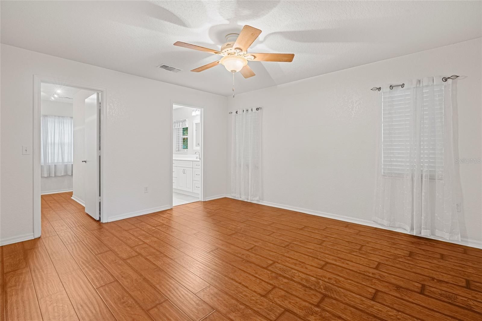 - Ceiling Fan(s), Main Level Primary, Solid Surface Counters, Split Bedrooms, Stone Counters, Thermostat, Window Treatments
