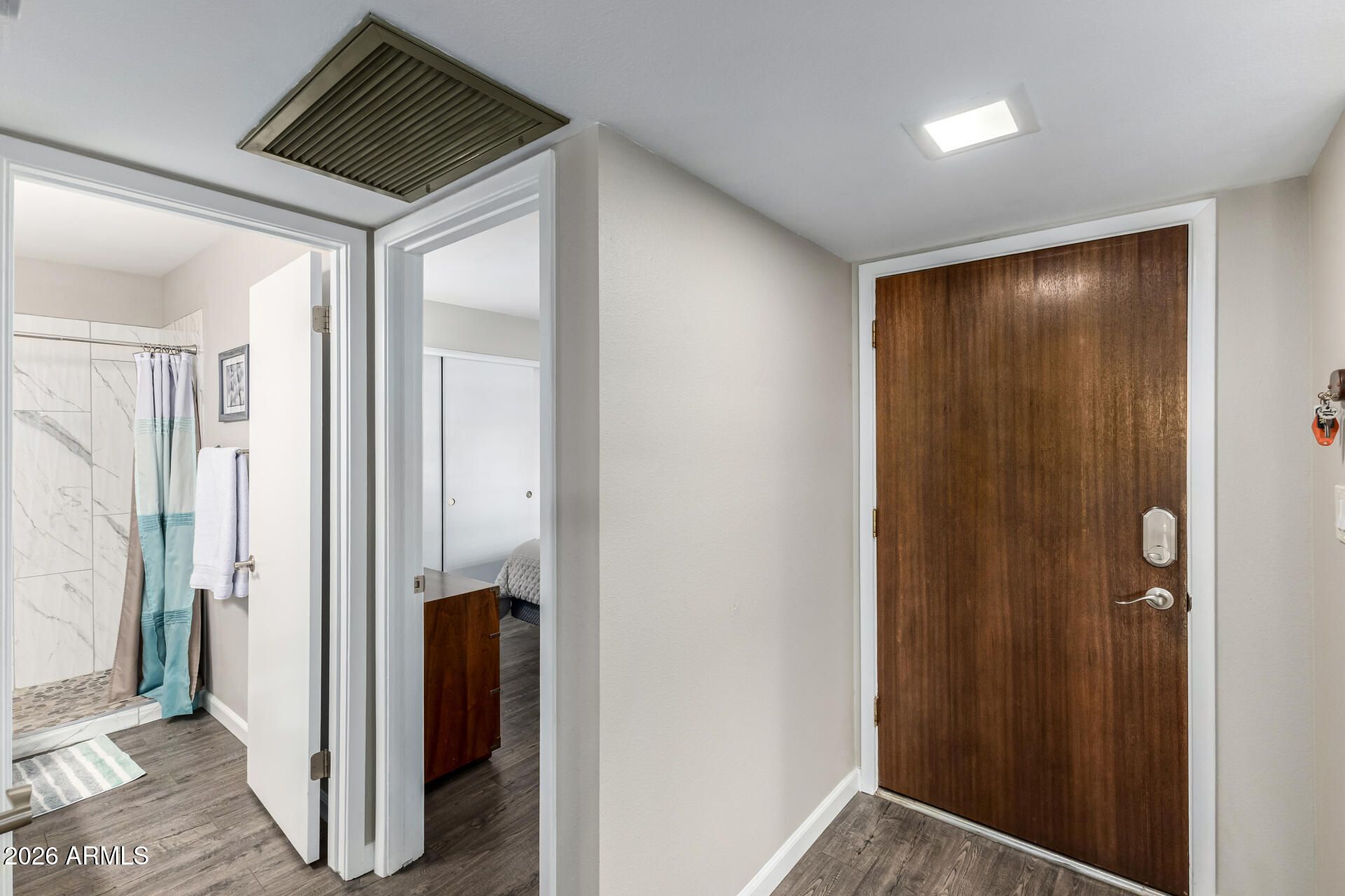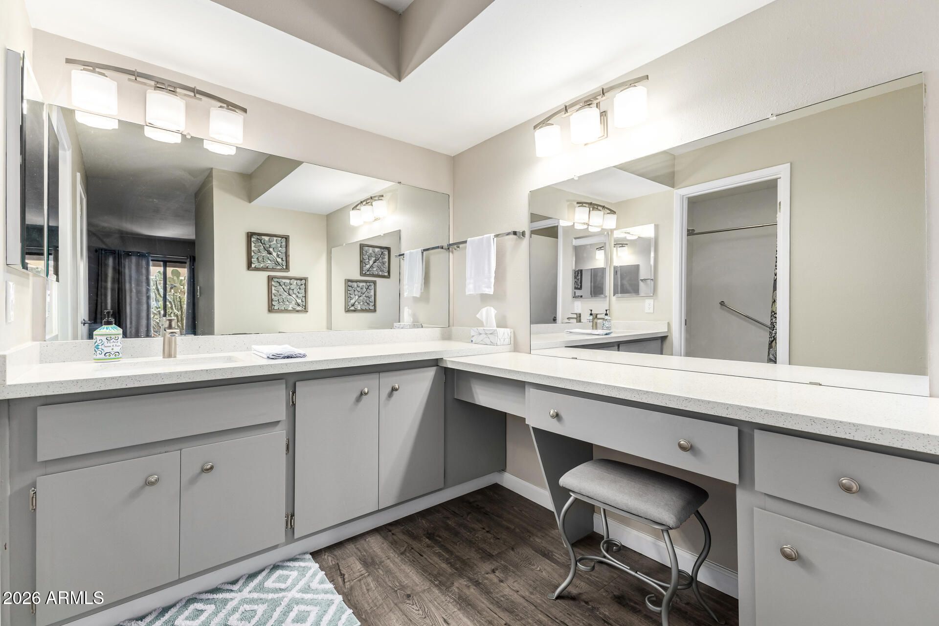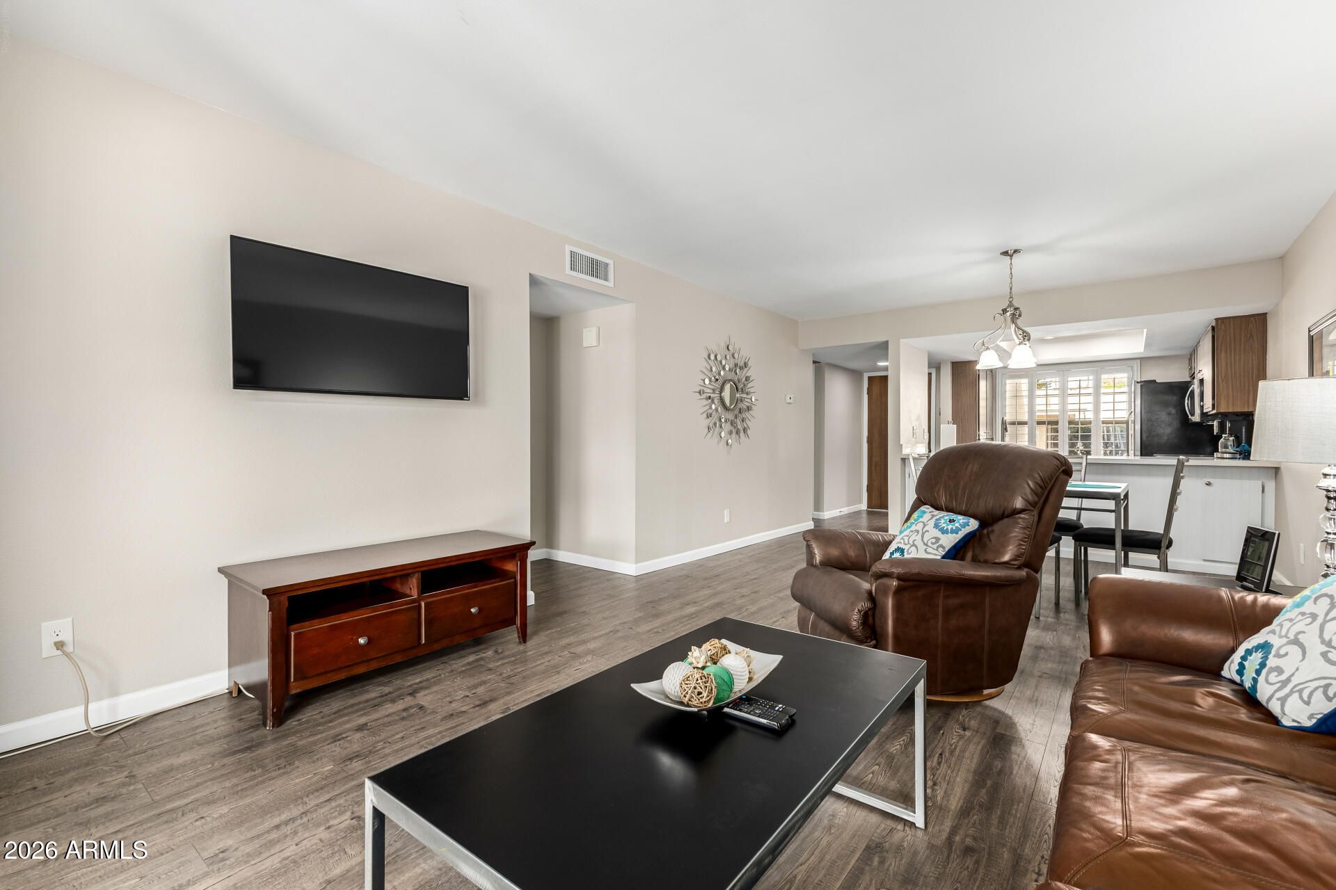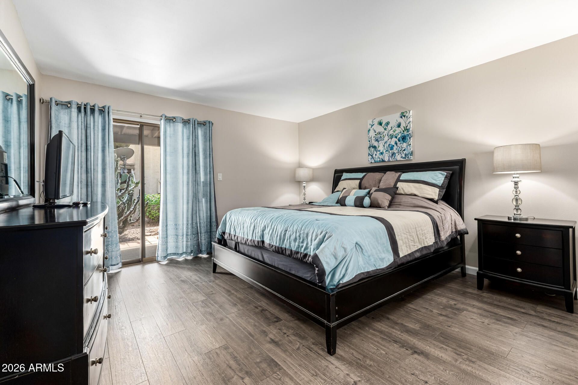 Embrace comfort and convenience in this updated 2-bedroom townhome with carport parking! Check out the perfectly flowing living & dining room, featuring LV wood-look flooring throughout. These tons of natural light, neutral tone, and sliding glass doors create a seamless indoor-outdoor living experience. Spotless kitchen comes with recessed lighting, almost new stainless steel appliances, sparkling white quartz counters, and a breakfast bar. Venture to the sizable primary bedroom, offering direct outdoor access and a private bathroom with a make-up desk. PLUS! A front-loading washer and dryer are included. Unwind under the covered south patio, an inviting space to relax. Take advantage of the exceptional Community amenities. Hurry! Super clean and move-in ready!