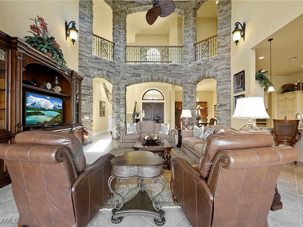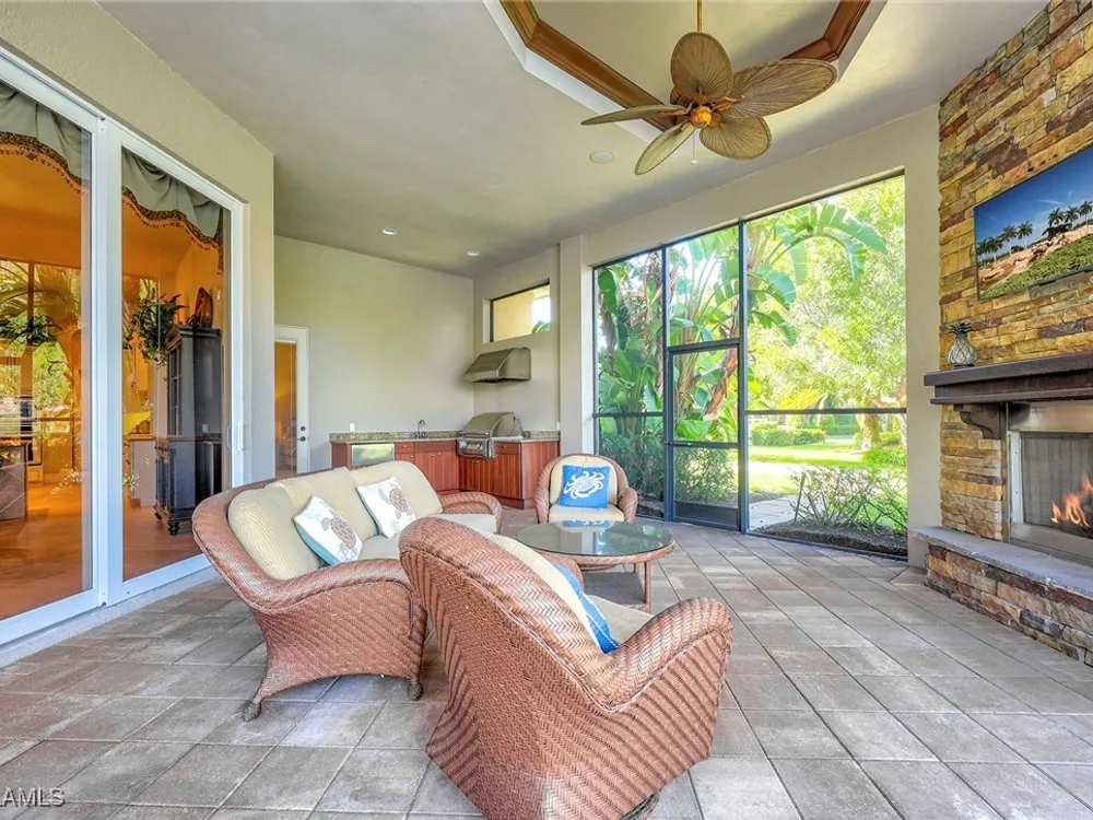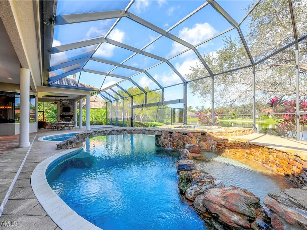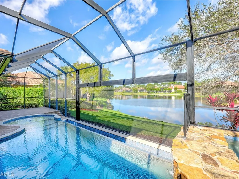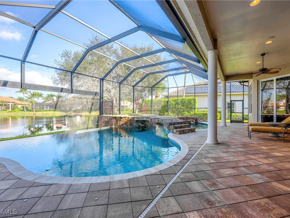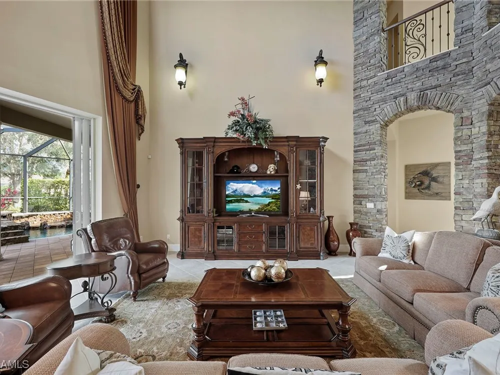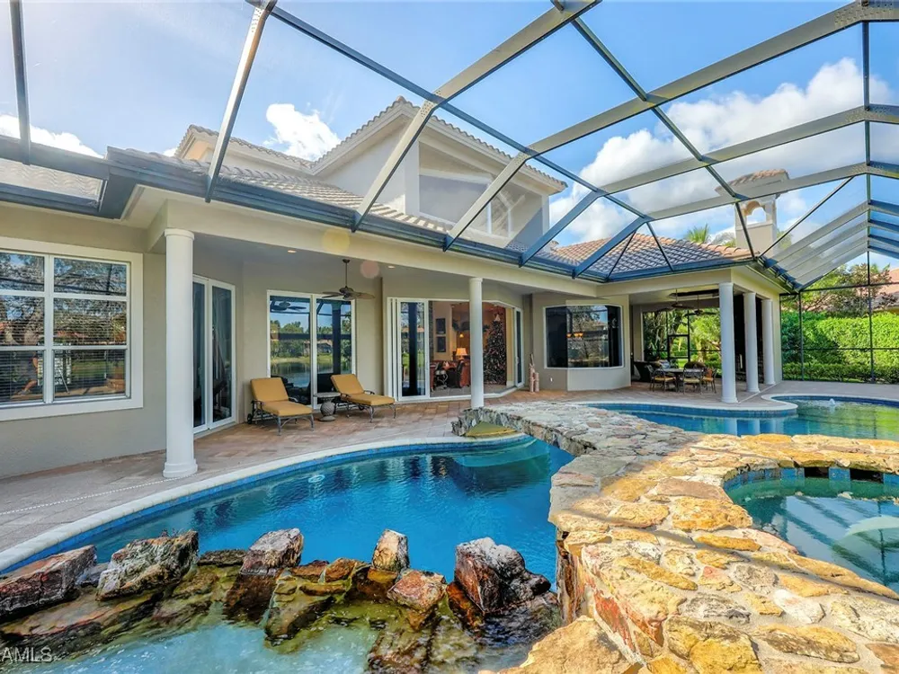 Uncover refined luxury in this exquisitely designed custom estate, crafted by Lundstrum Development Corporation. Situated within the prestigious guard-gated Classics Plantation Estates at Lely Resort, this breathtaking residence commands attention. Set on a generous corner lot with expansive lake frontage, it seamlessly blends sophistication with tranquil outdoor living. This architectural gem offers five bedrooms, a versatile den, four full bathrooms, and an expansive four-car garage. Elevated with premium upgrades, including granite countertops, elegant crown molding, a cozy gas fireplace, and a fully equipped outdoor kitchen. Retreat to your private sanctuary, featuring a gas-heated negative edge pool, a raised spa, and a picturesque bridge.The 23-foot volume ceilings add grandeur, while oversized walk-in closets and an outdoor balcony enhance the living experience. Enjoy IMMEDIATE ACCESS to the Players Club & Spa, renowned for its resort-style amenities. Embrace the lifestyle of Lely Resort, where three championship 18-hole golf courses await, ensuring a balance of leisure and recreation. This is more than a home, it's a sanctuary for those seeking the pinnacle of upscale living.