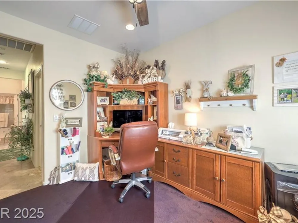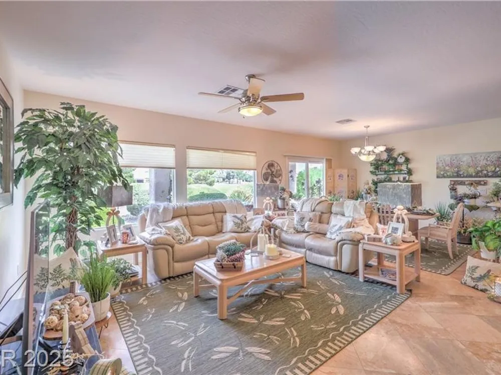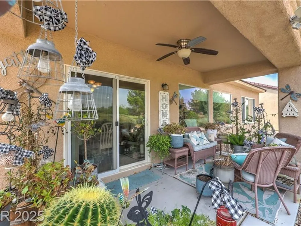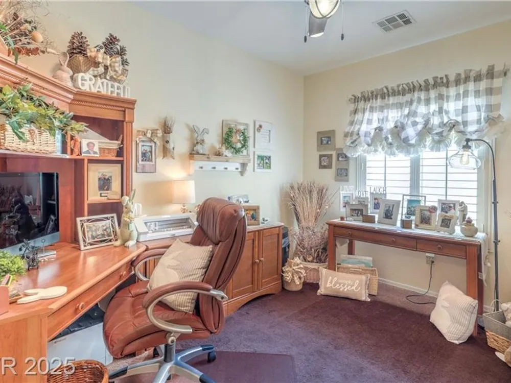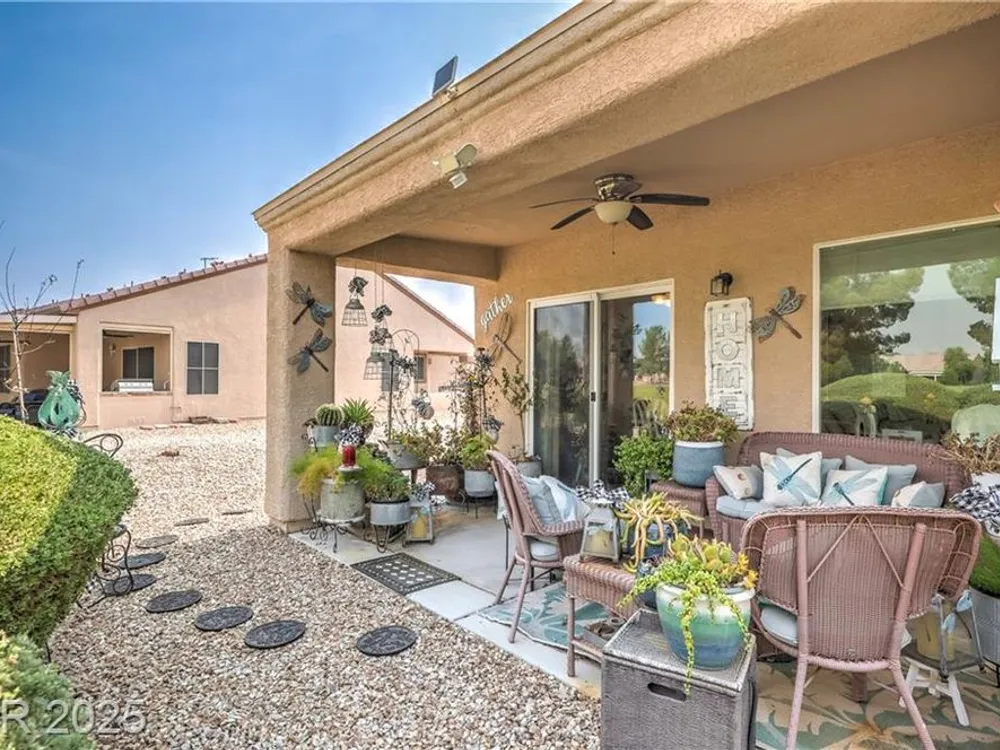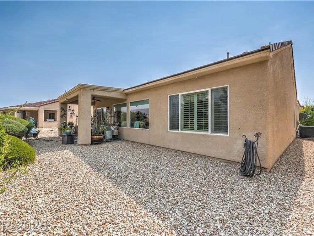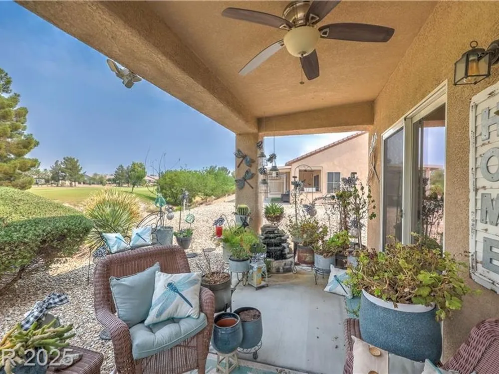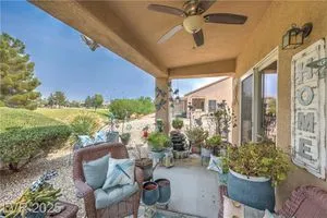 Beautiful single-story home located on the Golf Course of Sun City Aliante. This 2-bedroom, 2-bath home features a great floorplan with a den/office, lighted ceiling fans, window shutters in most rooms, and recessed lighting throughout. The spacious primary bedroom has diagonally laid blonde hardwood flooring, a large walk-in closet, crown molding with decorative soft lighting, an oversized shower, and double sinks. Terrazzo flooring is in the common areas. A very nice kitchen with an R/O sys, granite counters that overlook the dining area and living room. The dining area leads to a beautiful backyard with a covered patio and amazing views of the golf course. A separate laundry room is located to the garage. New 15 Seer A/C installed May 2024 with a 10-year all parts warranty. Aliante highlights: swimming pool, spa, sauna, computer room, full social calendar, tennis, pickleball, and more. Great location with Aliante Casino, shopping, dining, entertainment, and access to the interstate.