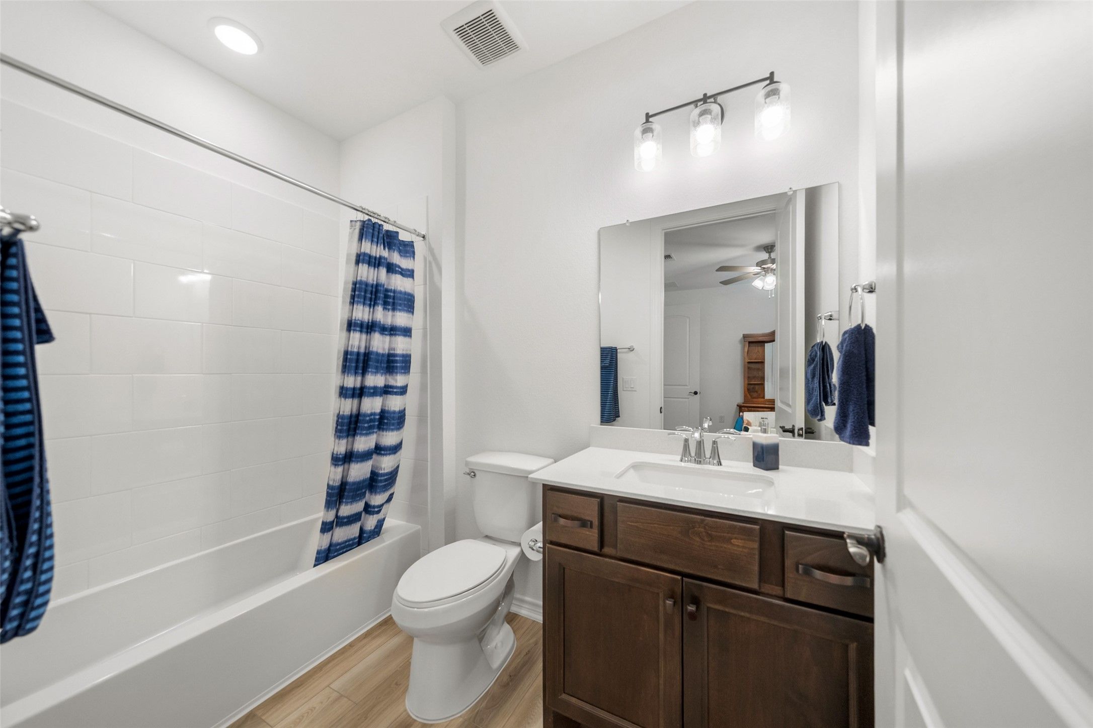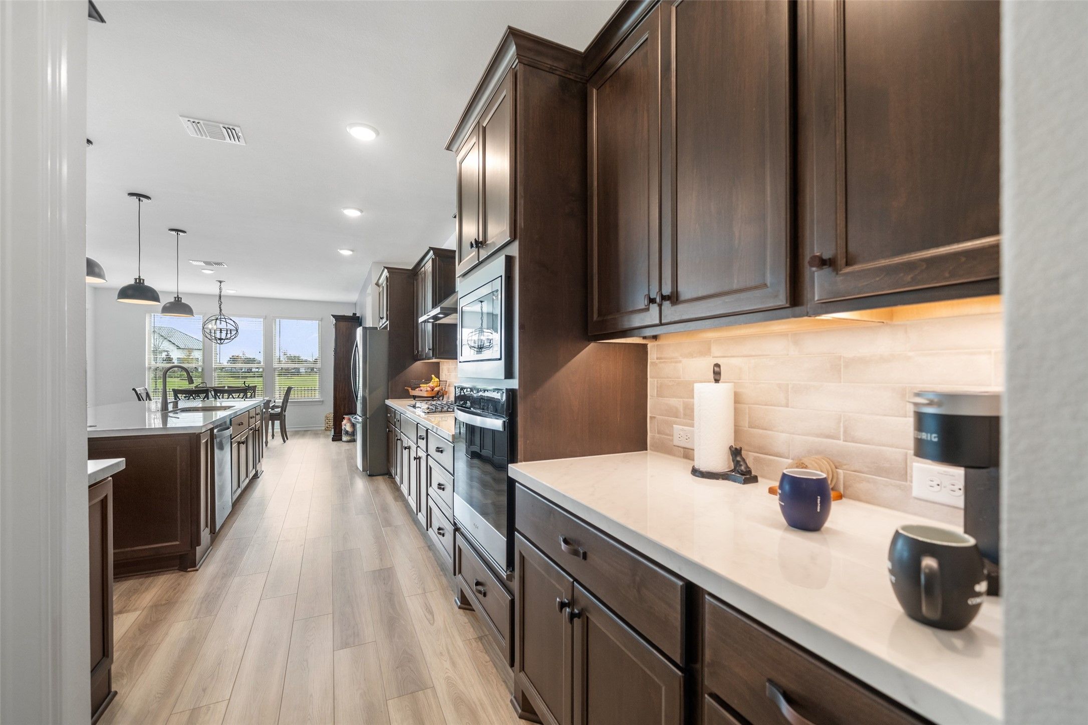 Don’t wait on new construction—this like-new home is move-in ready and perfectly positioned on a waterfront lot in the sought-after Del Webb Fulshear 55+ Active Adult community. Featuring the larger Echelon Renown floorplan, the home offers 3 bedrooms, 3 full baths, plus convenient guest half bath. Thoughtful upgrades abound, including ebony-stained alder cabinetry, Dekton Silestone countertops throughout, ceiling fans, black pendant lighting, extended garage, back gate access. The open-concept kitchen showcases stainless steel appliances, gas cooktop, upgraded backsplash, soft-close cabinets/drawers, walk-in pantry, oversized island, and seamless flow to the gathering areas. The primary suite includes an en-suite bath with walk-in shower and dual walk-in closets. Residents enjoy resort-style amenities including a clubhouse, fitness center, indoor lap pool, outdoor pool, putting green, six pickleball courts, an on-site Lifestyle Director, & a calendar full of social activities.