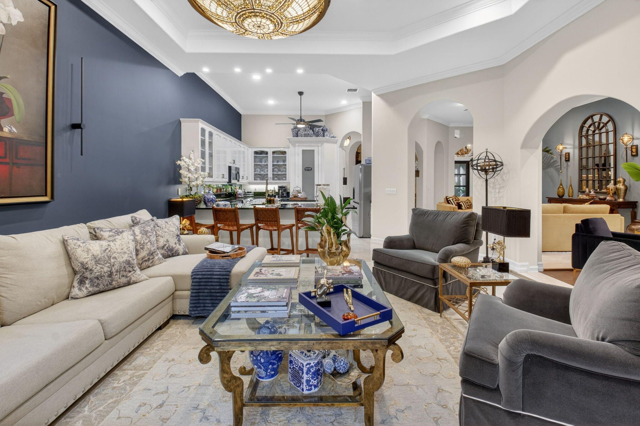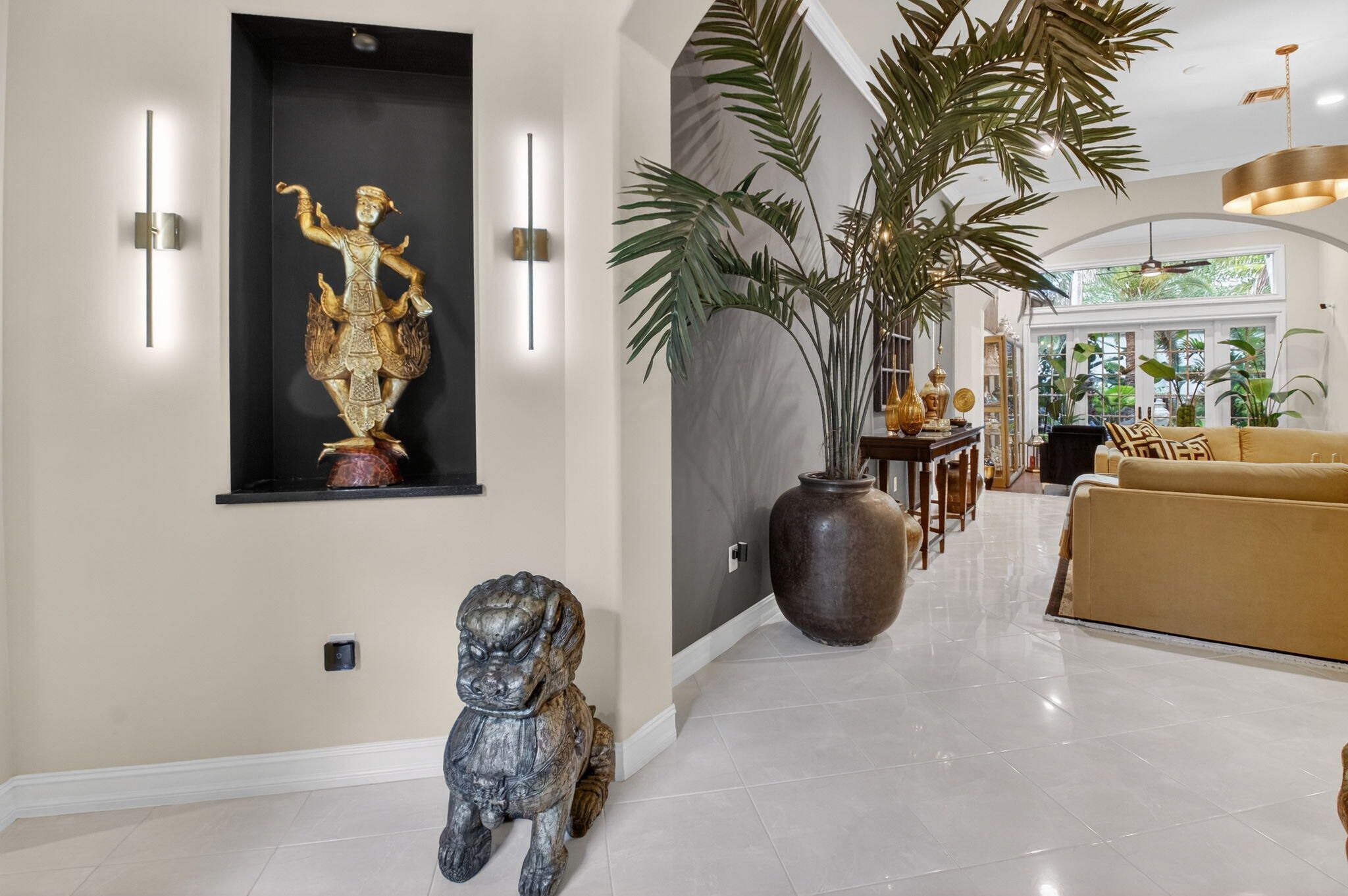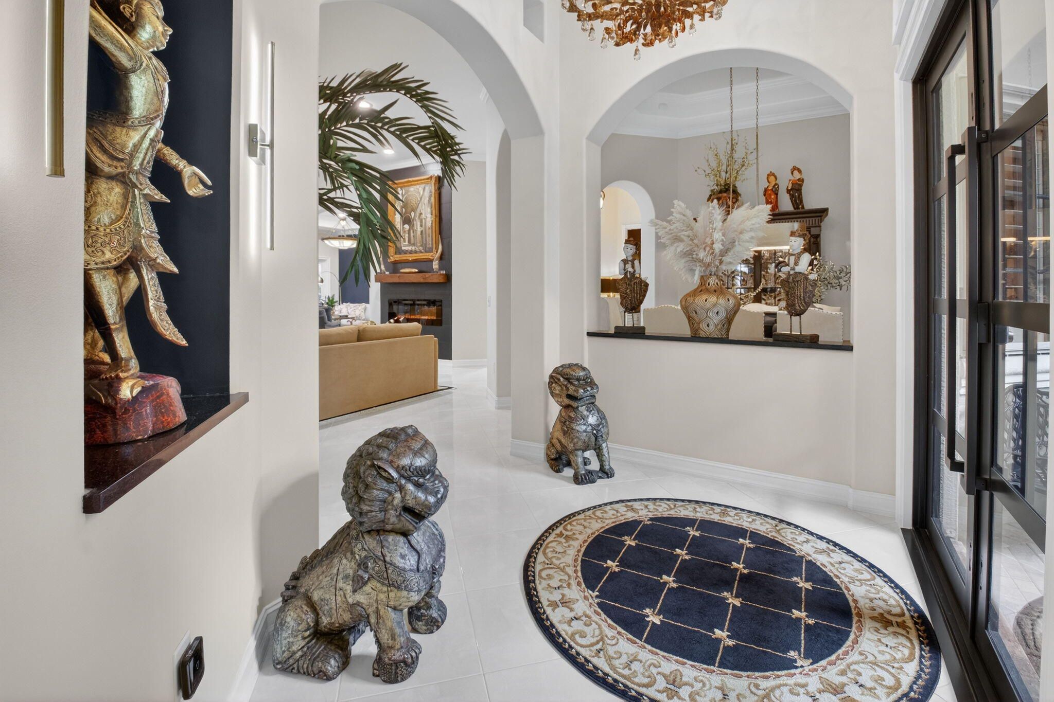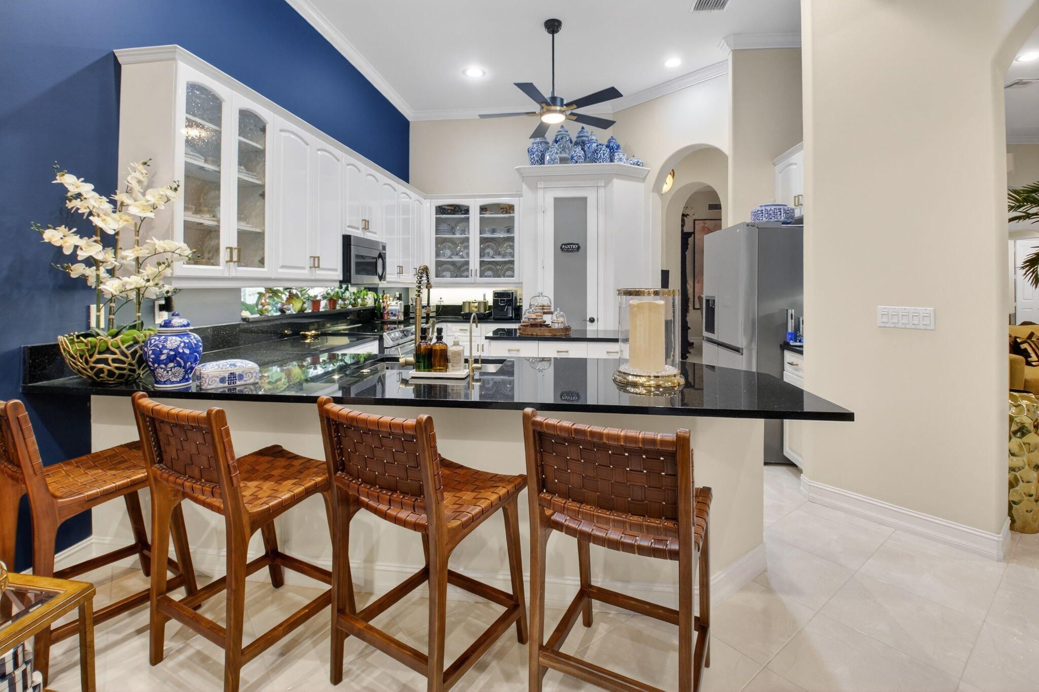 Experience a truly one-of-a-kind residence where exceptional craftsmanship and thoughtful upgrades are showcased in every room. No detail was overlooked and no expense spared in customizing this home for maximum comfort, functionality, and style. Surrounded by lush, professionally designed landscaping, the property offers striking curb appeal and an equally impressive interior. Step inside the private gated entry to discover soaring ceilings, elegant crown molding throughout, and a bright, open layout designed for both everyday living and gracious entertaining. Hurricane-impact doors and impact windows in the primary suite provide peace of mind, while a whole-house water treatment and filtration system enhances daily living. The chef's kitchen is a standout centerpiece and perfectly designed for culinary enthusiasts, featuring granite countertops, stainless-steel appliances, double oven, a large pantry, abundant cabinetry and drawers, a generous food-prep island, snack bar seating, and instant filtered hot water at the sink. The expansive primary suite is a private retreat, complete a large tray ceiling, custom-fitted dual closets, and a custom linen closet leading to a luxurious ensuite bath with dual sinks, granite vanity, Roman tub, and walk-in shower. A split floor plan provides privacy, with two spacious guest bedrooms and a beautifully appointed full guest bath with custom vanity. Designed for entertaining, the home offers a formal dining room, an elegant living room with accent fireplace, a comfortable family room, and a bonus entertainment area. An additional half bath and a well-equipped laundry room with top-of-the-line front-loading washer and dryer add convenience. The garage includes an additional refrigerator/freezer for extra storage. Step through the French doors to your private tropical oasis, where retractable awnings on both doorways allow for year-round enjoyment of the serene outdoor setting in sun or shade. This exceptional home offers countless additional upgrades and refined touches. It provides a rare opportunity to own a truly distinctive property. Tivoli Reserve is a scenic gated community with a guard on duty 24/7. The quarterly maintenance fees include lawn maintenance, power washing of the roofs, exterior painting of the homes, cable service and more! The Tivoli Club has an Activities Director to assist in planning a full array of activities. Resort-style heated swimming pool with sun deck and covered terrace, pickleball and four lighted Har-Tru tennis courts. Inside the complex is a top-of-the line fitness center with treadmills, recumbent bicycles, ellipticals, weight machines and free weights. There are two card rooms, a library, arts & crafts room, billiards, computer room with desktop computers for residents' use, media room, social room and gathering hall with a piano, bar and kitchen facilities. With an assortment of clubs (including a Pickleball club), you will never be bored! Close to I-95 and the Florida Turnpike, and just a short drive to fine restaurants, movie theaters and shopping.