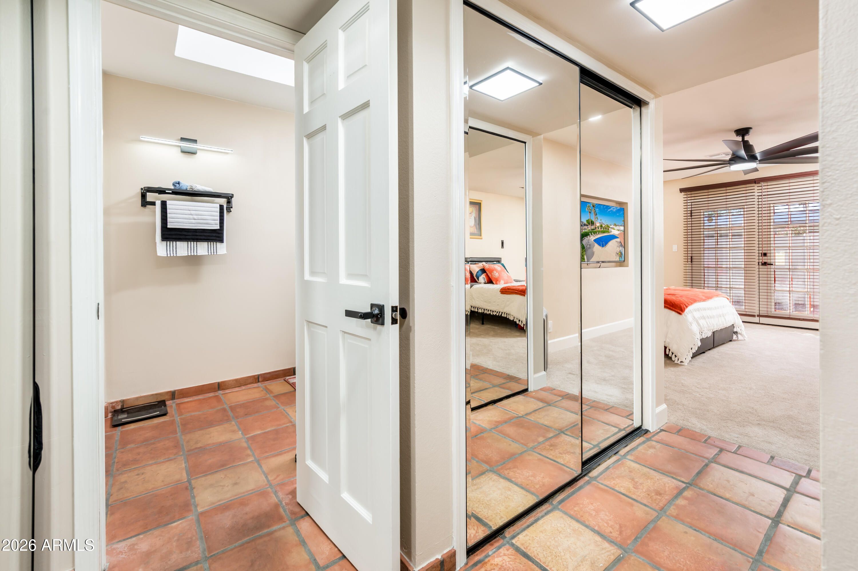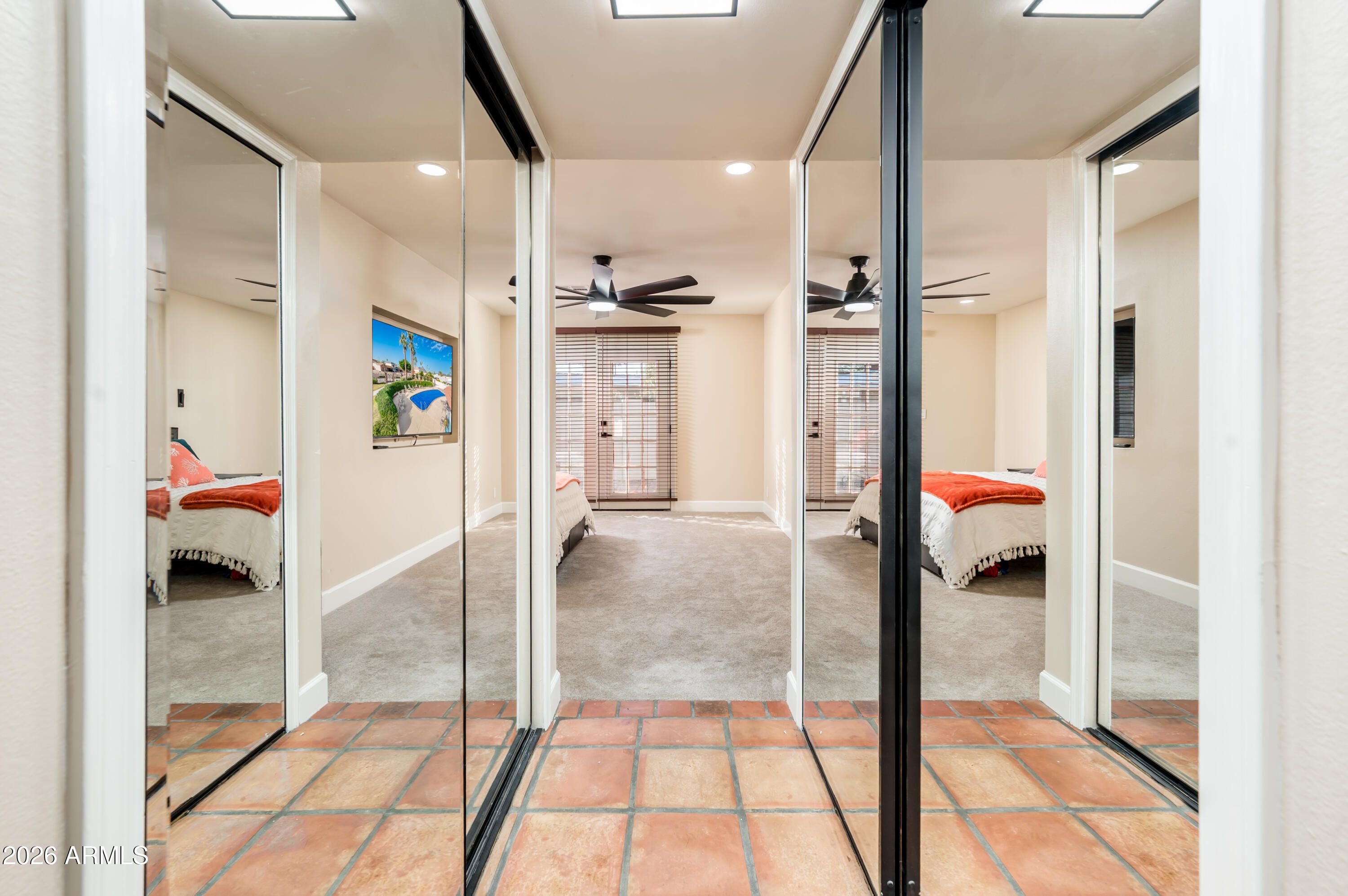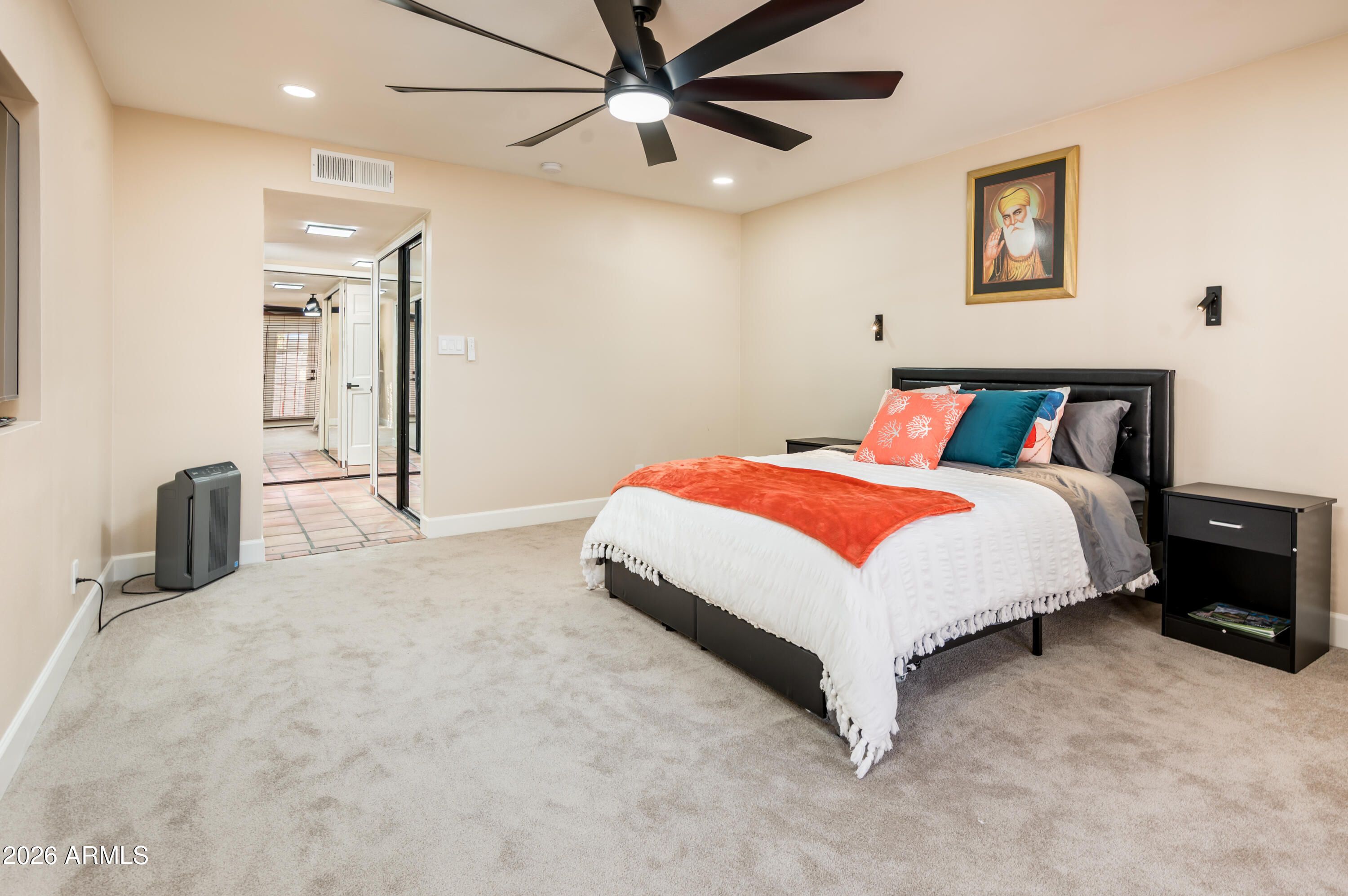 Welcome to this updated property located in the highly sought-after retirement community (55+ age requirement) and historic destination of Villa Monterey. This beautiful home is situated on a desirable corner lot with a larger-than-average size and features a side gate for added convenience. The property boasts a bright, airy open floor plan, thanks to numerous windows, French doors, skylights, and recessed lighting, all complemented by neutral paint colors. It includes two bedrooms, two bathrooms, a separate living room, a family room, a formal dining area, and a covered parking area that accommodates two vehicles. Recent improvements include a newly installed roof (living room), the remaining of the roof recoated, a five-ton gas package air-conditioning unit, and high-efficiency LG gas appliances, including a stove, water heater, and stackable washer and dryer. Both bathrooms have also been freshly updated, including sewer/plumbing lines, and the outdoor sewer line has been replaced. The kitchen features an island with space for bar stools, quartz countertops, and a reverse-osmosis system. You'll find a combination of carpet and tile flooring, and ceiling fans. The kitchen refrigerator, washer, dryer, and both attached TVs are included in the sale. The front and backyards are easy to maintain, featuring a desert landscape adorned with many rose bushes. Don't miss the beautiful custom iron front door. Expansion potential as the HOA/City approved plans to extend the east and north walls for a larger enclosed backyard. Additionally, the property is conveniently located across the street from the private community pool. Situated in a desirable Scottsdale location, this home is near Old Town Scottsdale, spring training baseball, Scottsdale Fashion Mall, ASU, freeways, parks, golf courses, bike paths, restaurants, and Talking Stick Casino.