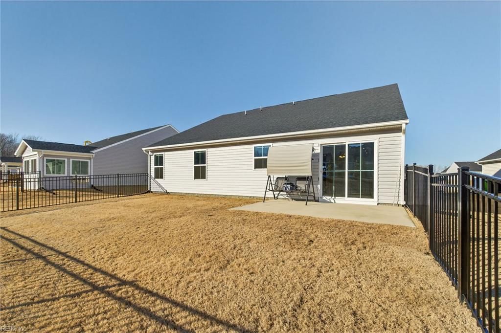 Why wait a whole year to build when you can move into this immaculate, just like new, hometoday. One story, ranch/patio style home with no steps. Low-maintenance living with noyard work. Wonderful, open floor plan. Spacious family room with wood style flooring is open toa bright dining area & a gorgeous kitchen with a center island, white shakercabinets, quartz countertops, stainless appliances & a walk-in pantry. King size primarysuite with attached full bathroom with double vanity sinks, tile walk in shower & a huge walk incloset. 2 additional bedrooms and a full tile bathroom are located on the opposite side of thehome. Large laundry room with a wash tub sink. Fully fenced in backyard with a back patio area. 2car garage with automatic opener. Warm gas heat. Gas tankless hot water heater. Top-of-the-line amenities. 2 pools, fitness center, library, grilling area, walking trails, pickleball, tennis courts & 2 luxury club houses. Some photos are staged.