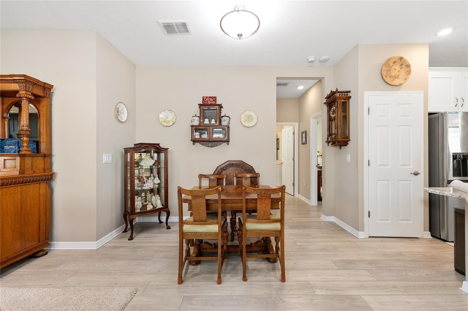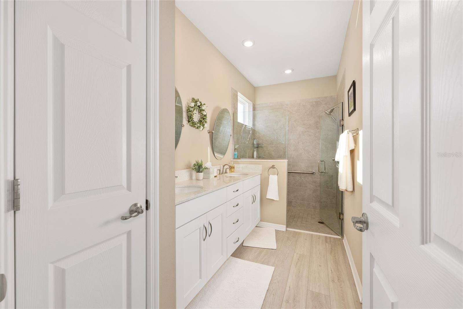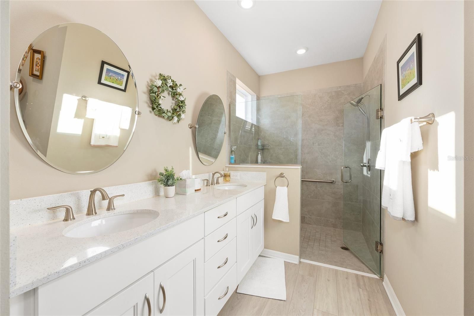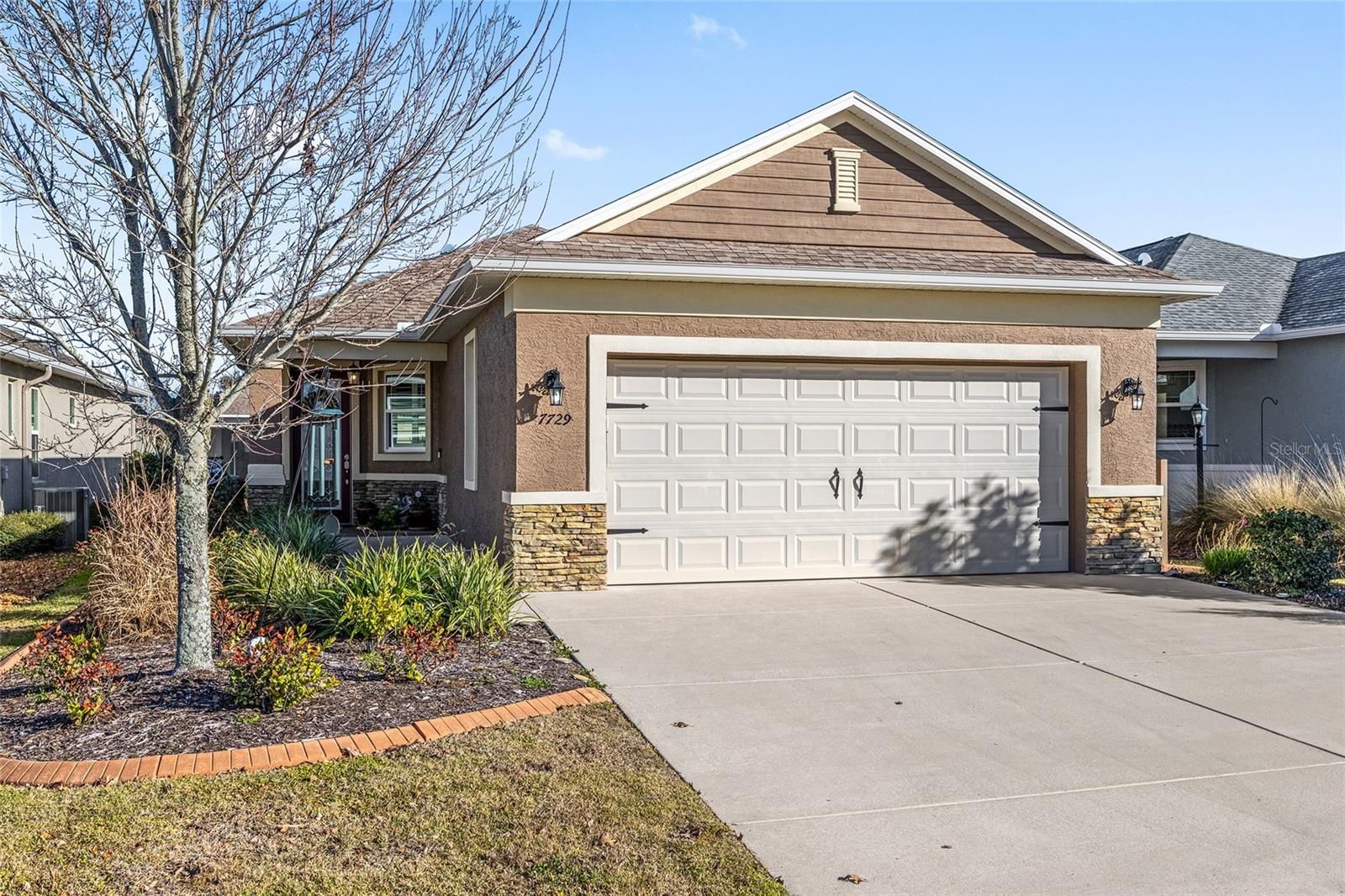 2-bedroom, 2-bath Oren model with 2-car garage and no front neighbors, offering curbside mail and trash service and a stone façade with added landscaping. Open floor plan with upgraded kitchen featuring staggered white cabinets with crown molding, quartz countertops, glass tile backsplash, and stainless-steel appliances. Living room includes tray ceiling with crown molding, wood shuttered window treatments, floor-to-ceiling glass front door, and upgraded interior paint (not builder basic). Primary suite offers oversized walk-in closet and en-suite bath with dual vanities, designer mirrors, frameless glass shower enclosure, and upgraded tile shower surround. Additional features include luxury vinyl plank flooring throughout (no carpet), upgraded lighting package, extra cabinets in laundry room, epoxy-coated garage floor, and screened-in porch with a large paver extension. Located in Weybourne Landing at On Top of the World, with private amenities including pool, pickleball, miniature golf, fitness room, library, clubhouse, dog park, and curbside trash. Golf-cart-friendly active adult community with lower HOA fees and golf cart access to shopping, dining, and services.
