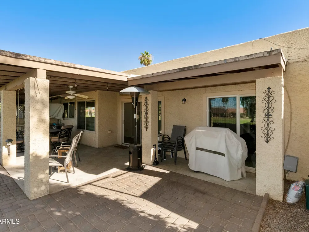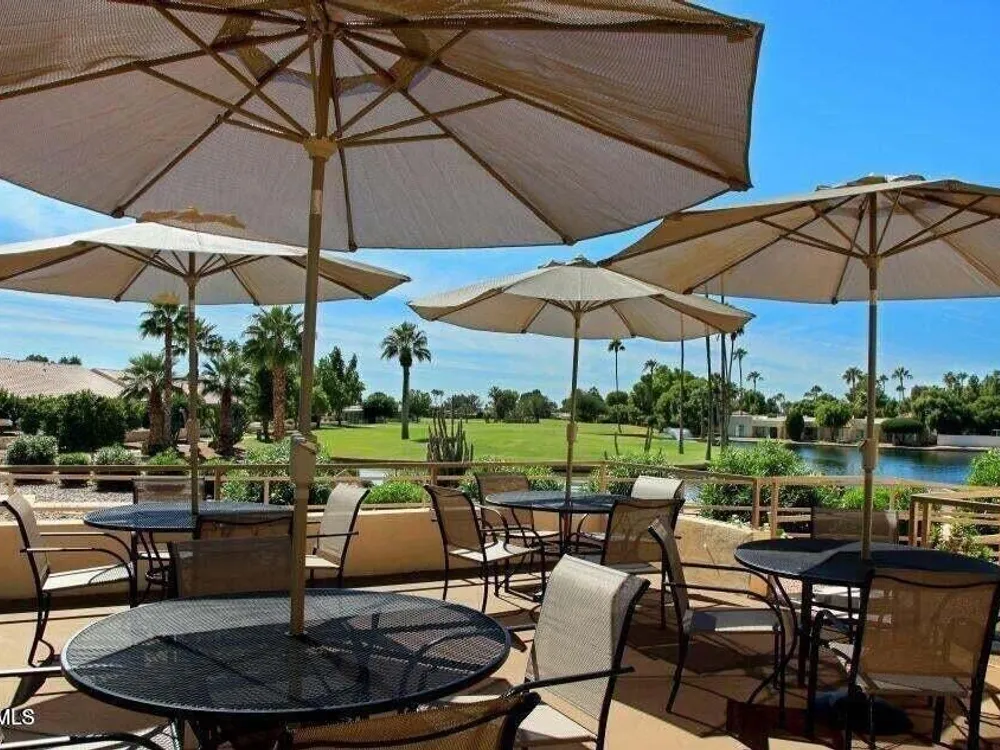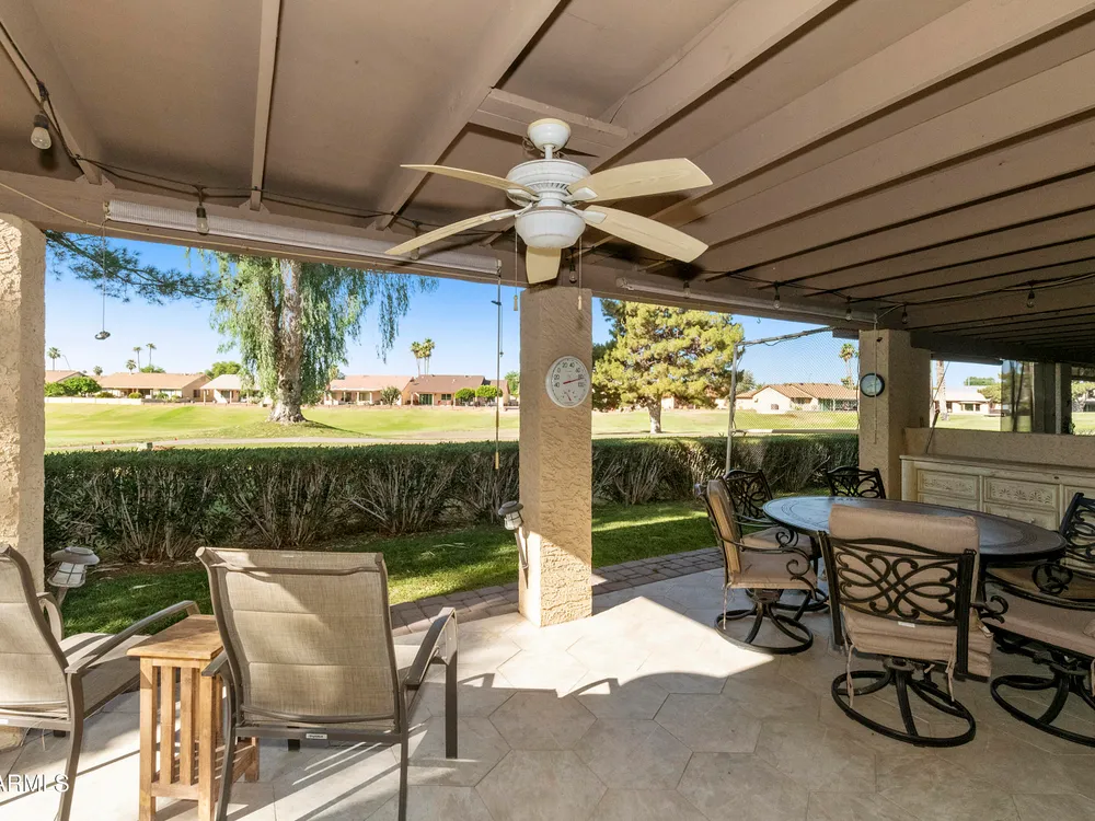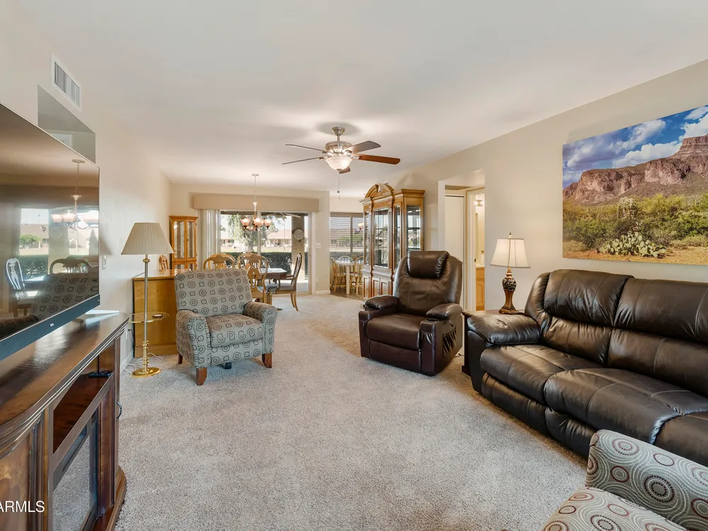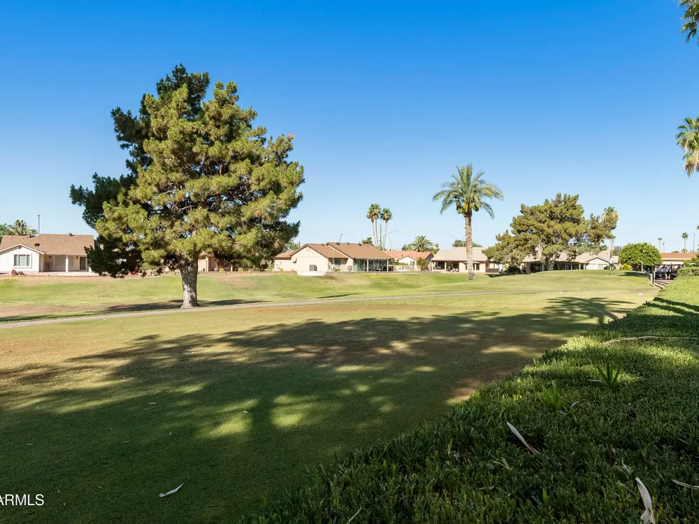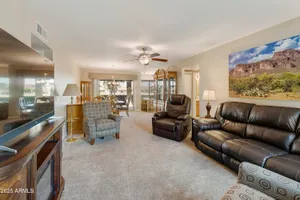 Welcome to this well-maintained home in the highly sought-after 55+ community of Fountain of the Sun, perfectly situated on a golf course lot. This 2-bedroom, 1.75-bathroom home offers a split layout with a spacious primary suite featuring a walk-in closet and 3/4 bath. The updated kitchen (2024) includes granite countertops, built-in microwave, range/oven, dishwasher, refrigerator, and disposal—perfect for everyday cooking and entertaining. Enjoy dual-pane windows, a mix of carpet, laminate, and tile flooring (2023/2024), and an electric water heater (2024). The cozy dining area and open-concept family room flow seamlessly to a covered patio with peaceful golf course views and desirable north/south exposure. Additional highlights include a new roof (2023). CLICK MORE... two-car carport, and washer and dryer located in the front storage area. Sorry, this is a NO PET area! Convenient to the US 60 and Red Mountain freeways, close to the Mesa Gateway Airport, Sky Harbor, and Costco! If shopping & dining out is your thing...Superstition Springs & San Tan Mall are a short drive away. Enjoy the Country Club & Golf Community offering a lake, and golf course. Lots of planned activities, pickleball, BOCCE, Fitness, billiards, library, horseshoes, arts & crafts, card room, shuffleboard, and more! Birdie's restaurant opened daily!