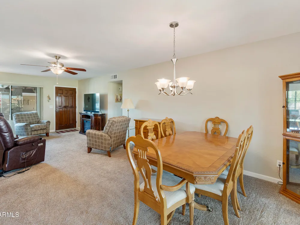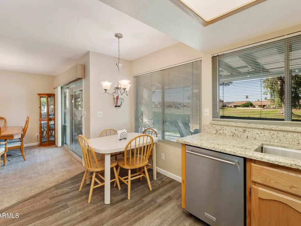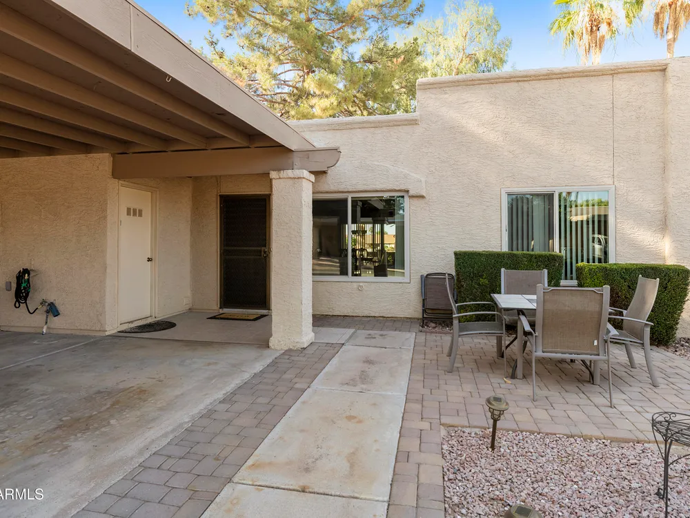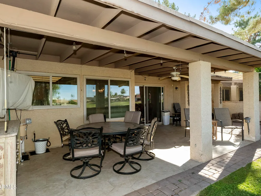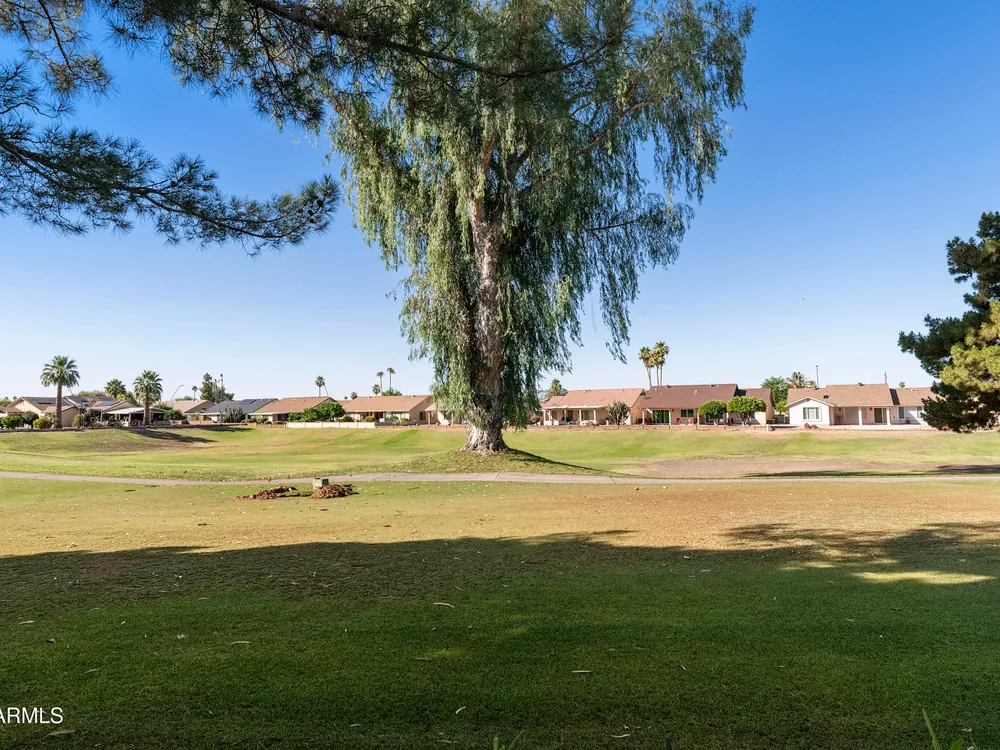 Welcome to this well-maintained home in the highly sought-after 55+ community of Fountain of the Sun, perfectly situated on a golf course lot. This 2-bedroom, 1.75-bathroom home offers a split layout with a spacious primary suite featuring a walk-in closet and 3/4 bath. The updated kitchen (2024) includes granite countertops, built-in microwave, range/oven, dishwasher, refrigerator, and disposal—perfect for everyday cooking and entertaining. Enjoy dual-pane windows, a mix of carpet, laminate, and tile flooring (2023/2024), and an electric water heater (2024). The cozy dining area and open-concept family room flow seamlessly to a covered patio with peaceful golf course views and desirable north/south exposure. Additional highlights include a new roof (2023). CLICK MORE... two-car carport, and washer and dryer located in the front storage area. Sorry, this is a NO PET area! Convenient to the US 60 and Red Mountain freeways, close to the Mesa Gateway Airport, Sky Harbor, and Costco! If shopping & dining out is your thing...Superstition Springs & San Tan Mall are a short drive away. Enjoy the Country Club & Golf Community offering a lake, and golf course. Lots of planned activities, pickleball, BOCCE, Fitness, billiards, library, horseshoes, arts & crafts, card room, shuffleboard, and more! Birdie's restaurant opened daily!
