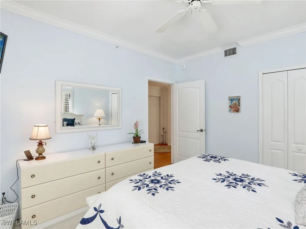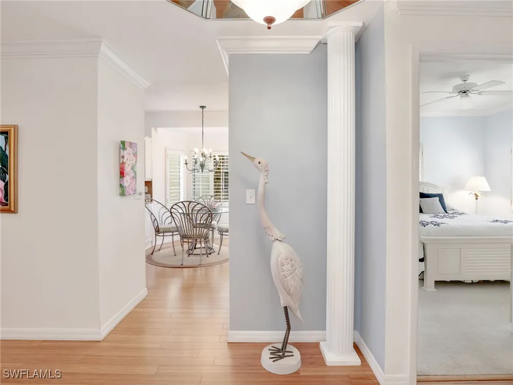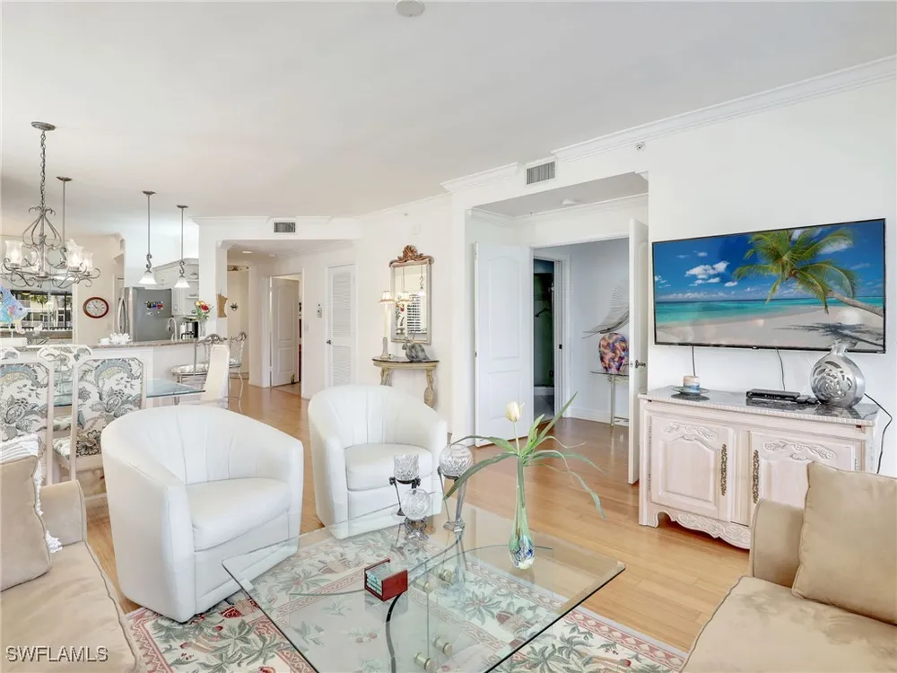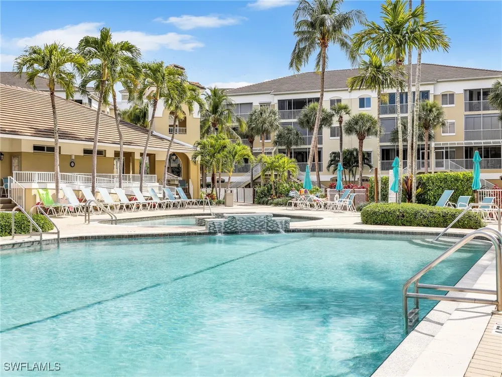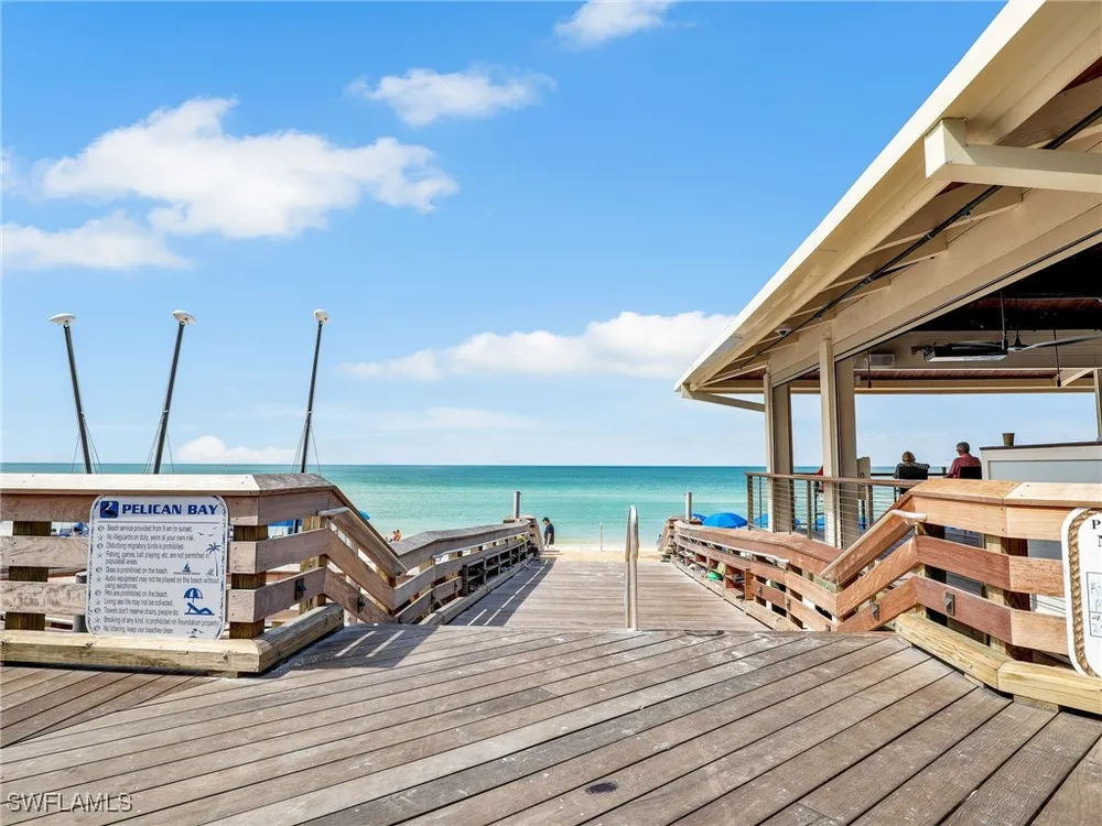 3bd 2 ba end unit condo, with a beautiful lake view. Condo has been tastefully redone, FEATURES BAMBOO WOOD FLOORS WITH CROWN MOLDING throughout. Kitchen has stainless appliances and a dining area .Built-in Cabinets in 3rd bedroom . Guest bath totally redone 1 year ago, tile floors, quartz countertops, shower and tub have new tiles, primary bath redone beautiful tiles and siletone countertops. Attached single-car garage close to elevator and large oversize lanai. Pebble creek has an island with 2 pools, gazebo, sauna spa, barbecues, clubhouse and a workout room. Pelican Bay has 3 miles of beach, access with trams or walk through the mangroves to the beach. Beach restaurants, attendants on the beach, tennis, pickleball. bocce, and attended fitness center.