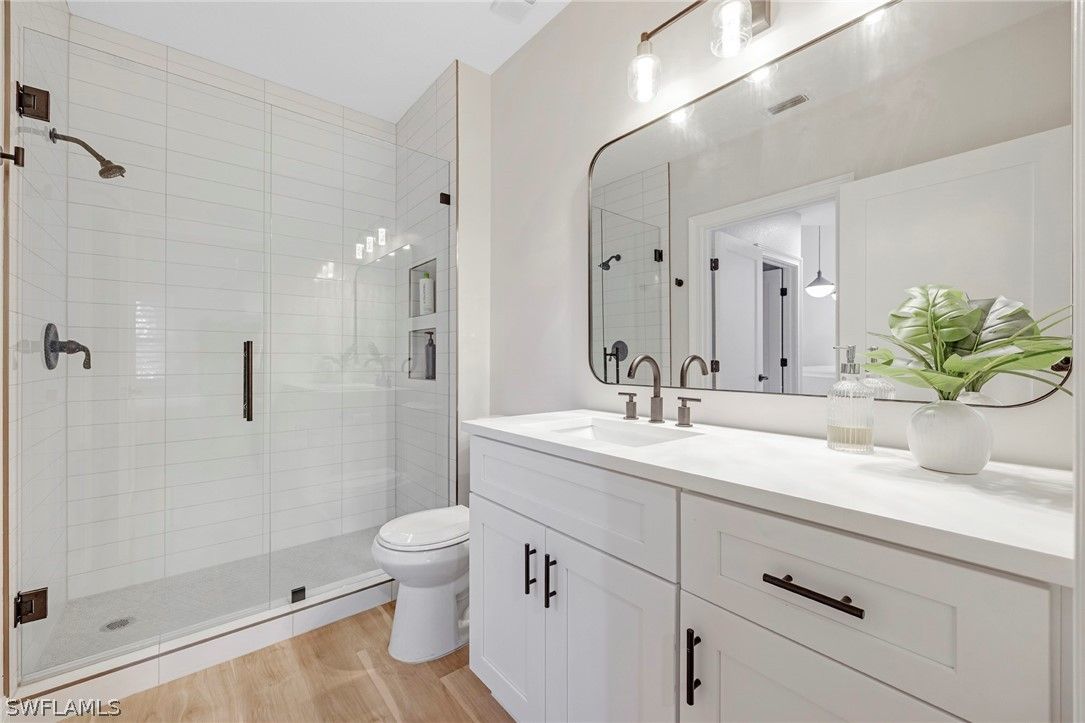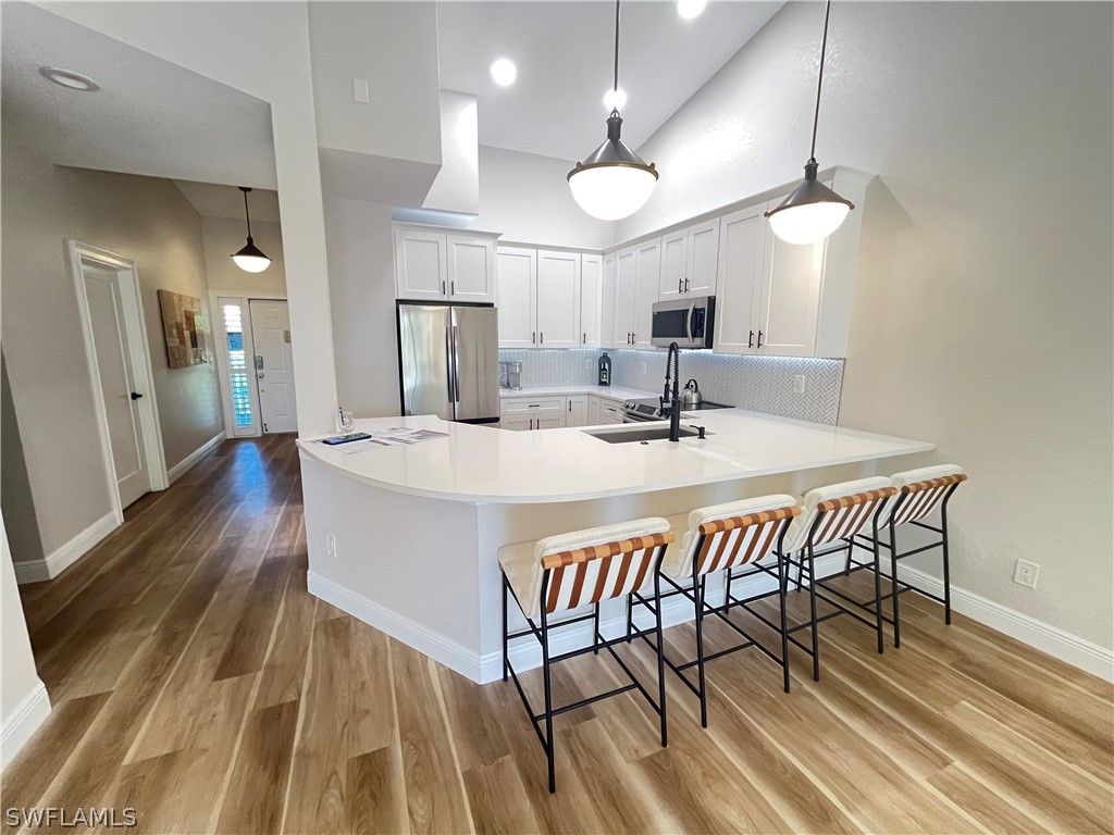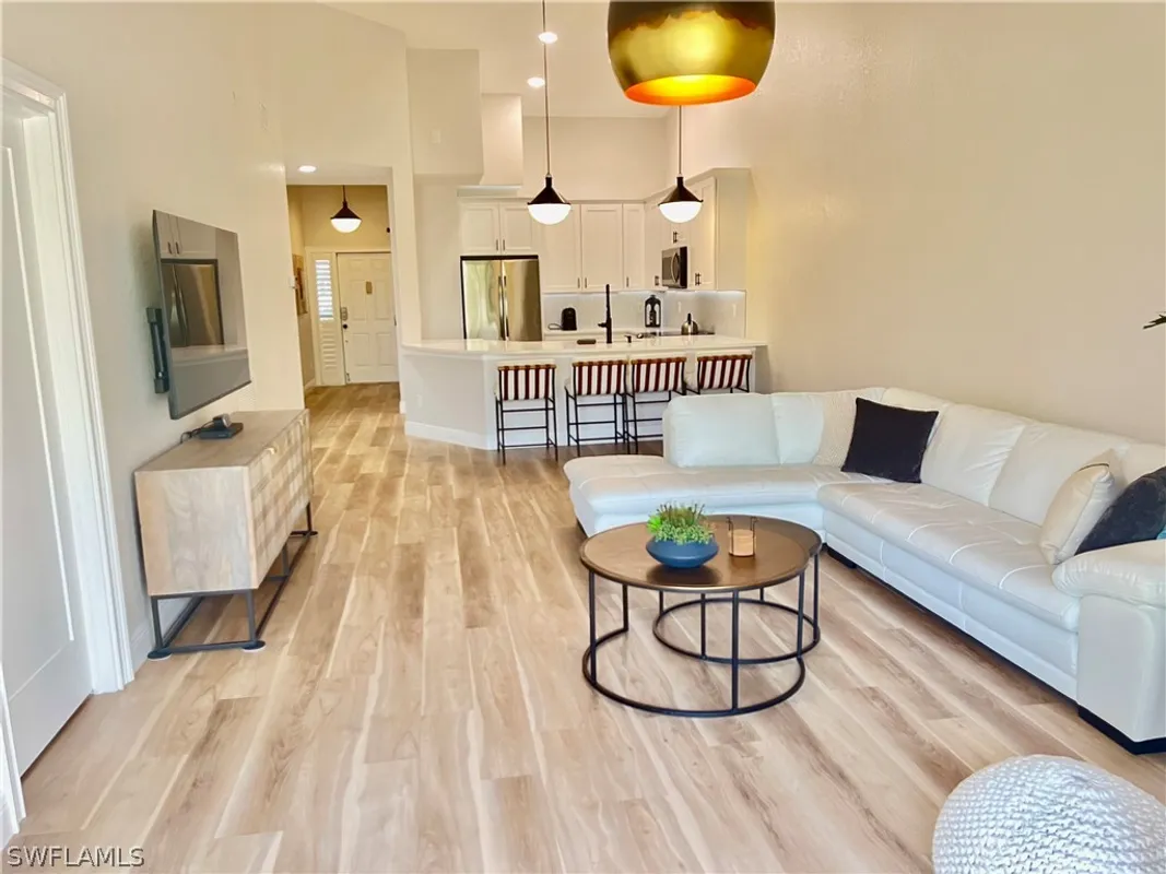 NEWLY RENOVATED – VAULTED CEILINGS – PRIVATE 2-CAR GARAGE! Experience Naples living at its finest in this gorgeous 3-bedroom, 2-bath luxury condo in Pelican Bay. This elegantly updated residence features an open, airy floor plan with soaring vaulted ceilings and abundant natural light throughout. The beautifully redesigned kitchen offers neutral cabinetry with under-cabinet lighting, new stainless steel appliances, quartz countertops, a glass tile backsplash, and a large rounded breakfast bar with seating for 4–6—perfectly flowing into the dining and great room, ideal for entertaining. Enjoy peaceful mornings or evening relaxation on the screened lanai overlooking private preserve views. Wide-plank luxury vinyl flooring runs seamlessly throughout the living areas, complemented by stylish tile in the bathrooms. The primary suite is a serene retreat with plantation shutters, southern exposure, and tranquil preserve views. The spa-like bath features dual sinks, an enlarged tiled shower, a custom walk-in closet, private water closet, and soft-close cabinetry. The second bedroom includes its own en-suite bath, offering comfort and privacy for guests. Additional highlights include a beautifully updated laundry area with quartz folding station and extra storage, turnkey furnishings, and a prime location near the elevator providing direct access to a rarely available private 2-car enclosed garage with new epoxy flooring and extra storage space for bikes and beach gear. Re-piping was completed in 2023 for added peace of mind. Pebble Creek offers resort-style amenities including a pool, spa, sauna, clubhouse, and fitness center, and is ideally located just across from the North tram station providing quick access to Pelican Bay’s private beaches. Residents of Pelican Bay enjoy exclusive access to nearly 3 miles of pristine beachfront, waterfront dining, kayaking, sailing, a robust tennis program, upcoming pickleball, and scenic walking and biking paths—all within a beautifully maintained, private gated community close to Waterside Shops, Mercato, Artis–Naples, and more. Schedule your showing today!