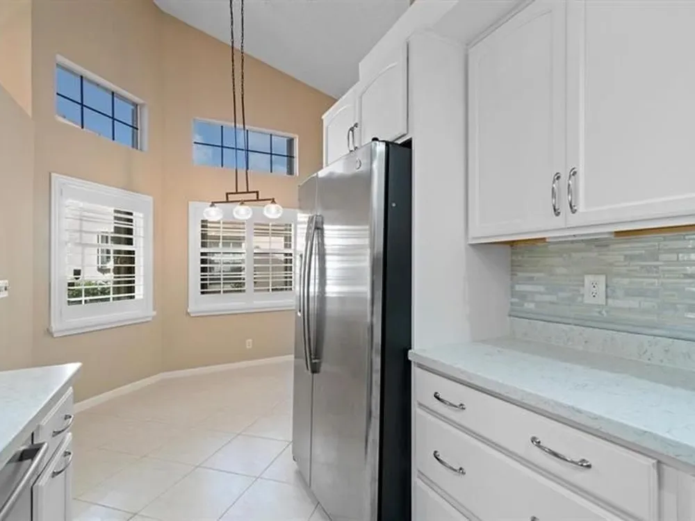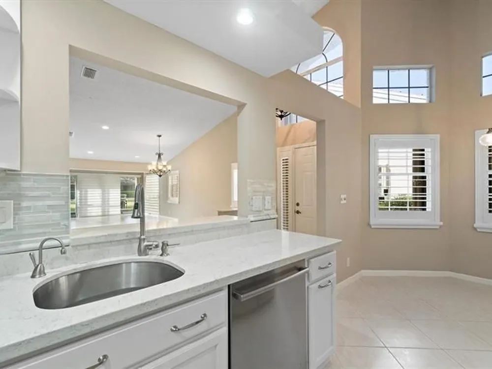 Rare opportunity to purchase a corner villa in the active community of Emerald Pointe with 2-car garage. This renovated Gardenia Model offers 2 beds, 2 baths, a den, an expanded florida room. vaulted ceilings and 2,159 total sq ft. Beautifully updated eat-in kitchen with white cabinets, new stainless steel appliances, modern countertop and backsplash, open to dining area, oversized family room and living room. Spacious primary bedroom has 2 walk-in closets, large bathroom with double sinks, separate shower and Roman Tub. Split bedroom floor plan. Separate laundry room with new washer and dryer. New AC. Accordion shutters. Glass sliders with canal view. Full time social director. HOA covers roof maintenance, hurricane & building insurance, water, cable, internet, exterior paint, landscaping
