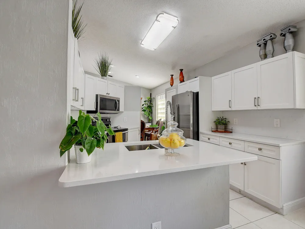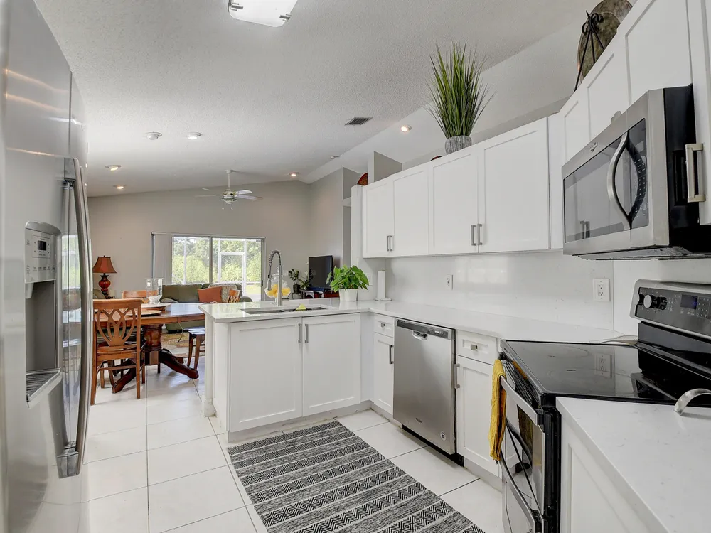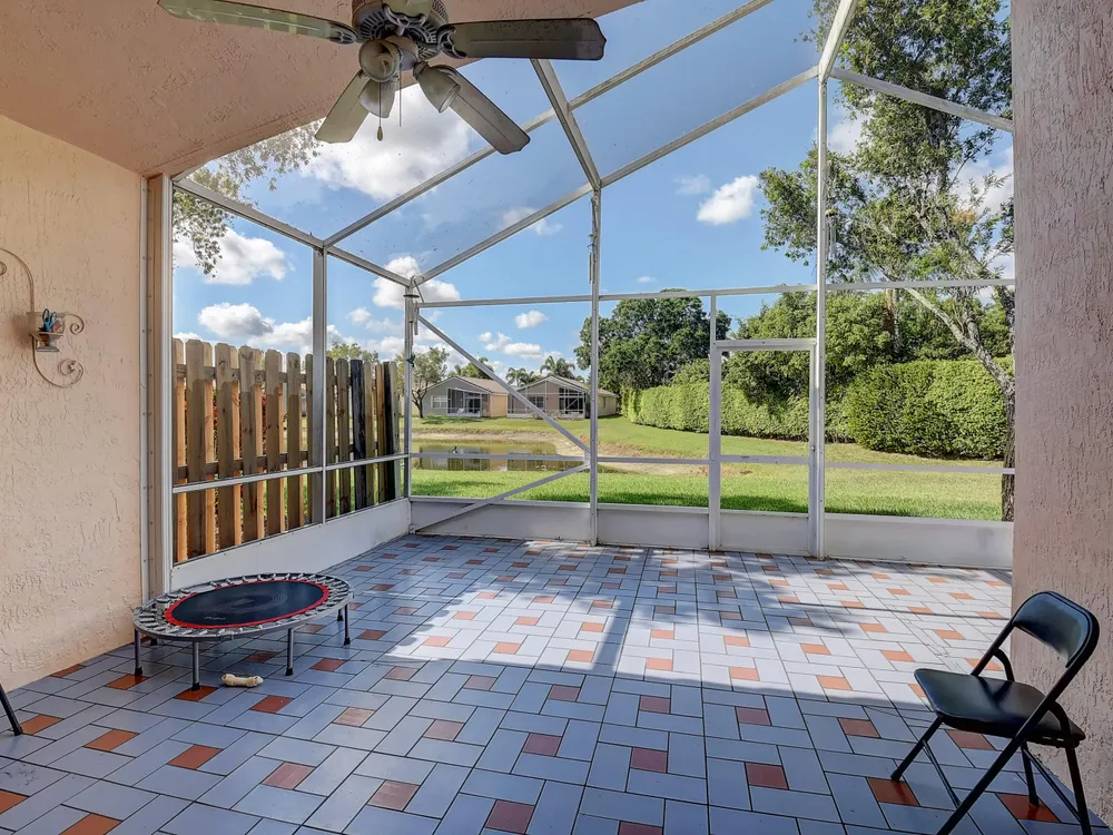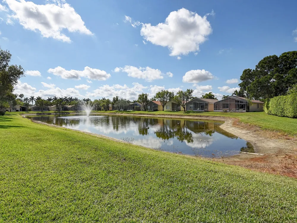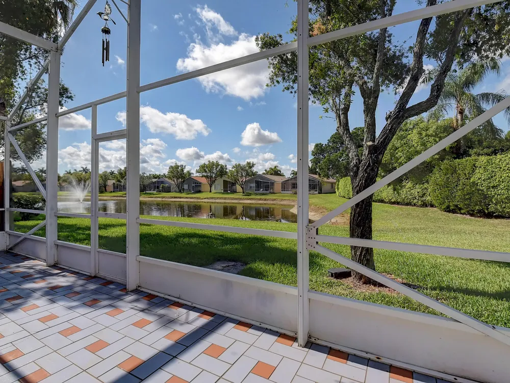 NEW ROOF SEPT 2022! Lake front Cypress Model is a SF 2/BR+Den/2BA/2CG & is equipped w/Accordion Hurricane Shutters. Den has a door so easy conversion to true 3BR, just add a closet. Home offers beautiful updated kitchen w/Quartz Countertops w/full backsplash, upgraded light fixture, SS appliance package, double oven, large SS sink w/upgraded faucet & built in pantry. Both Bathrooms have been renovated w/tile to ceiling & the works. Home is complete w/high hats galore, fans, fixtures & window treatments throughout. Floors are tile, laminate & bamboo wood in Primary BR w/newer 4'' baseboards. 2 new lighted sconces in DR. Seller replaced the Extended bird cage screen in yard. Patio is tiled & has security light. Seller also replaced the yard side fence & upgraded the landscape. Priced to sel