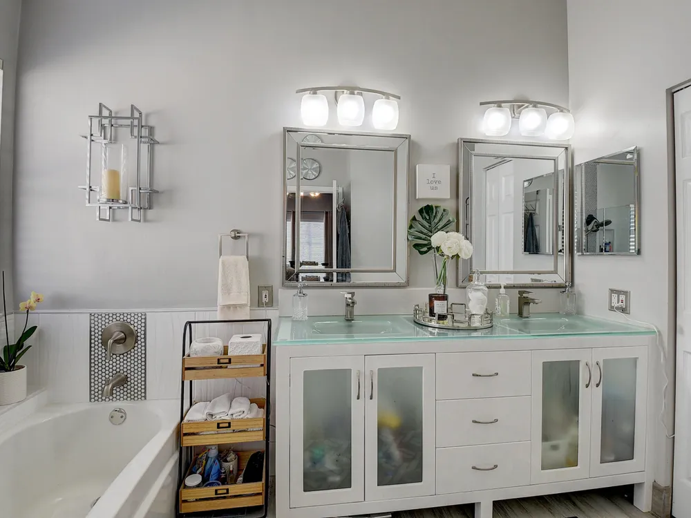 - Entrance Foyer, Garden Tub/Roman Tub, Split Bedrooms, Walk-In Closet(s), Separate/Formal Dining Room, Dual Sinks, Primary Downstairs, Separate Shower, Bathtub, Storm Shutters