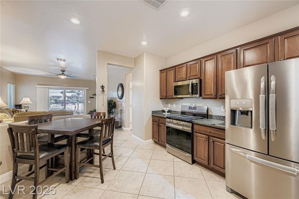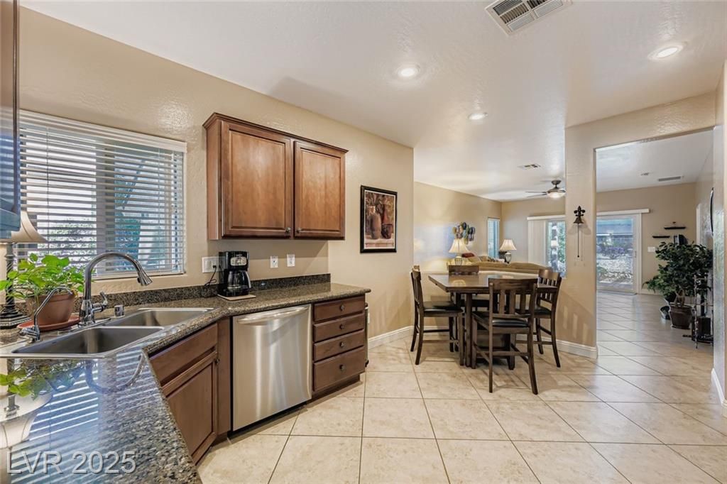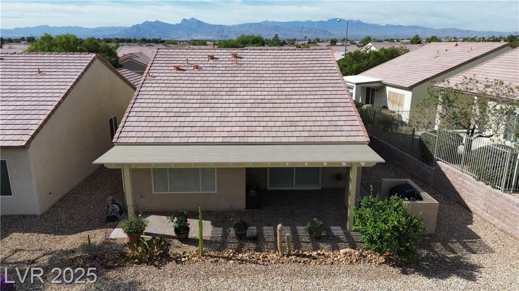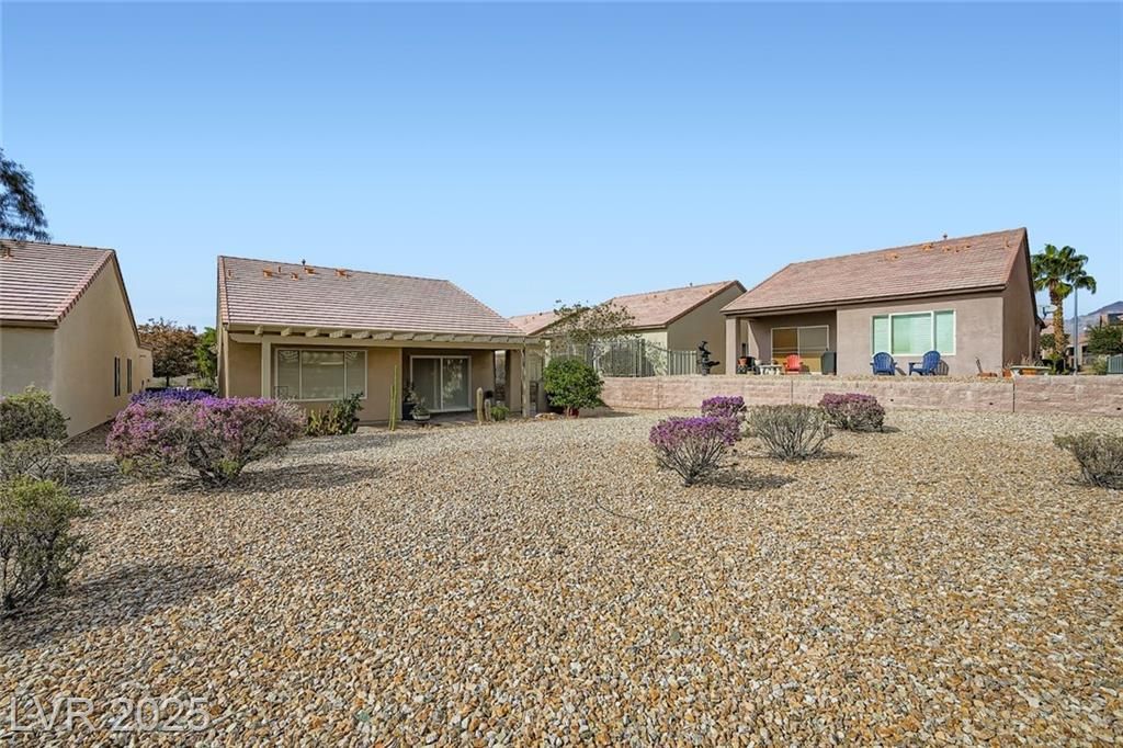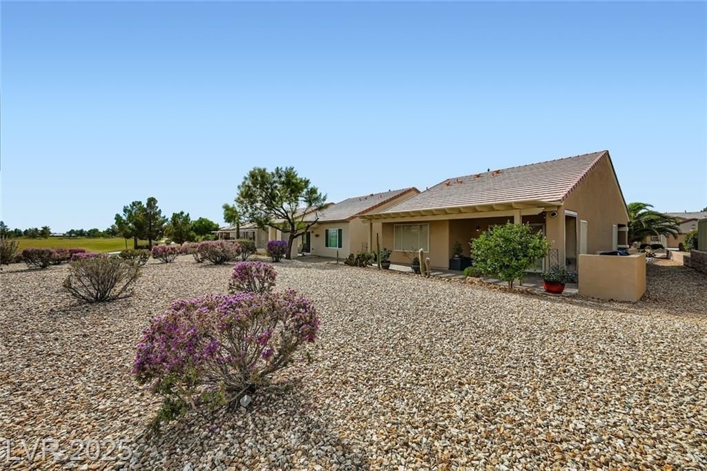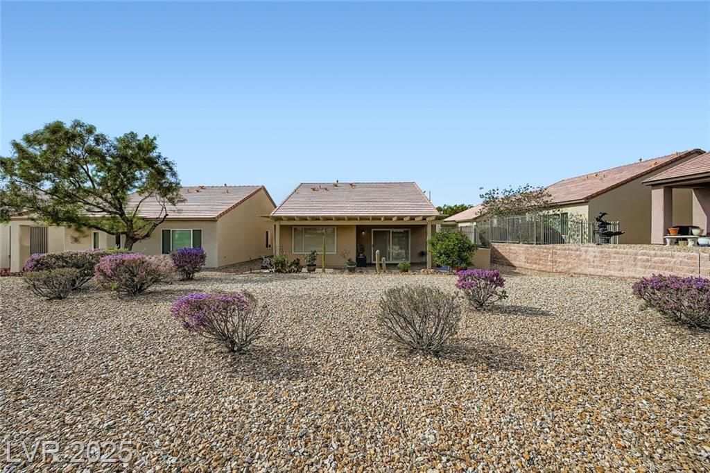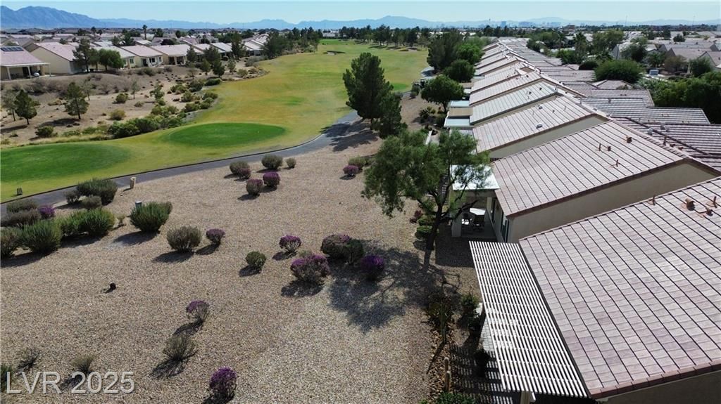 Beautifully updated Sun City Aliante home with fresh interior/exterior paint, open layout, tile flooring in main areas, upgraded cabinets, granite countertops, and stainless steel appliances. Premium security screens on all doors/windows. Enjoy amazing golf and mountain views from the oversized covered patio with pavers overlooking the 5th tee box—perfect for watching players tee off—and a private front courtyard with pavers for morning coffee. The driveway, back, and side yard are also fully paved. HVAC is less than 3 years old. Located in a premier 55+ community with a clubhouse, fitness center, indoor pool/spa, pickleball, tennis, and a full social calendar. As homeowners, we can show you why Sun City Aliante has earned the Outstanding Large Association Award for the last six years!. Don't miss out on this beautiful home!