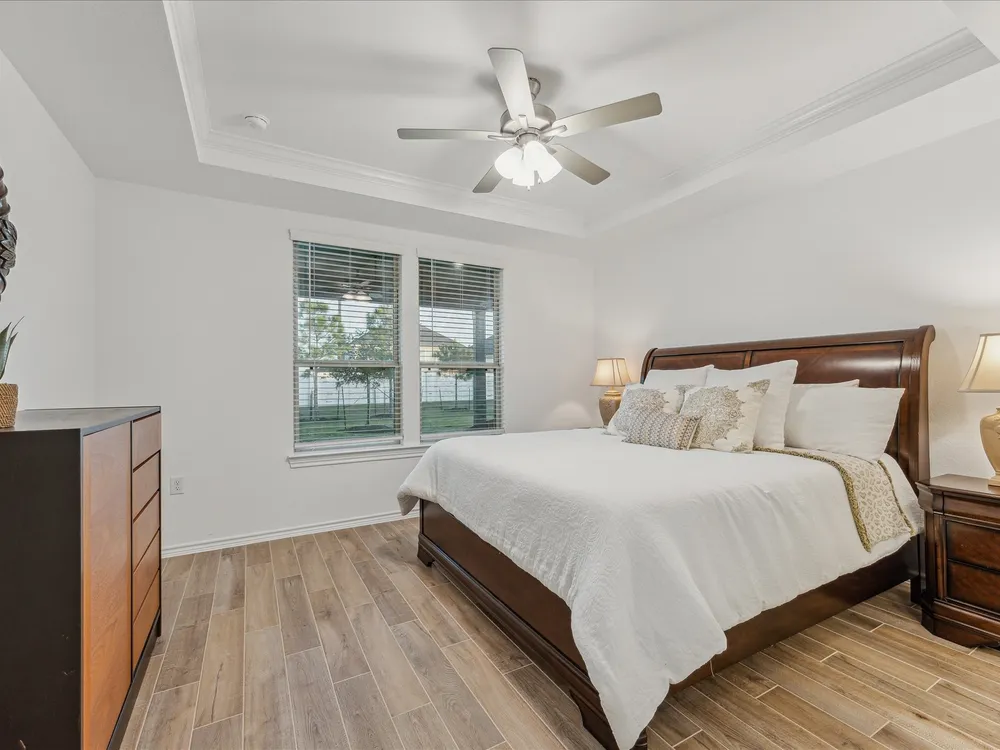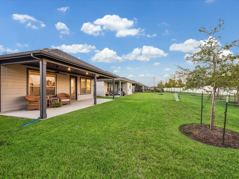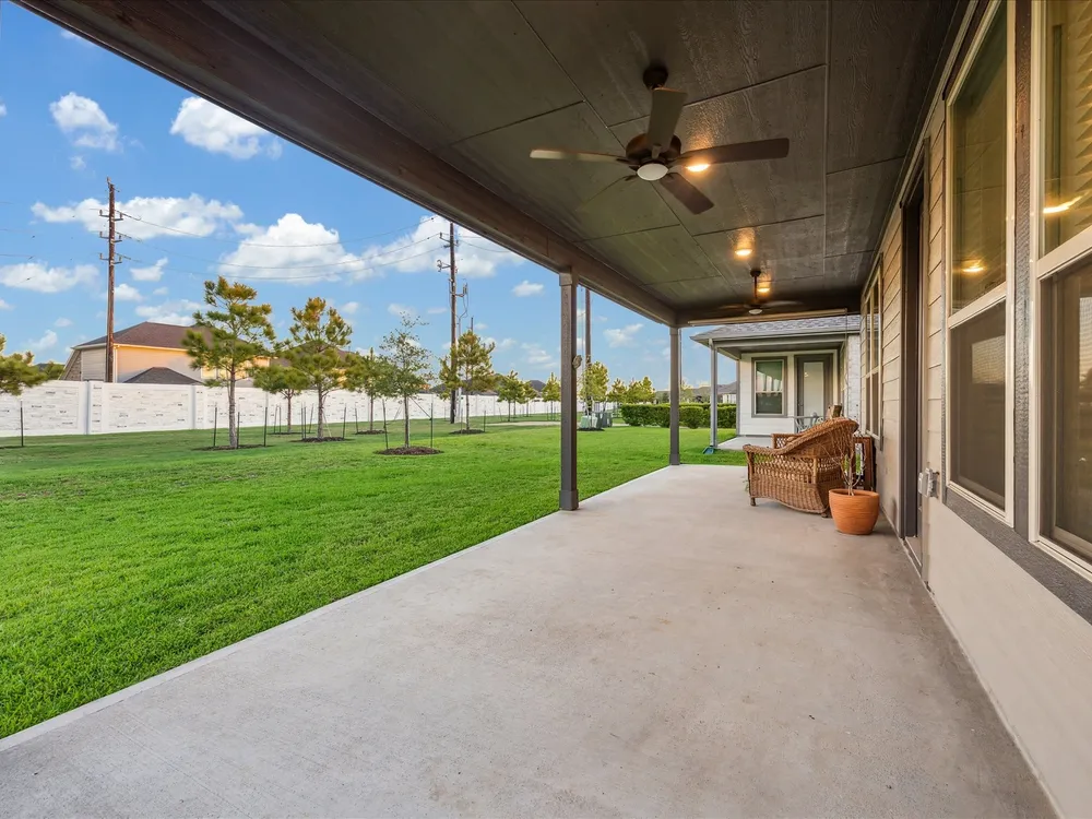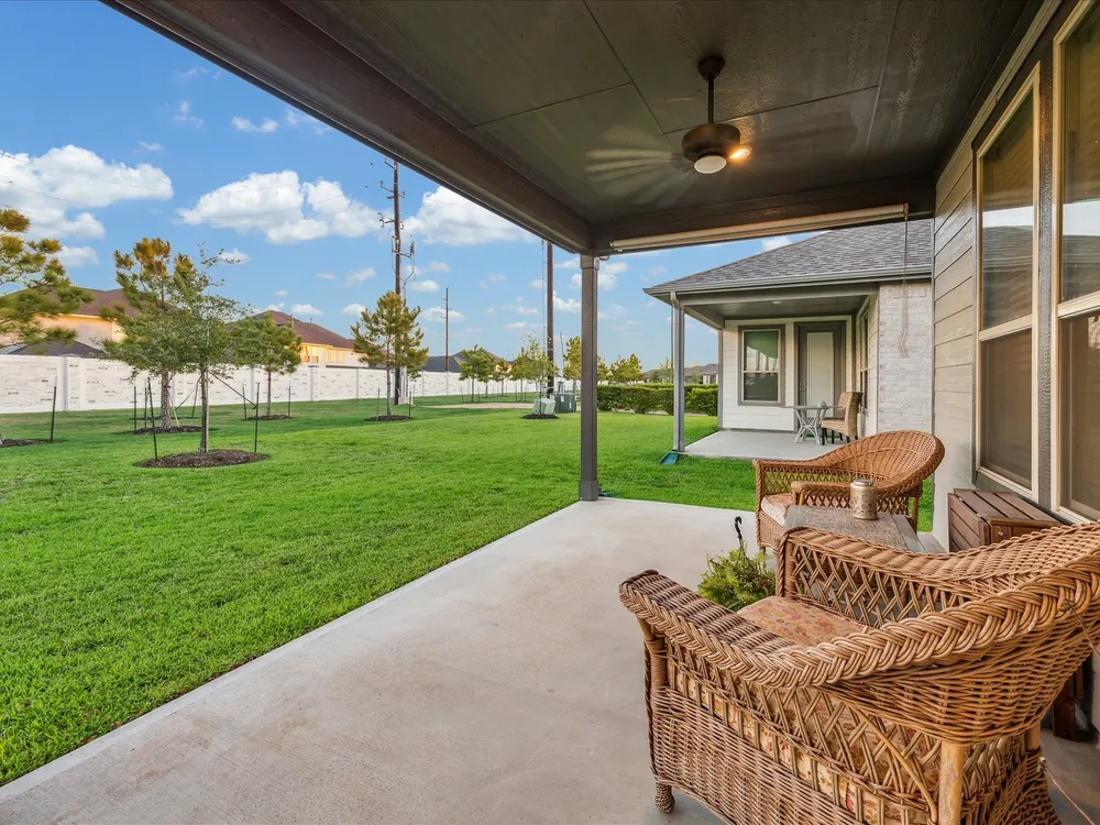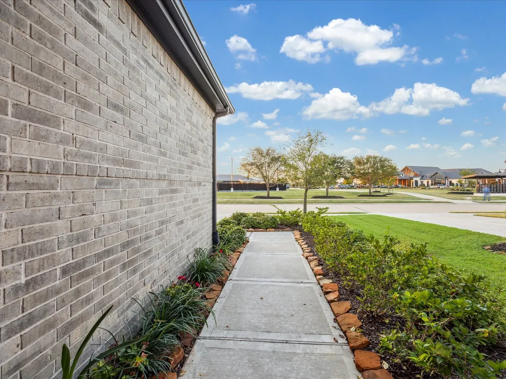 Effortless living can be had in Del Webb's vibrant 55+ community filled w/resort-style amenities where every day feels like a retreat, just 1 mile from thriving downtown Fulshear. Backing to a private greenbelt and DIRECTLY across from the community recreation center where social opportunities abound, the prime lot location can't be beat. Literally a stone's throw away residents gather&enjoy the club house, fitness center, an 18-hole putting green, indoor & outdoor pools, pickle ball, walking trails and more. A community garden and numerous social clubs include Bridge, Bunco, Wine and Bourbon & Whiskey for those seeking connection. The popular Contour floor plan is like new construction, only better. Upgraded extended covered back patio is ideal for morning coffee and entertaining. Custom window coverings and washer and dryer will convey. Tasteful warm color palette includes pretty wood look tile. The seller is relocating to the lake, this home is ready for its next chapter—yours.