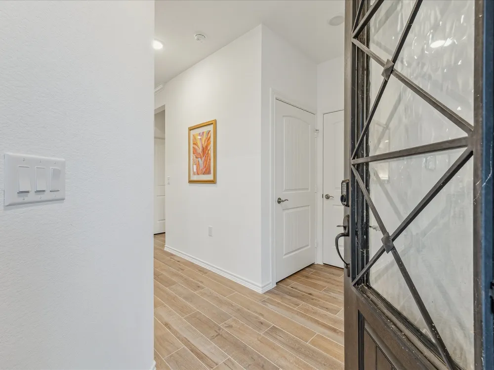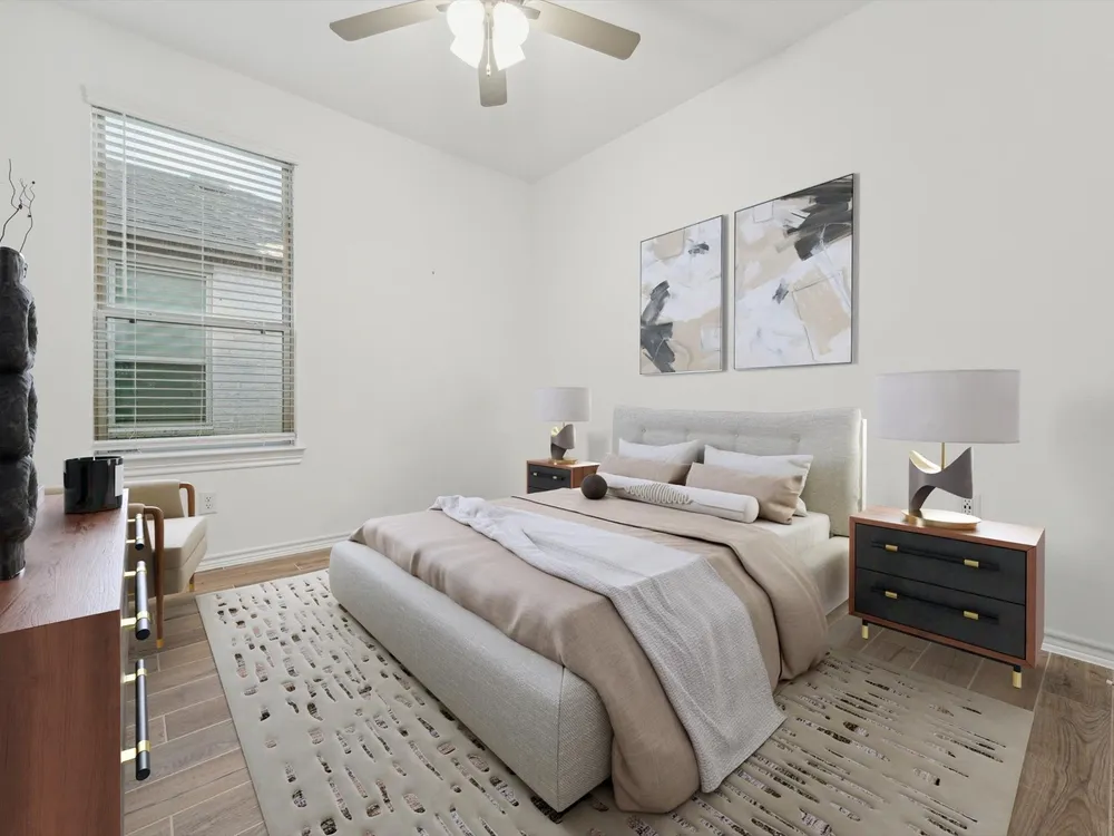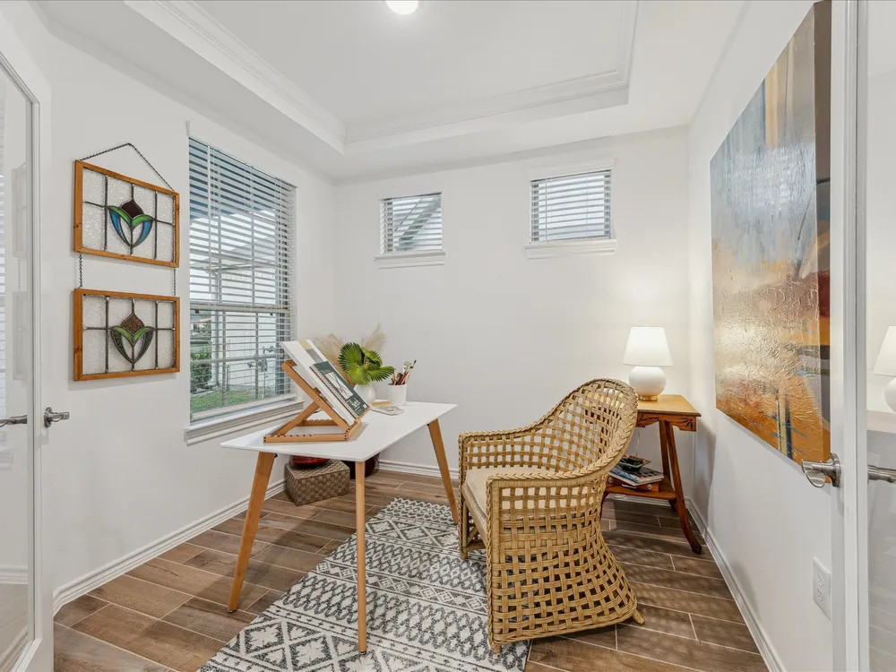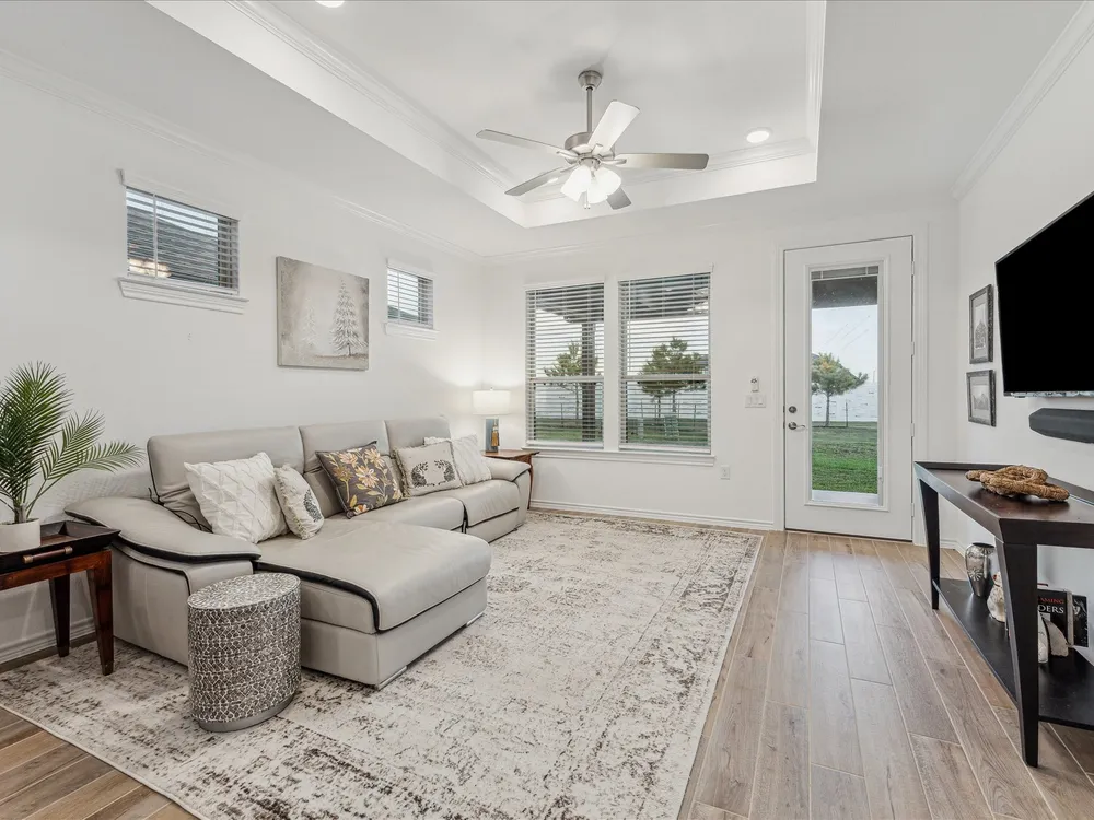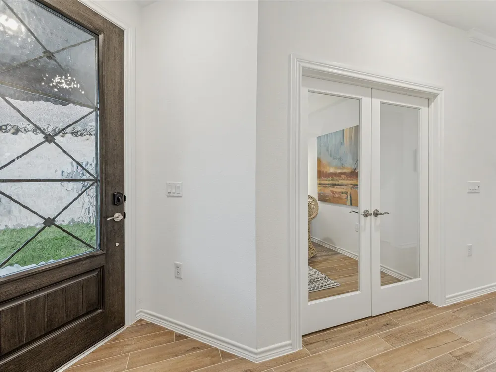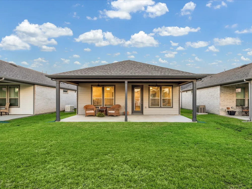 Effortless living can be had in Del Webb's vibrant 55+ community filled w/resort-style amenities where every day feels like a retreat, just 1 mile from thriving downtown Fulshear. Backing to a private greenbelt and DIRECTLY across from the community recreation center where social opportunities abound, the prime lot location can't be beat. Literally a stone's throw away residents gather&enjoy the club house, fitness center, an 18-hole putting green, indoor & outdoor pools, pickle ball, walking trails and more. A community garden and numerous social clubs include Bridge, Bunco, Wine and Bourbon & Whiskey for those seeking connection. The popular Contour floor plan is like new construction, only better. Upgraded extended covered back patio is ideal for morning coffee and entertaining. Custom window coverings and washer and dryer will convey. Tasteful warm color palette includes pretty wood look tile. The seller is relocating to the lake, this home is ready for its next chapter—yours.
