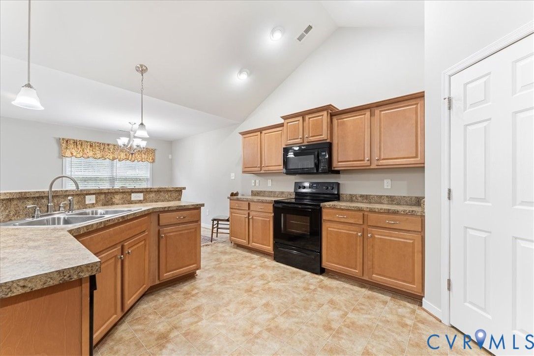 - Bedroom on Main Level, Ceiling Fan(s), Cathedral Ceiling(s), Dining Area, Double Vanity, High Ceilings, Kitchen Island, Laminate Counters, Bath in Primary Bedroom, Main Level Primary, Pantry, Recessed Lighting, Cable TV, Walk-In Closet(s)