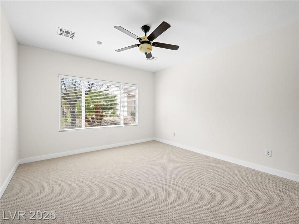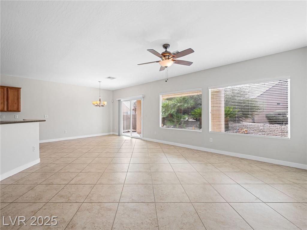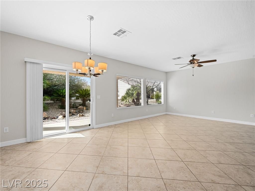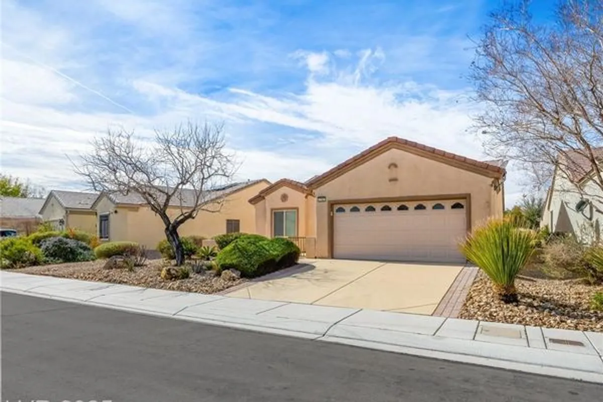 Welcome to Sun City Aliante! This charming single-story 2 bed, 2 bath + den home is located in a vibrant 55+ age-restricted community. The versatile den is perfect as an office, guest room, workout space, craft room, or library. Open floor plan with tile throughout and upgraded carpet in bedrooms. The kitchen features solid surface granite countertops, pull-out drawers, a counter-height breakfast bar, and all appliances included. Spacious great room/dining combo is ideal for entertaining. Separate primary suite offers added privacy and a large walk-in closet. Enjoy the gated front courtyard and covered backyard patio. Feel the warm, welcoming energy the moment you enter—this home is a MUST SEE! Low-maintenance lifestyle with access to amazing amenities: indoor heated pool, golf, tennis, bocce ball, fitness center, and classes. Close to Aliante Casino, shopping, dining, and more. Embrace the active lifestyle with yoga, Tai Chi, dancing, and more!
