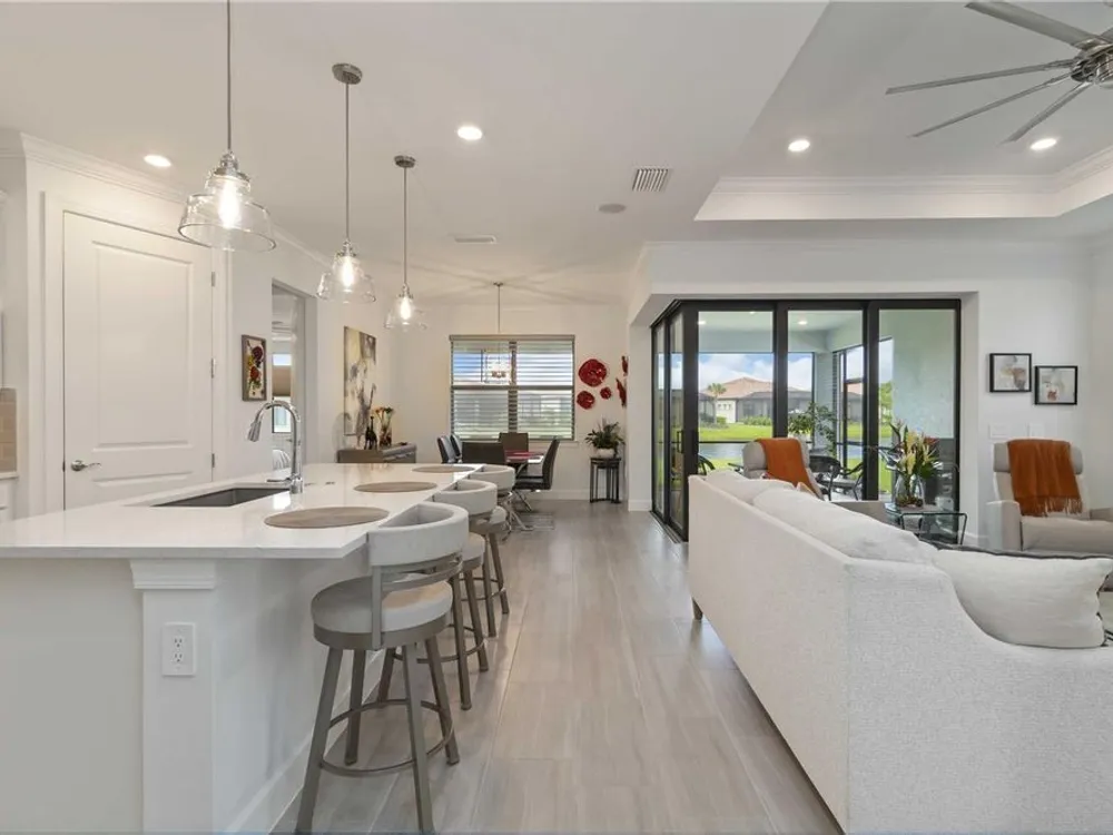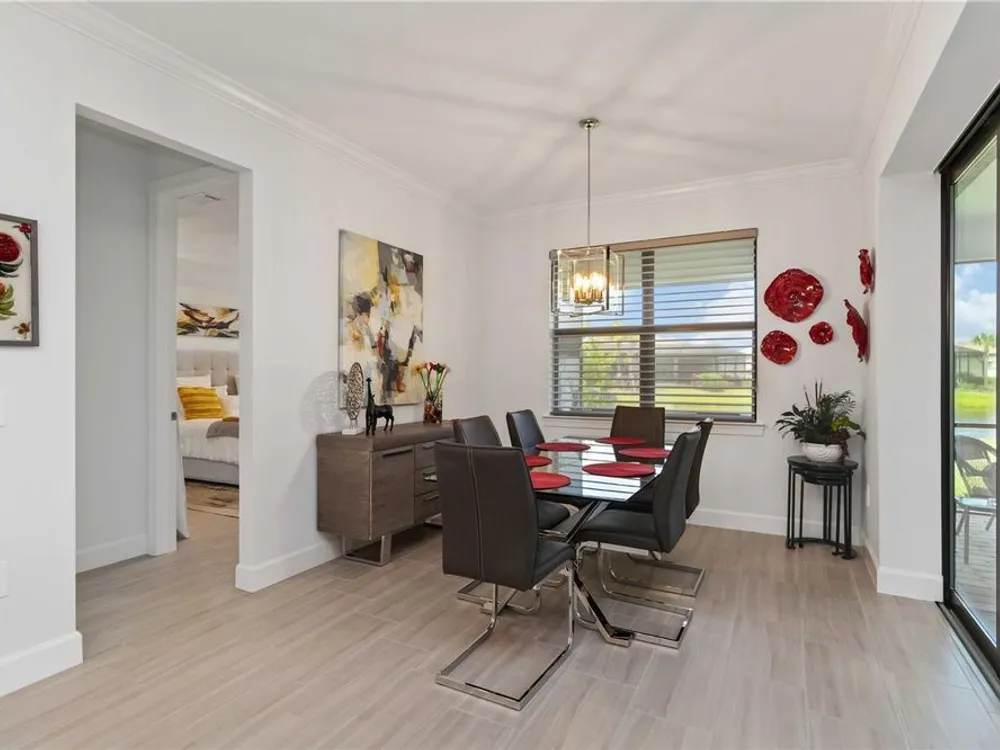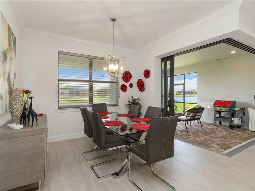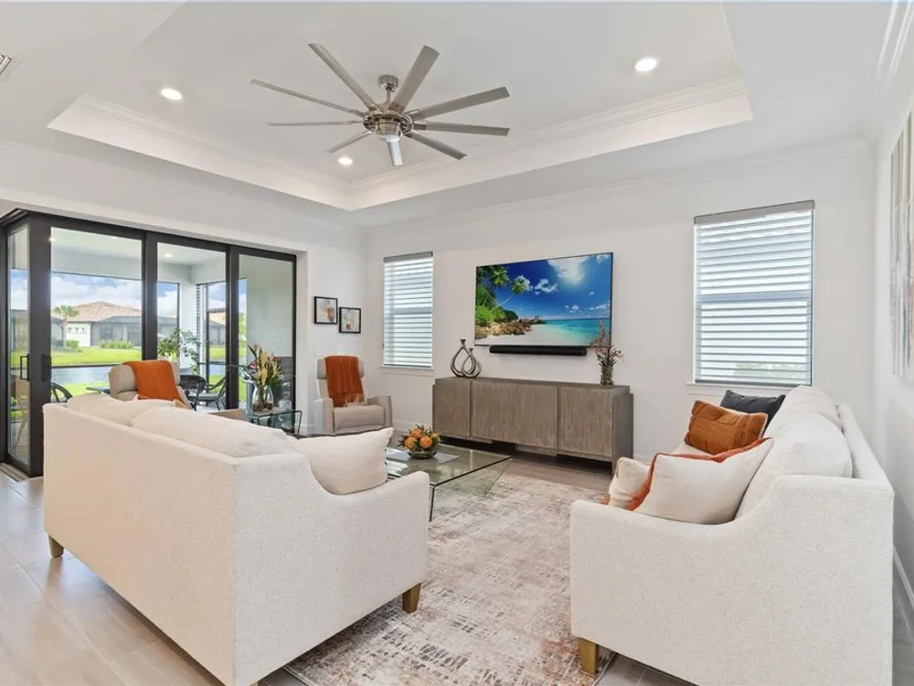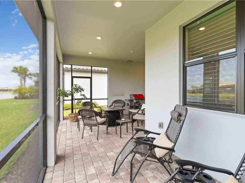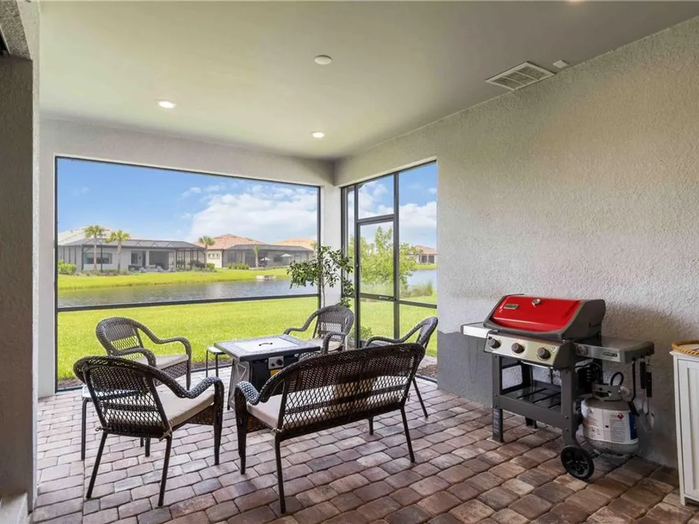 Life at Del Webb Lakewood Ranch—From Morning Light to Sunset on the Lanai Mornings start quietly here. Sunlight lifts over the lake, sliding across the tile floors of your Pulte Mystique and into the great room, where zero-corner pocketing sliders erase the line between indoors and out. Coffee on the expanded lanai becomes a daily ritual—some days it’s breakfast with a view; others it’s a quick hello to neighbors before a pickleball match or a class at the clubhouse. Inside, every detail is already done. Tray ceilings, crown molding, 8' doors, 5" baseboards, Hunter Douglas window treatments, and surround-sound set an elevated tone. The crisp white gourmet kitchen—with quartz counters, upgraded stainless appliances, a granite-composite sink, and a custom wood-shelved walk-in pantry—handles everything from weeknight dinners to weekend entertaining. When guests arrive, the flex room with French doors pivots easily from home office to media room or private retreat. The primary suite is its own sanctuary: a frameless glass shower with floor-to-ceiling tile, dual sinks with upgraded mirrors, a built-in vanity with quartz top, and a custom wood-shelved walk-in closet. Practical touches are everywhere—because life here is meant to be easy: a 4' garage extension with epoxy floor and insulated doors, a fully outfitted laundry with extra cabinetry and sink, a drop zone by the garage, a whole-house water filtration/softener, and a surge protector. Outside, the premier water lot adds privacy, and the extra-wide west-side easement gives breathing room between homes. Afternoons often end at the satellite pool just seconds away, or it’s a short golf-cart ride to Del Webb’s resort amenities—clubhouse with lifestyle director, fitness center, resort pool, pickleball, tennis, and nonstop social events. Host dinner back on the lanai and plan for the future—your space is pre-plumbed for an outdoor kitchen with a TV already there. Here, you’re not just buying a home—you’re stepping into a community rhythm that’s active, friendly, and effortless. And for peace of mind: the builder’s roof warranty runs through December 28, 2027. Live the lifestyle. Love the home. Welcome to Del Webb Lakewood Ranch.