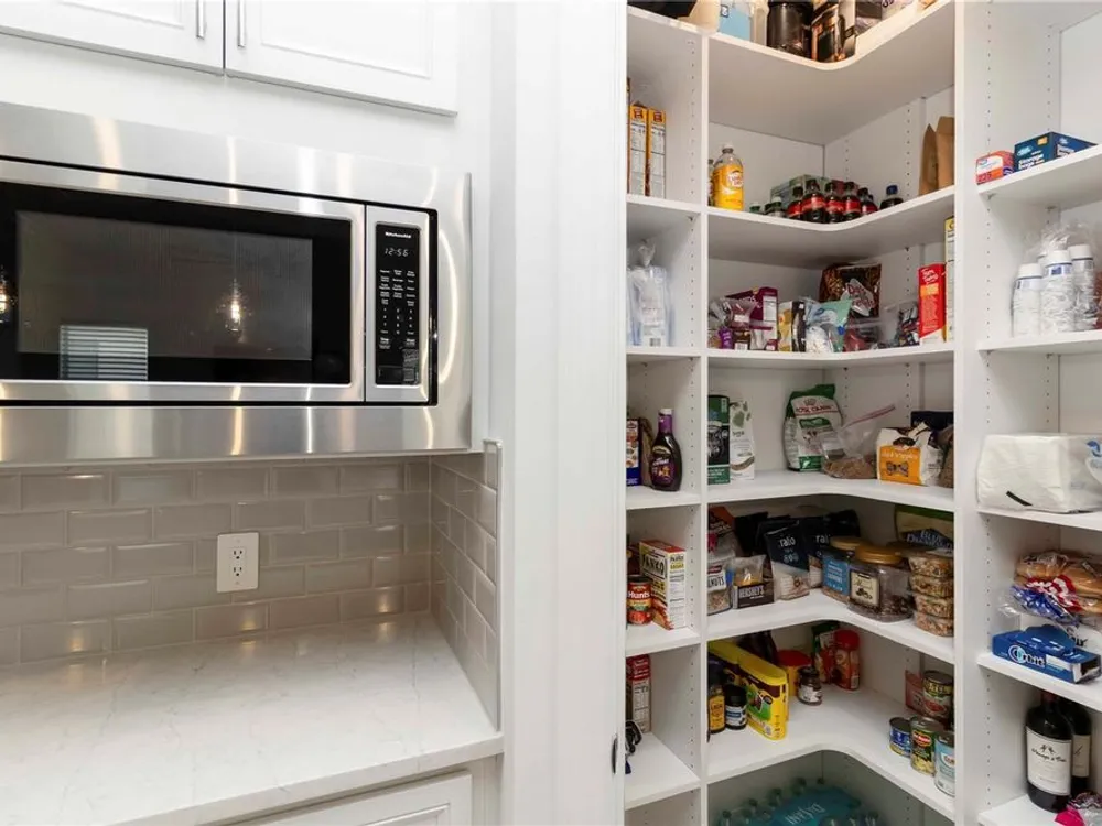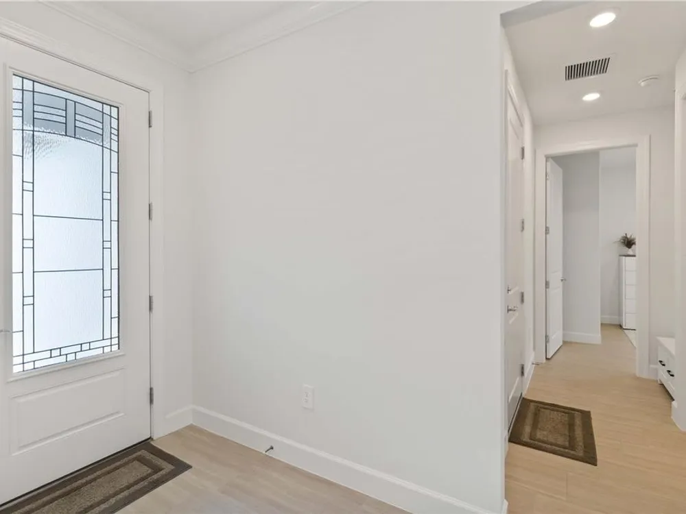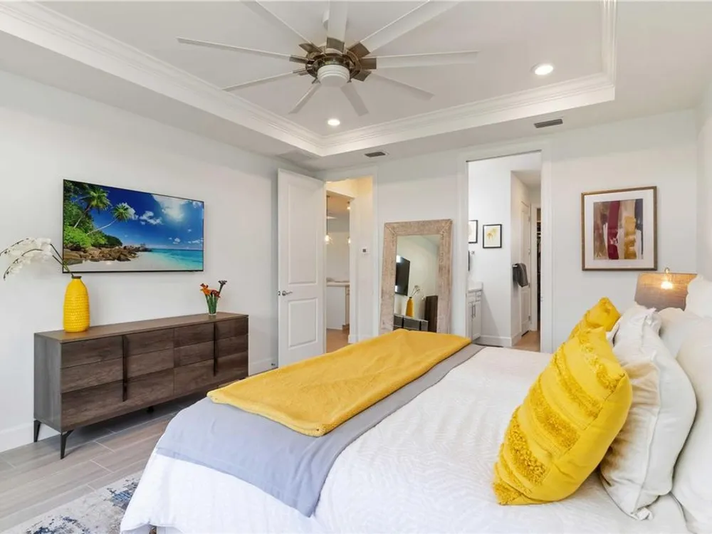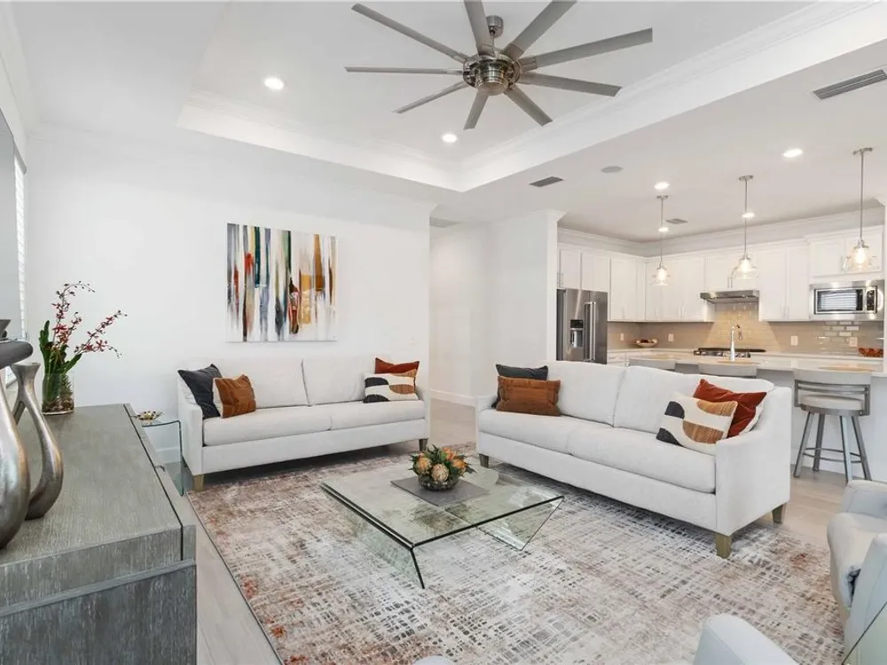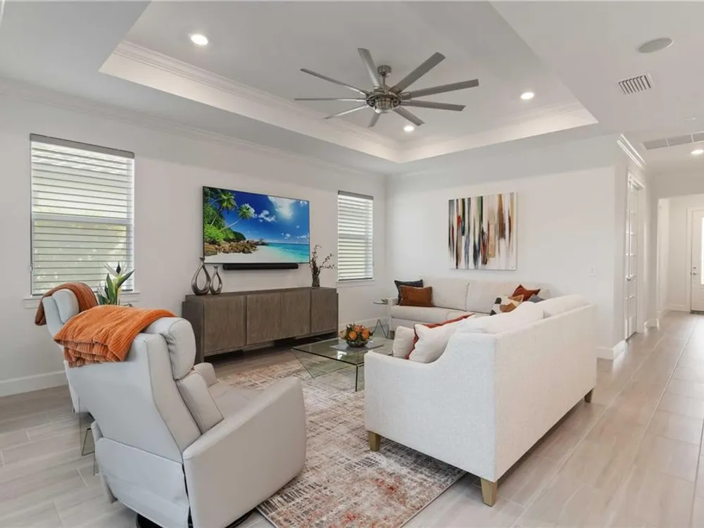 - Ceiling Fan(s), Crown Molding, Eat-in Kitchen, Kitchen/Family Room Combo, Living/Dining Room, Open Floorplan, In-Wall Pest Control, Main Level Primary, Solid-Wood Cabinets, Stone Counters, Thermostat, Tray Ceiling(s), Walk-In Closet(s), Window Treatments