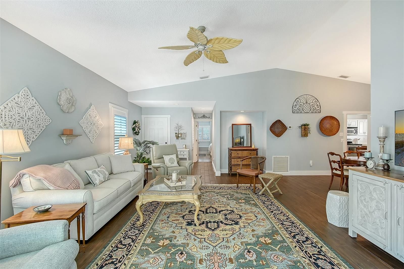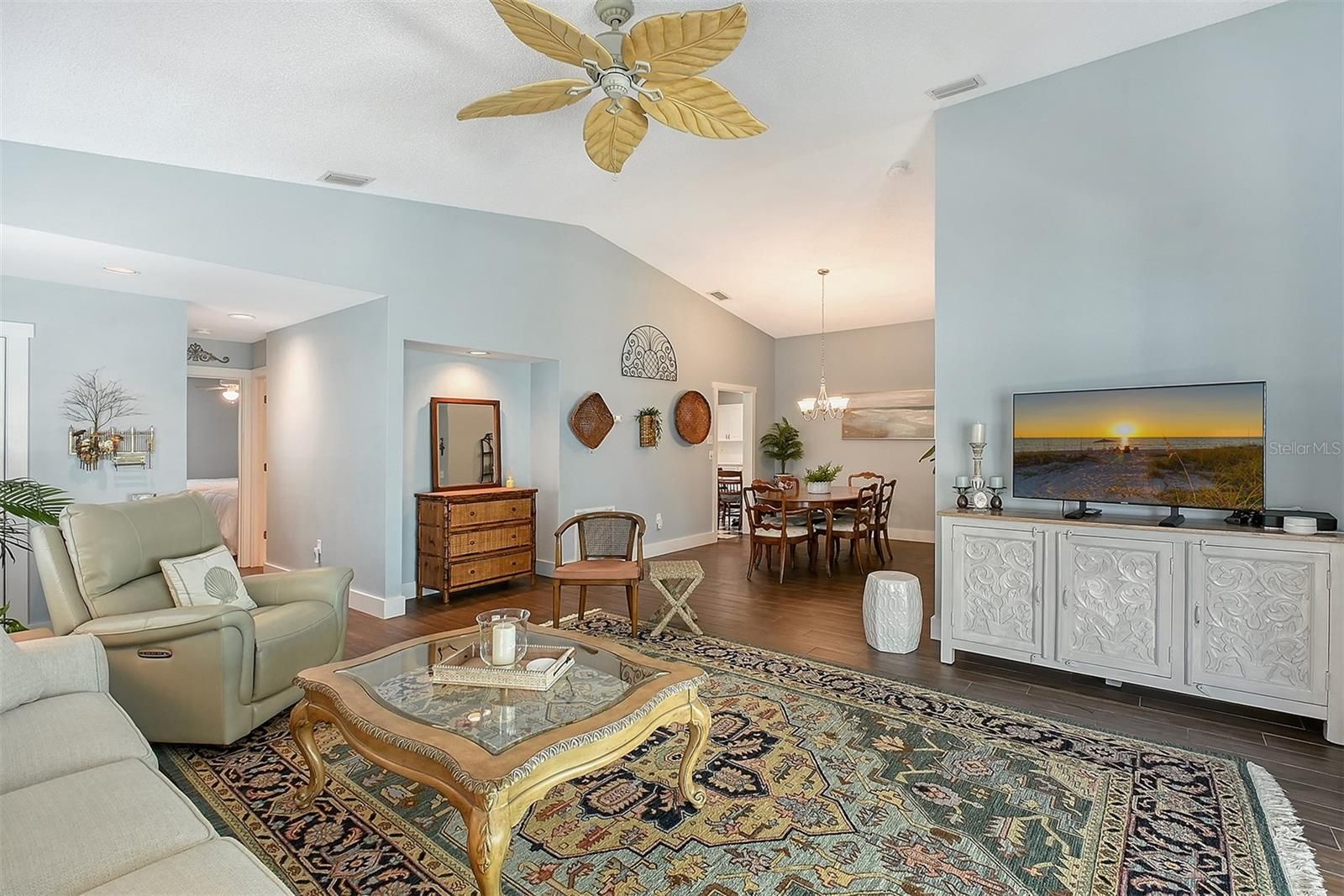 - Cathedral Ceiling(s), Ceiling Fan(s), Eat-in Kitchen, High Ceilings, Living/Dining Room, Open Floorplan, Main Level Primary, Solid Surface Counters, Split Bedrooms, Stone Counters, Thermostat, Vaulted Ceiling(s), Window Treatments