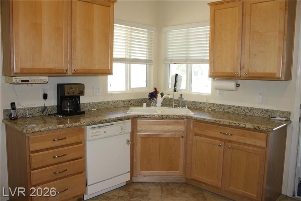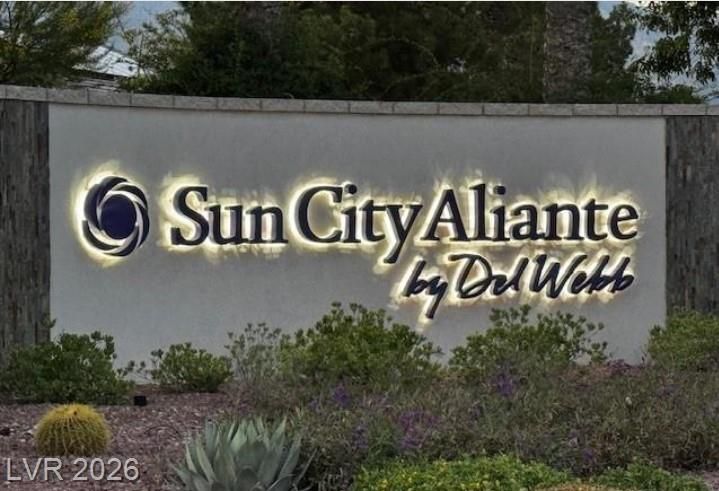 Welcome to Del Webb’s Sun City Aliante Community which offers activities for all residents. This home has 2 bedrooms & 2 baths with 1,157 sq feet. Enter through the front security door to the great room & kitchen. The kitchen has granite counter tops, wood cabinets & a combo of stainless steel/white appliances. A newly installed water purifier system is near the sink. There is a door to the garage w/plenty of storage. There is a pantry & hall closet nearby. The window over the sink looks out to the front yard. A brand-new LG washer & dryer stay. The Master Bedroom has wood flooring, master bath w/double sinks & an easy step in/out shower. Large Walk-in closet. Bedroom 2 is large and bright with its own closet & wood floors. Bathroom 2 is nearby with a shower/tub combo & white counter tops. The sliding doors opens up a large patio in the back, huge BBQ grill & plenty of room to set up furniture for your private oasis. There is a pull-down screen for privacy.