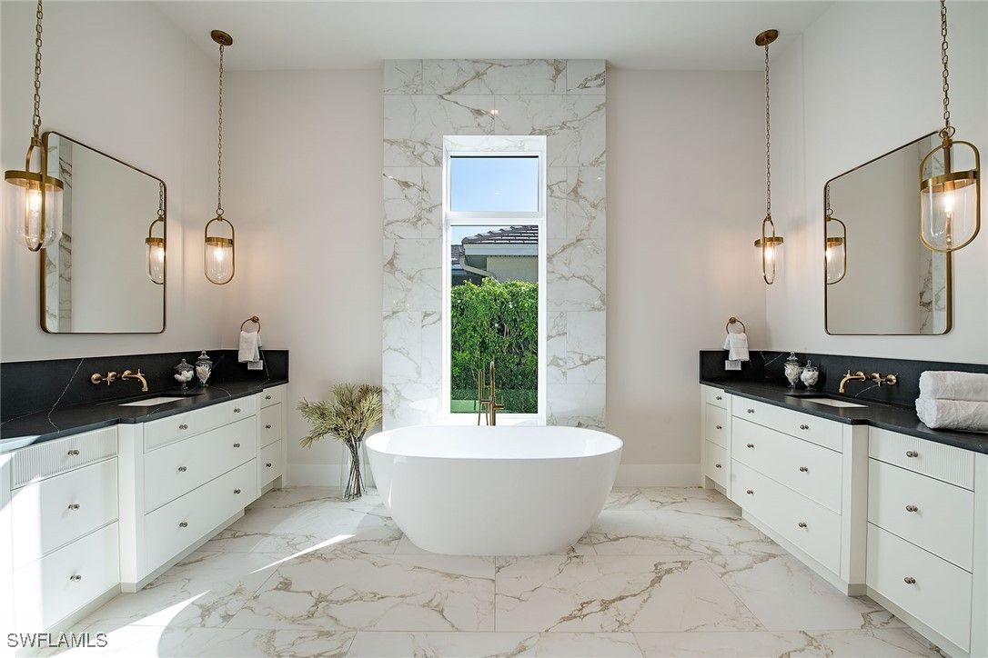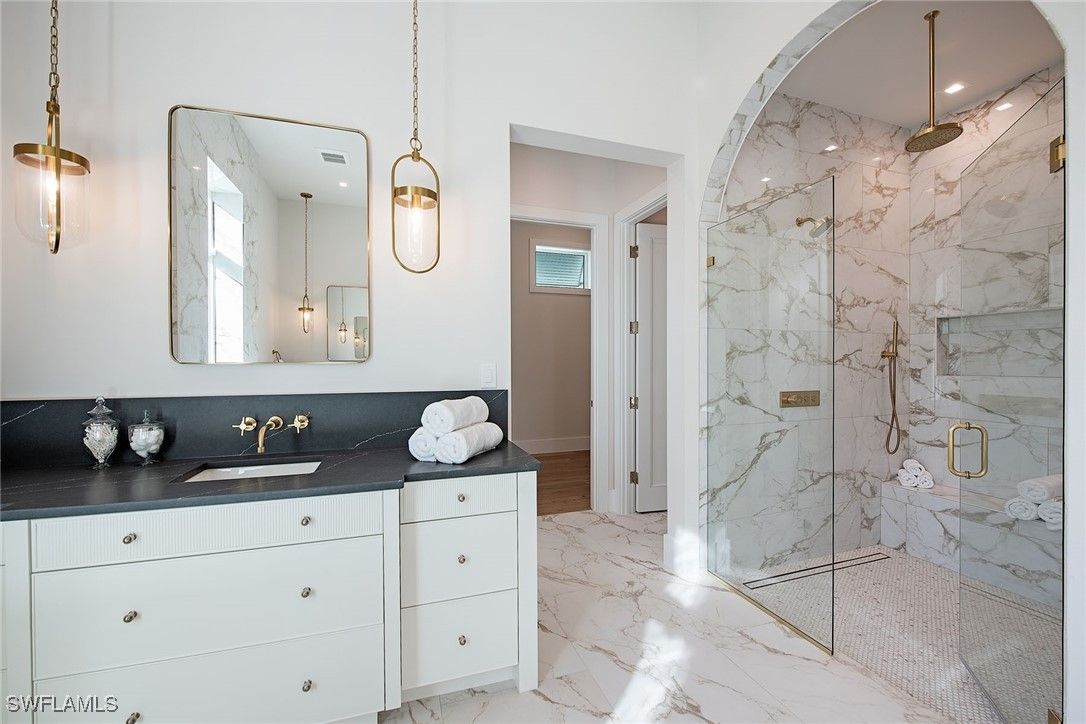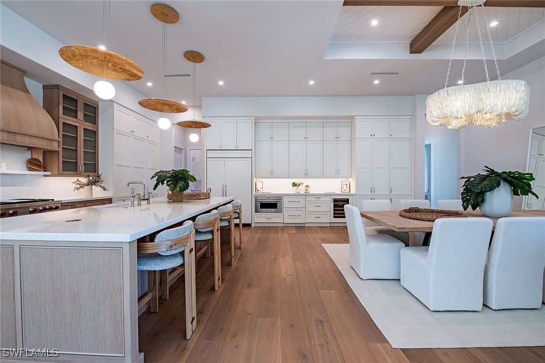 New construction in X-500 flood zone, a luxurious transitional oasis! Enter the grand foyer of this exquisite five-bedroom, five-bath residence, and be immediately enamored by its breathtaking vaulted ceilings and the seamless flow between indoor and outdoor spaces. This stunning home in the Moorings showcases distinctive architectural details that elevate its charm and sophistication. Prepare to entertain in style in the gourmet kitchen, equipped with elegant quartz countertops, state-of-the-art appliances, a built-in pantry, wine cooler, and refrigerator drawers. The spacious center island, complete with a breakfast bar, is ideal for gatherings and culinary delights. Throughout the home, you’ll find exquisite porcelain tile and white oak wood flooring, complemented by solid-core 8-foot interior doors. Modern conveniences abound with a generator, a built-in Sonos music system and pre-wiring for security cameras, marrying elegance with cutting-edge functionality. The expansive owner's suite is a retreat, featuring quartz countertops, a relaxing soaking tub, two beautifully designed walk-in closets, and private water closets for added privacy. Enter into the magnificent great room which opens seamlessly to your secure outdoor living area, complete with a stunning swimming pool and spa. Enjoy alfresco dining in the fully equipped summer kitchen, cozy up by the gas fireplace, and relax on the outdoor patios or under the covered lanai, featuring automated insect screens and hurricane-rated shutters. Ideally just a short distance from the beach, restaurants and shopping, this remarkable home also offers the opportunity for membership to sought-after Moorings Private Beach Park. Crafted with precision and elegance by Lutgert Construction, this residence is a blend of luxury and lifestyle. Your forever home awaits.