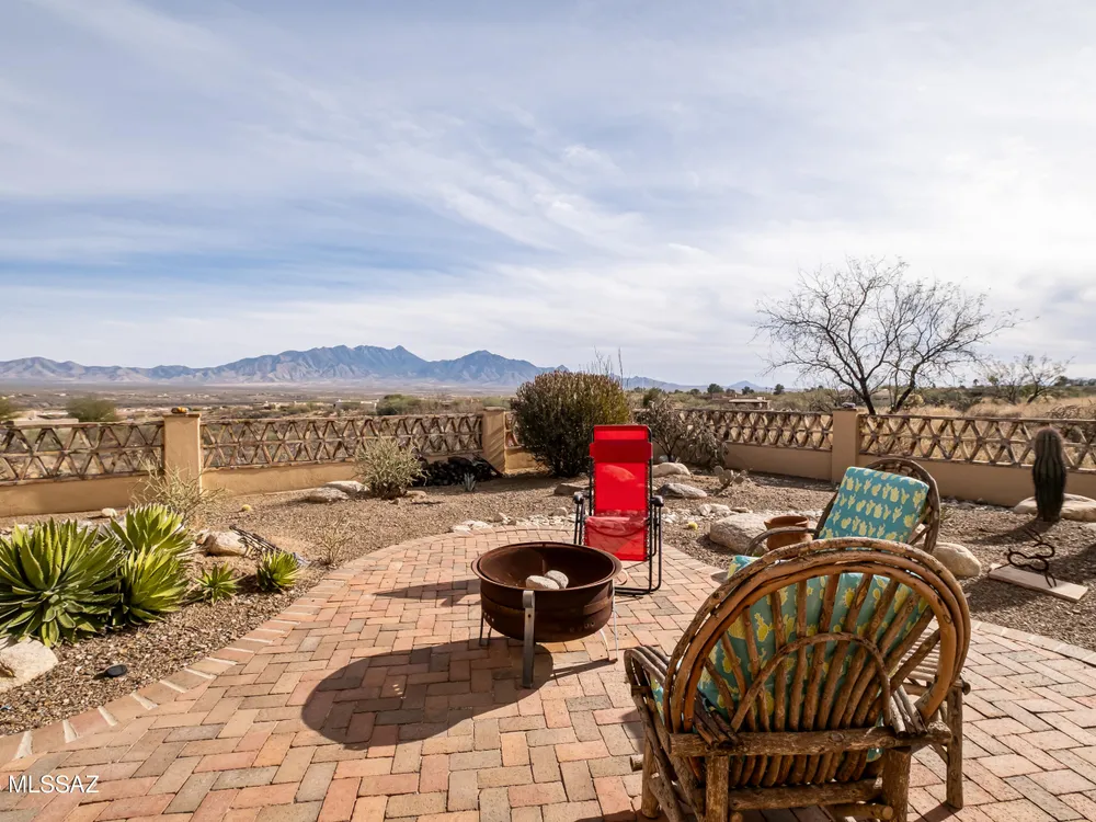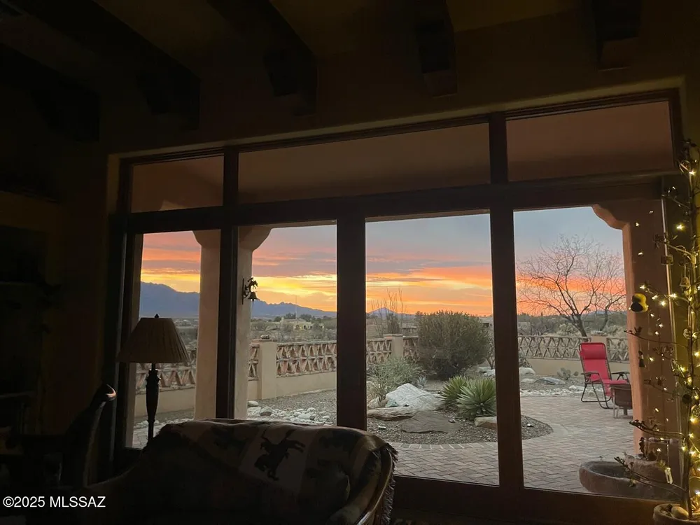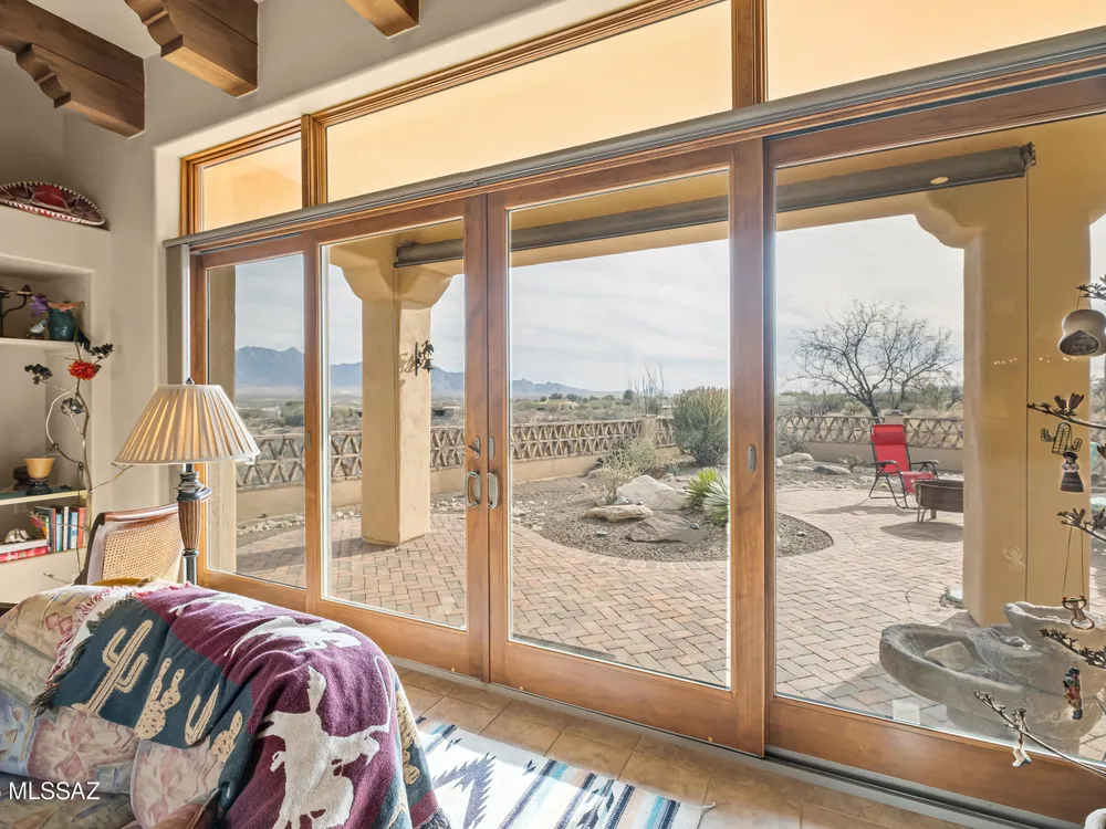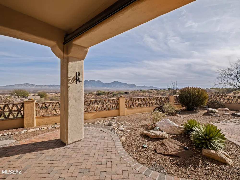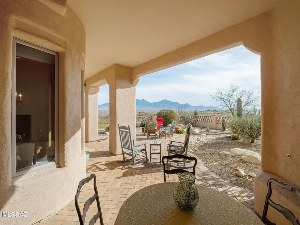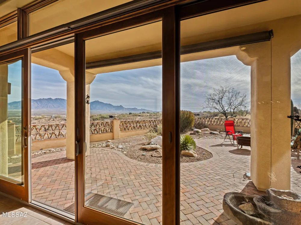 Tucked away in a peaceful cul-de-sac, surrounded by acres of open desert and offering breathtaking panoramic views of the Santa Rita Mountains. This is a one-of-a-kind Santa Fe-style home built by Dorn. Floor-to-ceiling windows and doors span the Great Room, seamlessly connecting the space to the covered back patio. Relax and enjoy the outdoor fireplace and take in the stunning views and complete privacy!Inside, the living room features a charming, beamed ceiling that adds a rustic touch, while a wall of built-in entertainment center that offers the perfect space to showcase your favorite items. A gas fireplace adds warmth and creates a cozy atmosphere. The open kitchen concept is inviting and offers beautiful cabinetry, granite countertops, a large island, and a cozy eat-in.