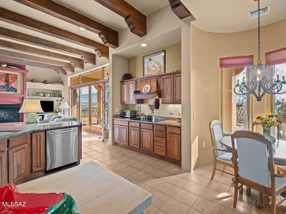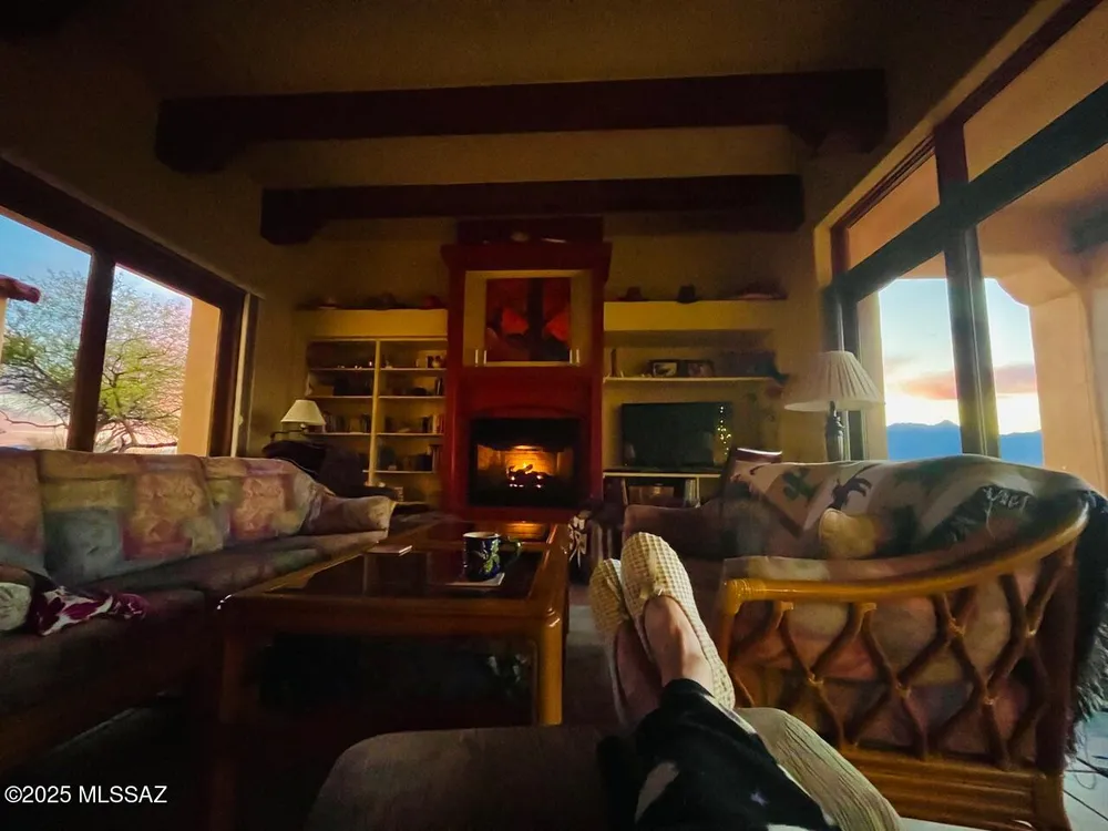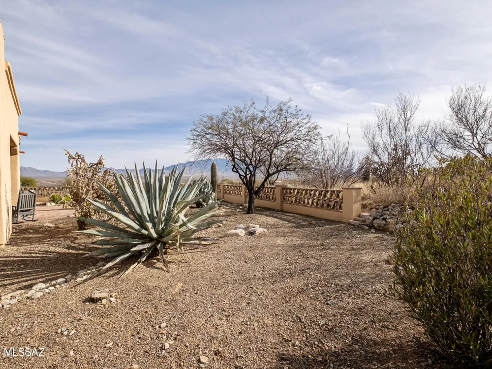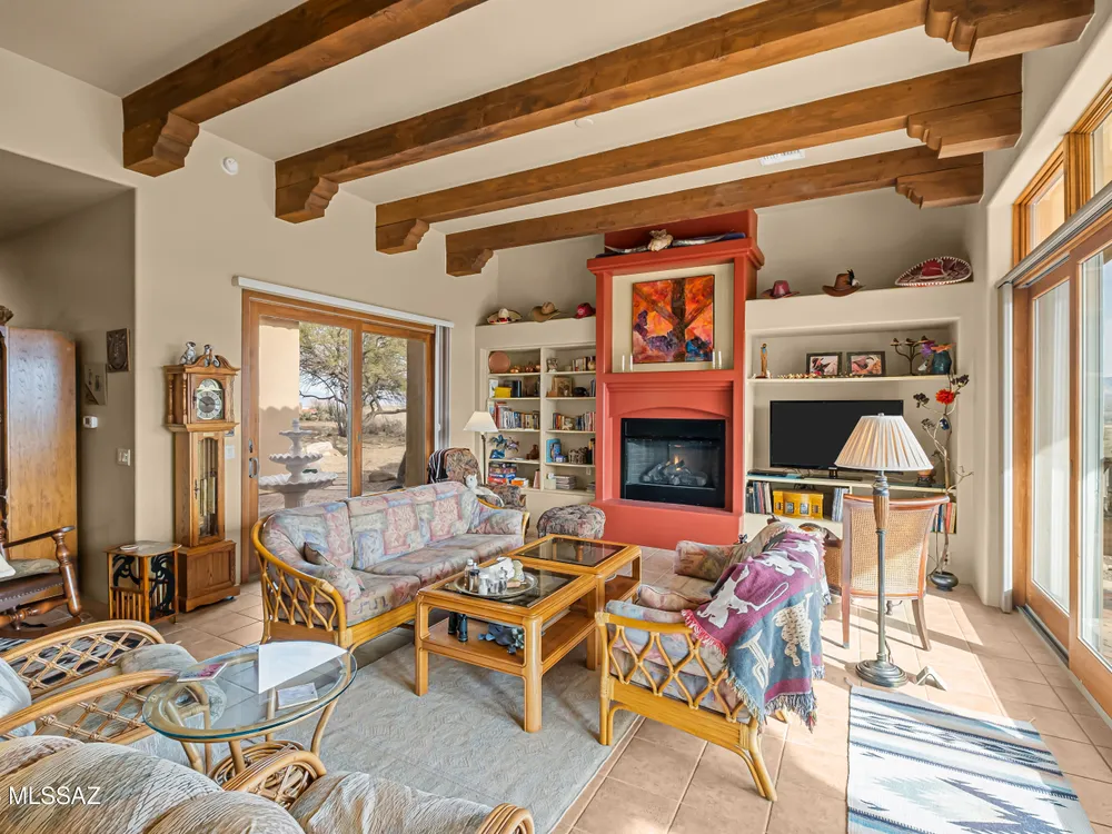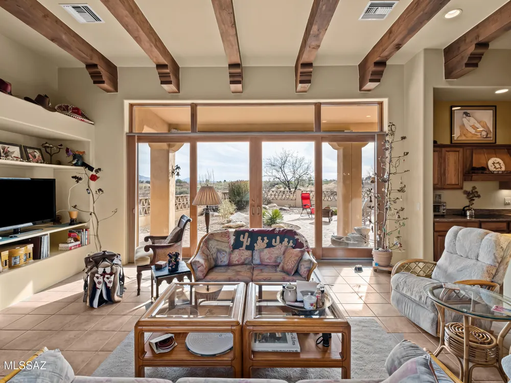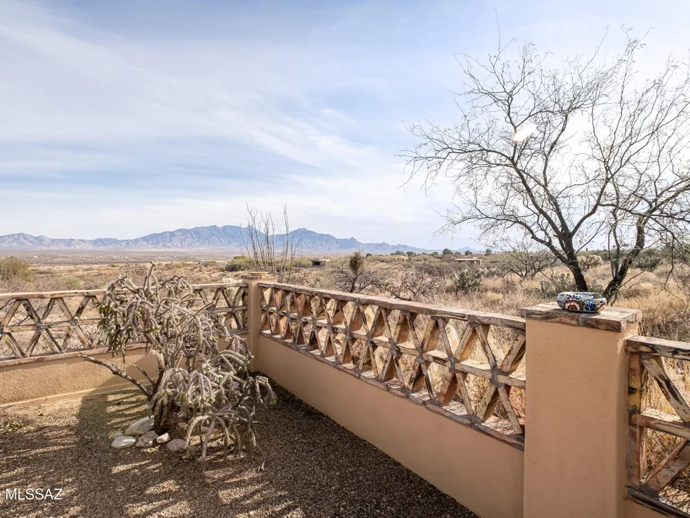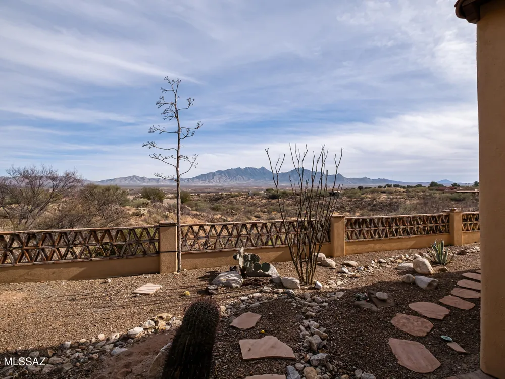 Tucked away in a peaceful cul-de-sac, surrounded by acres of open desert and offering breathtaking panoramic views of the Santa Rita Mountains. This is a one-of-a-kind Santa Fe-style home built by Dorn. Floor-to-ceiling windows and doors span the Great Room, seamlessly connecting the space to the covered back patio. Relax and enjoy the outdoor fireplace and take in the stunning views and complete privacy!Inside, the living room features a charming, beamed ceiling that adds a rustic touch, while a wall of built-in entertainment center that offers the perfect space to showcase your favorite items. A gas fireplace adds warmth and creates a cozy atmosphere. The open kitchen concept is inviting and offers beautiful cabinetry, granite countertops, a large island, and a cozy eat-in.