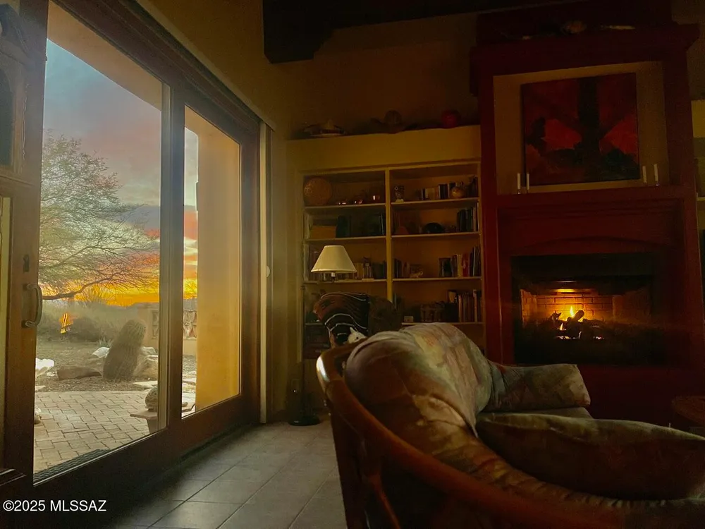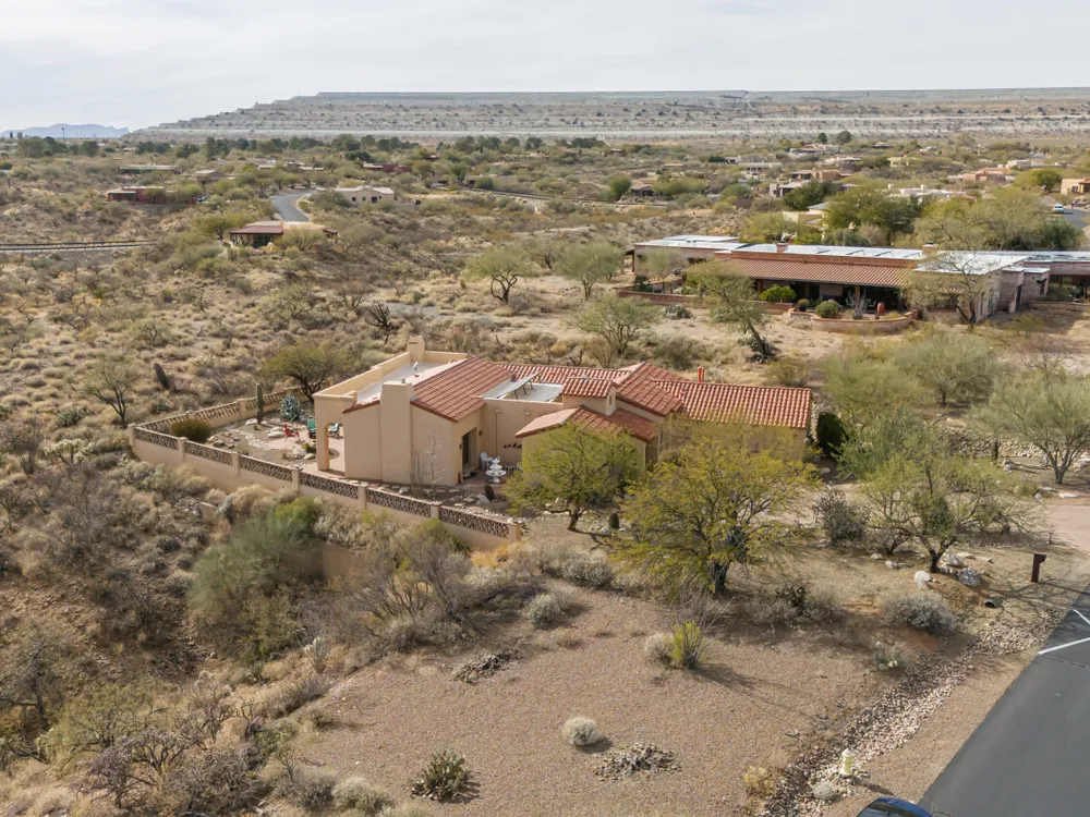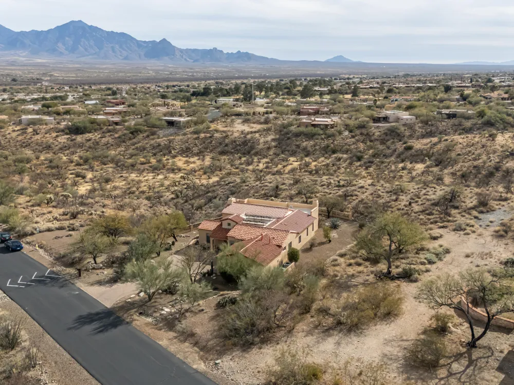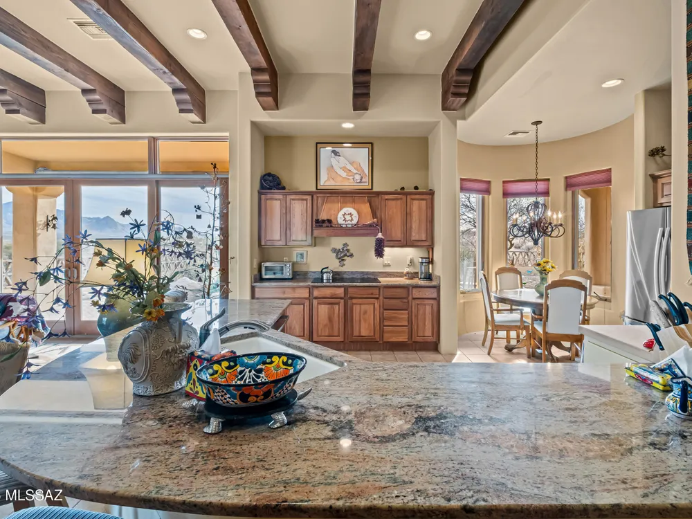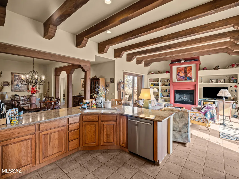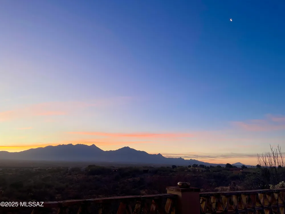 Tucked away in a peaceful cul-de-sac, surrounded by acres of open desert and offering breathtaking panoramic views of the Santa Rita Mountains. This is a one-of-a-kind Santa Fe-style home built by Dorn. Floor-to-ceiling windows and doors span the Great Room, seamlessly connecting the space to the covered back patio. Relax and enjoy the outdoor fireplace and take in the stunning views and complete privacy!Inside, the living room features a charming, beamed ceiling that adds a rustic touch, while a wall of built-in entertainment center that offers the perfect space to showcase your favorite items. A gas fireplace adds warmth and creates a cozy atmosphere. The open kitchen concept is inviting and offers beautiful cabinetry, granite countertops, a large island, and a cozy eat-in.