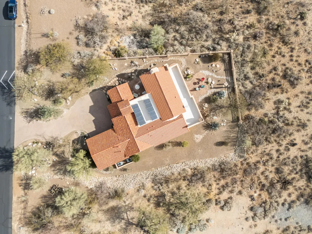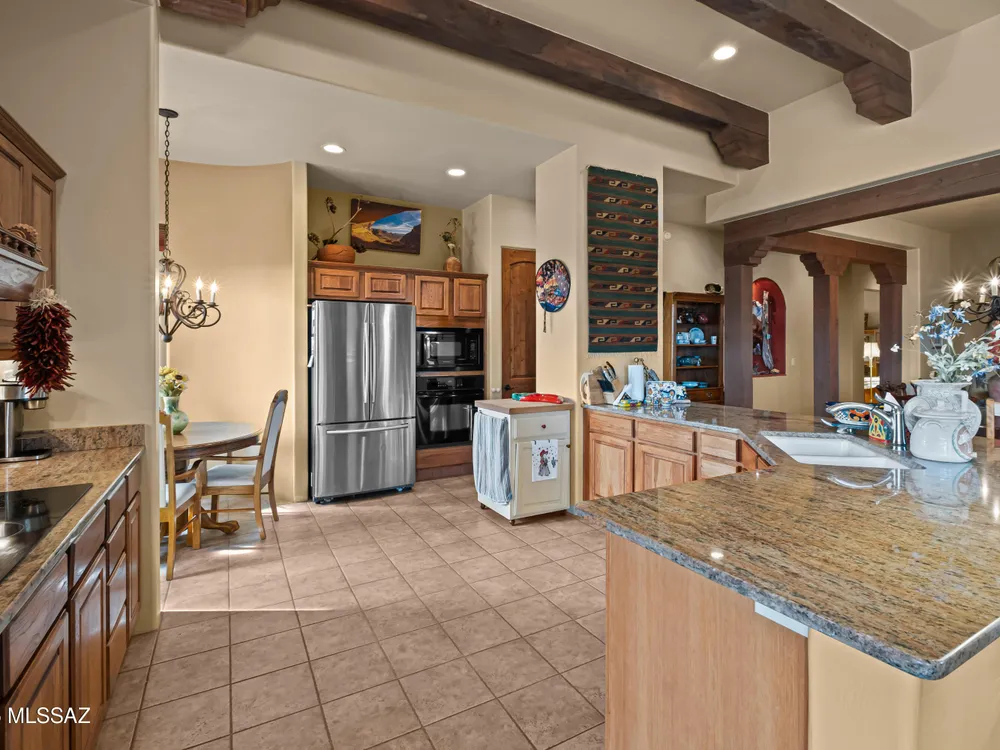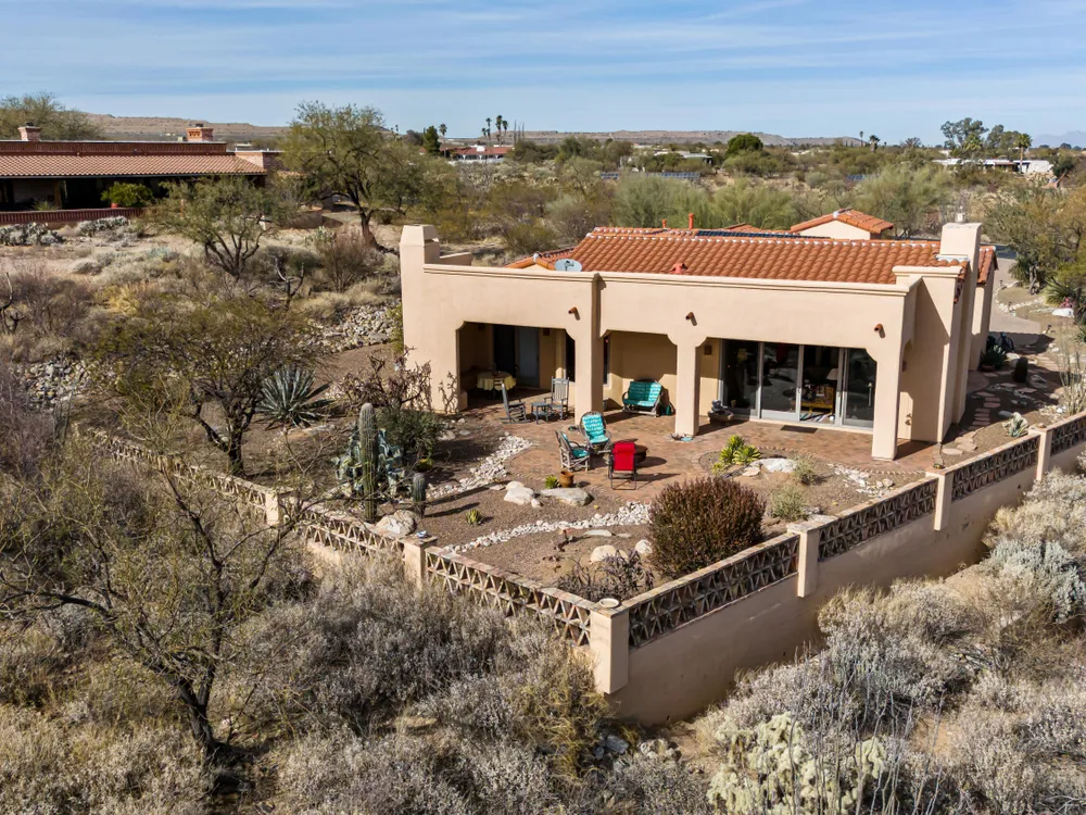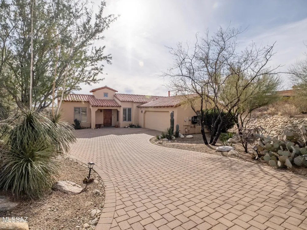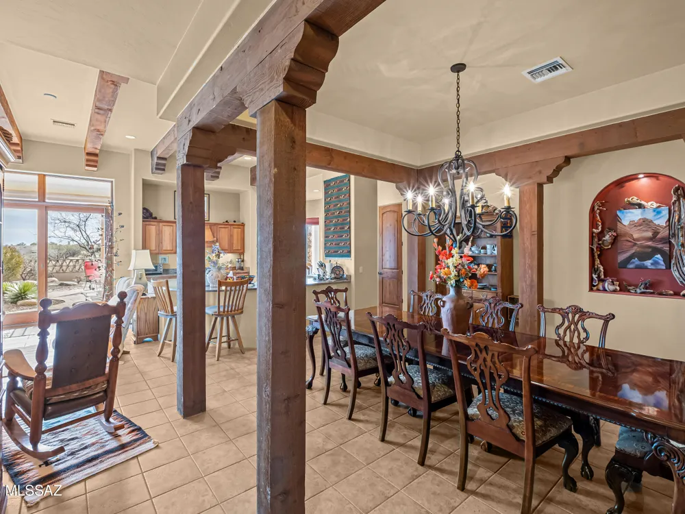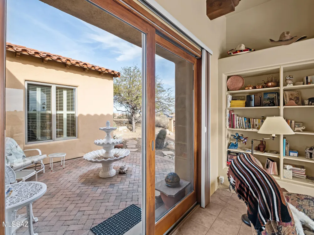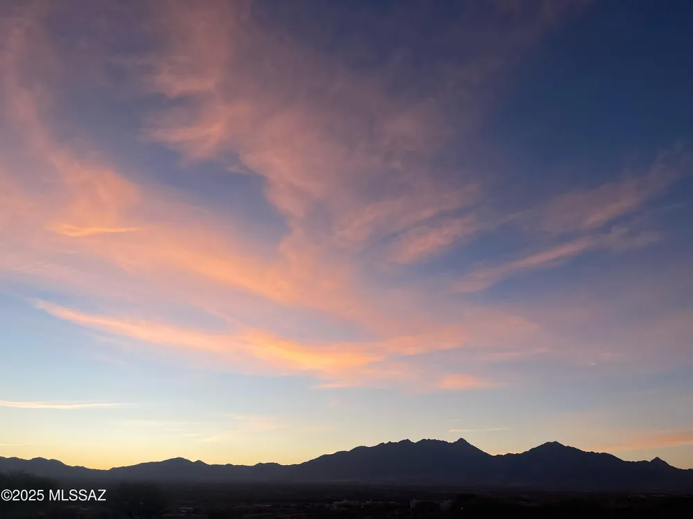 Tucked away in a peaceful cul-de-sac, surrounded by acres of open desert and offering breathtaking panoramic views of the Santa Rita Mountains. This is a one-of-a-kind Santa Fe-style home built by Dorn. Floor-to-ceiling windows and doors span the Great Room, seamlessly connecting the space to the covered back patio. Relax and enjoy the outdoor fireplace and take in the stunning views and complete privacy!Inside, the living room features a charming, beamed ceiling that adds a rustic touch, while a wall of built-in entertainment center that offers the perfect space to showcase your favorite items. A gas fireplace adds warmth and creates a cozy atmosphere. The open kitchen concept is inviting and offers beautiful cabinetry, granite countertops, a large island, and a cozy eat-in.