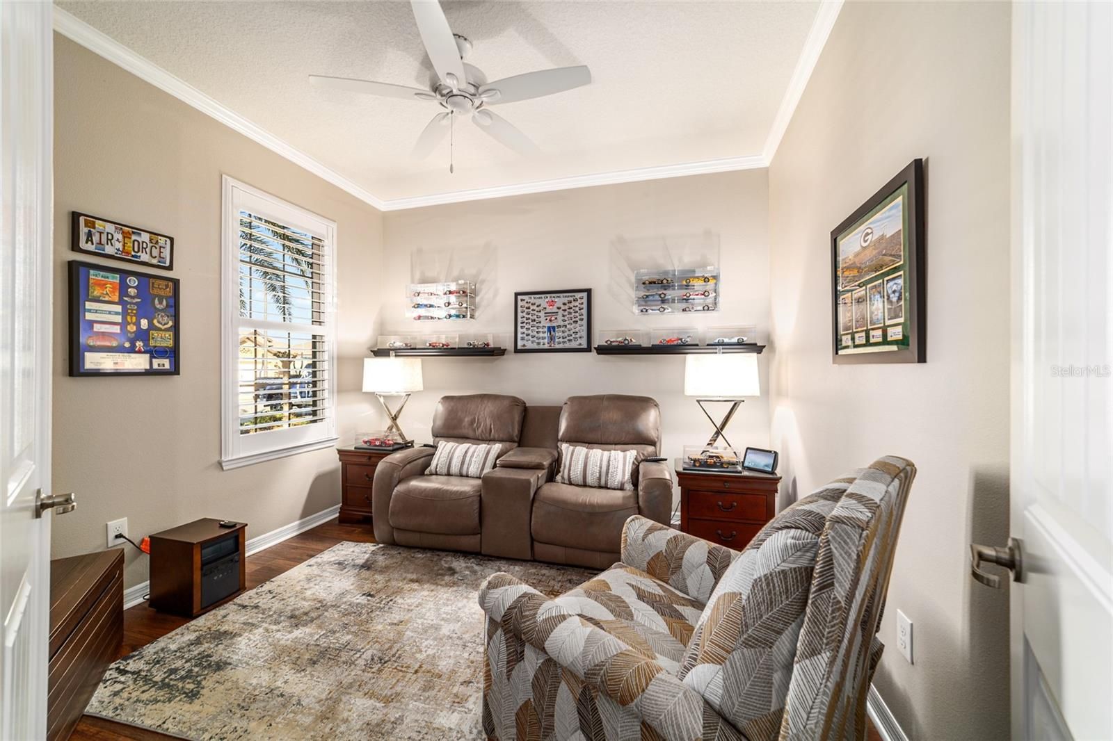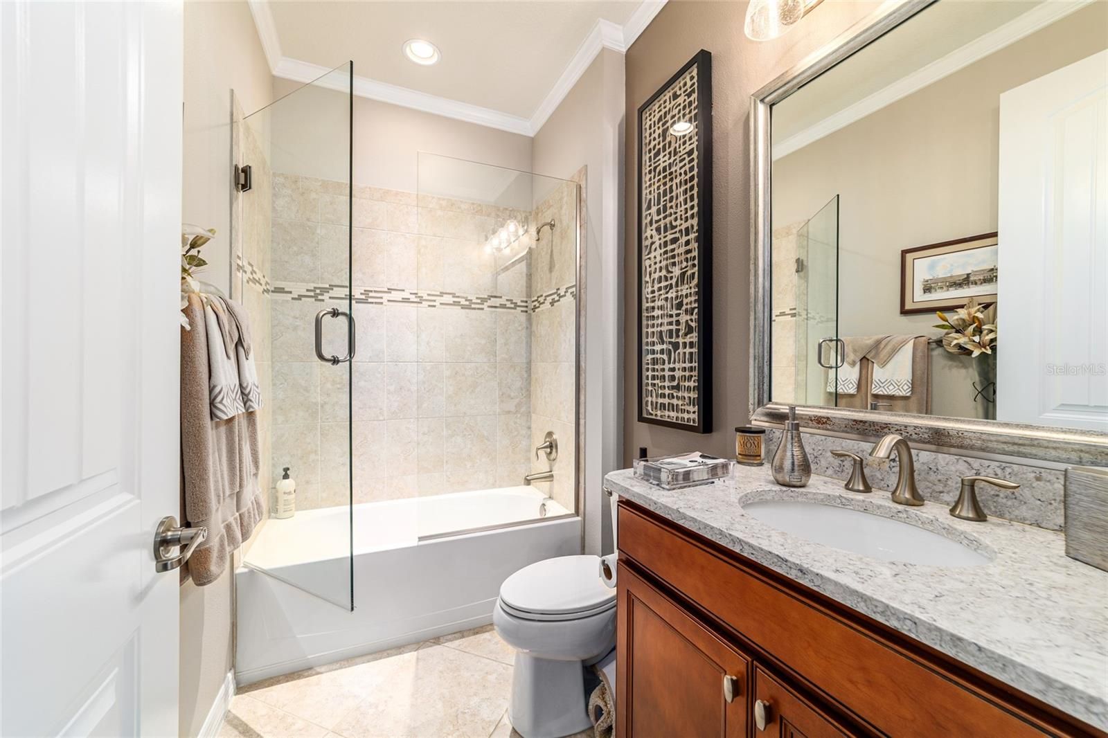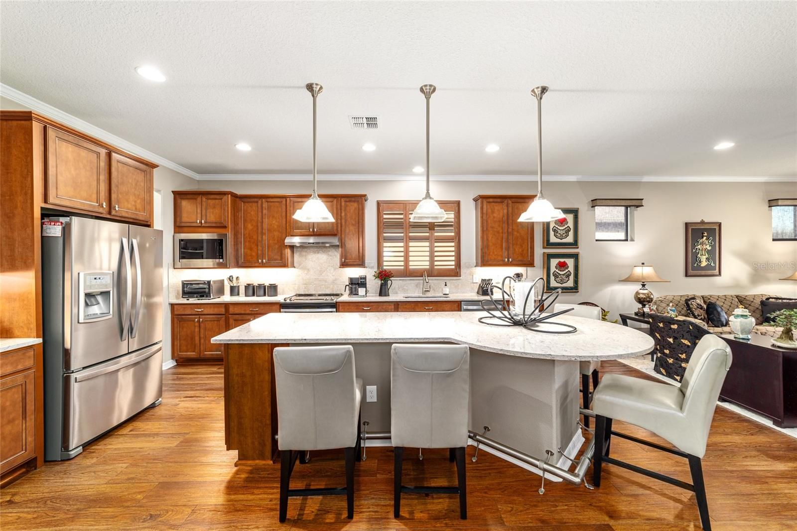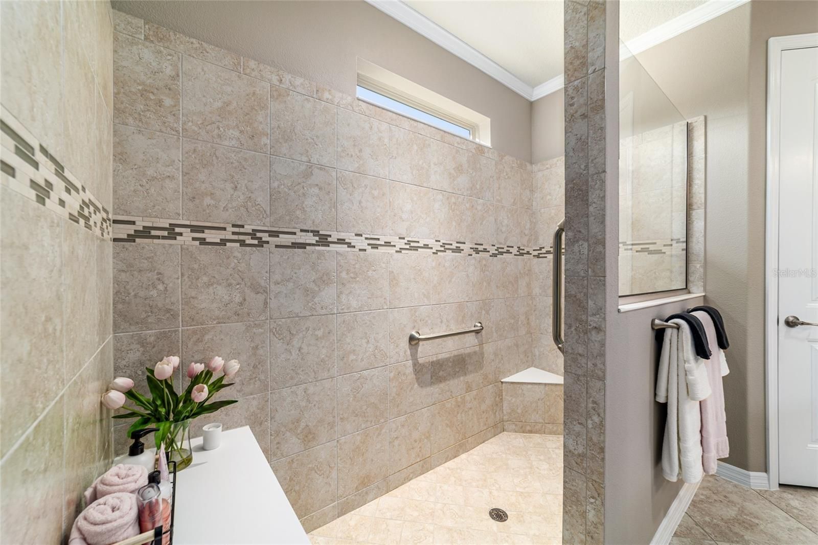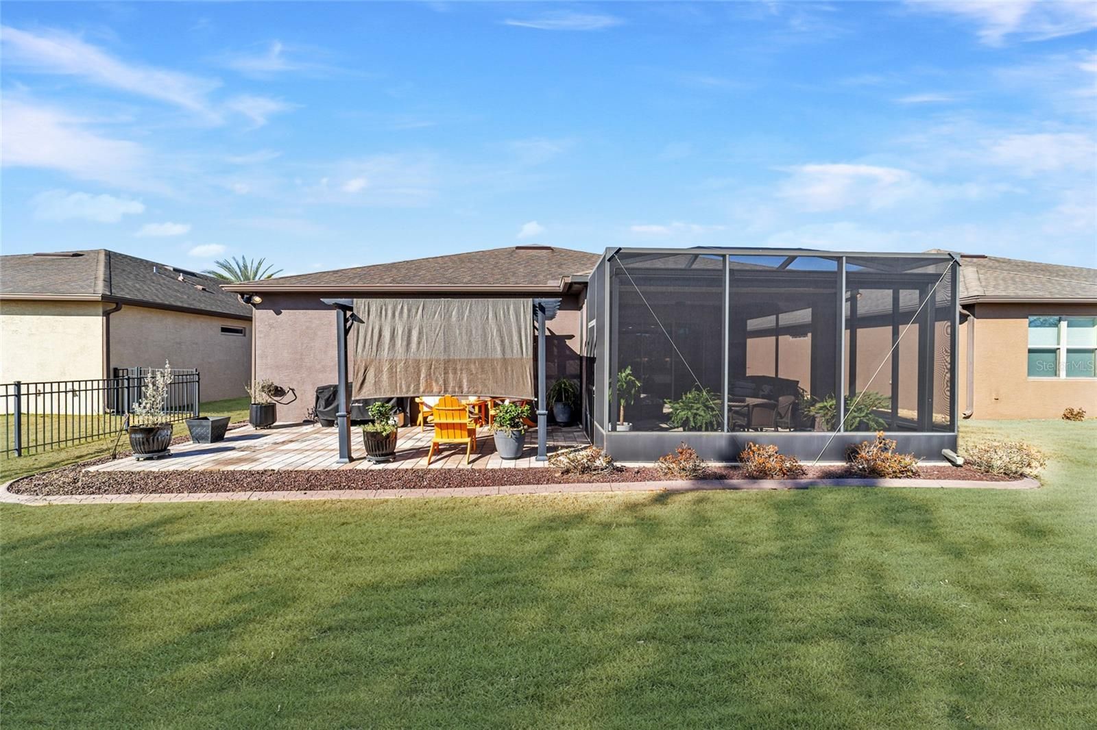 Enjoy effortless living in this beautiful two-bedroom, two-bath Martin Ray model with a versatile flex room and extended garage, located in the gated 55+ Stone Creek Golf Course Community known for its exceptional resort-style amenities. This home offers wonderful curb appeal, complete with mature landscaping, custom coach lighting, and a custom-designed Perry’s glass-inlay front door with a lifetime warranty, setting the tone for the thoughtful details found within. The versatile floor plan blends comfort and designer elements, including updated luxury vinyl plank flooring, recessed LED downlighting, 8-foot interior doors, and crown molding that adds a touch of refinement. The flex room, framed by French doors, offers desirable extra space ideal for a home office, library, or hobby space. The spacious gathering room features a triple pocket slider that opens seamlessly to the covered lanai and extended screened-in Florida room, creating an inviting indoor-outdoor living experience. Just beyond, a paver-lined sitting area with a sun-shaded pergola offers a peaceful spot for outdoor gatherings. The well-appointed kitchen offers sleek quartz countertops, stainless steel appliances, an oversized island with specialty pendant lighting and bar rail, a striking tile backsplash, and upgraded cabinetry with crown molding, under-cabinet lighting, and pull-outs in the lower cabinets. A large pantry with upgraded shelving and a butler’s pantry with a built-in desk adds even more convenience and storage space. The Owner’s suite features a custom outfitted walk-in closet and an en suite bath offering a quartz-topped double vanity, a large Roman-style walk-in shower with a seating bench and decorative glass tile inlay, and a transom window that fills the space with natural light. Additional thoughtful upgrades throughout include designer window treatments that add a tailored finish to each room, solar tube lighting, a mud-room with built-ins providing convenient organization as you come and go, and upgraded tile in the secondary bath. Practical enhancements continue with a whole-home water softener, a four-foot garage extension for a golf cart or workspace, and overhead garage storage racks for added storage. The sliding garage privacy screen door allows fresh air to circulate while maintaining comfort, and all windows in the home, except the sliders, have been professionally tinted to help protect furnishings and maintain a pleasant indoor temperature. Experience resort-style living at its finest and discover a community designed for comfort, connection, and carefree days, complete with a 24/7 staffed gated entrance that provides both security and peace of mind. Residents enjoy luxury-inspired amenities, including heated pools, a state-of-the-art fitness center, a spa, and soothing hot tubs and saunas that make relaxation part of everyday living. For those who love to stay active, the community features pickleball, bocce, tennis, and even a softball field, while a dedicated lifestyle team plans entertainment, activities, and special events that make it easy to connect with neighbors. Just beyond the gates, you’ll find a beautifully maintained golf course, pro shop, and on-site restaurant, perfect for socializing, unwinding, and enjoying the Florida lifestyle.