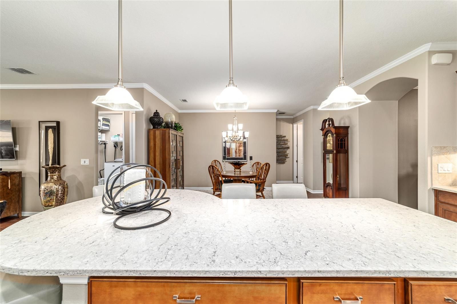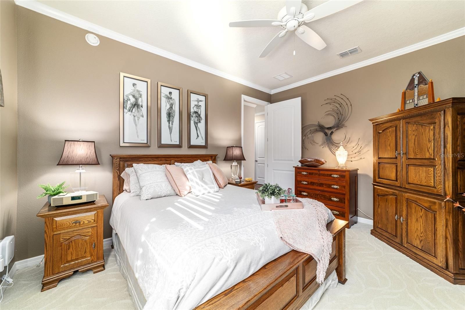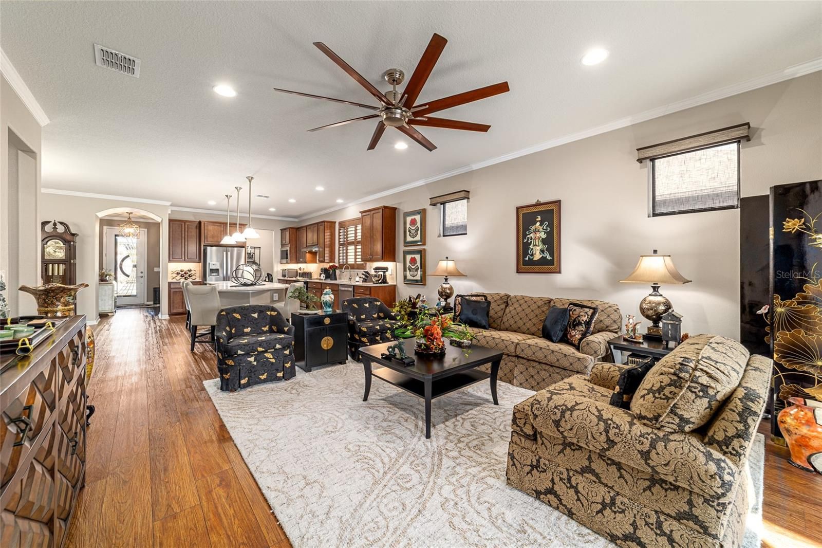 - Ceiling Fan(s), Crown Molding, Eat-in Kitchen, High Ceilings, Kitchen/Family Room Combo, Living/Dining Room, Open Floorplan, Main Level Primary, Stone Counters, Thermostat, Walk-In Closet(s), Window Treatments