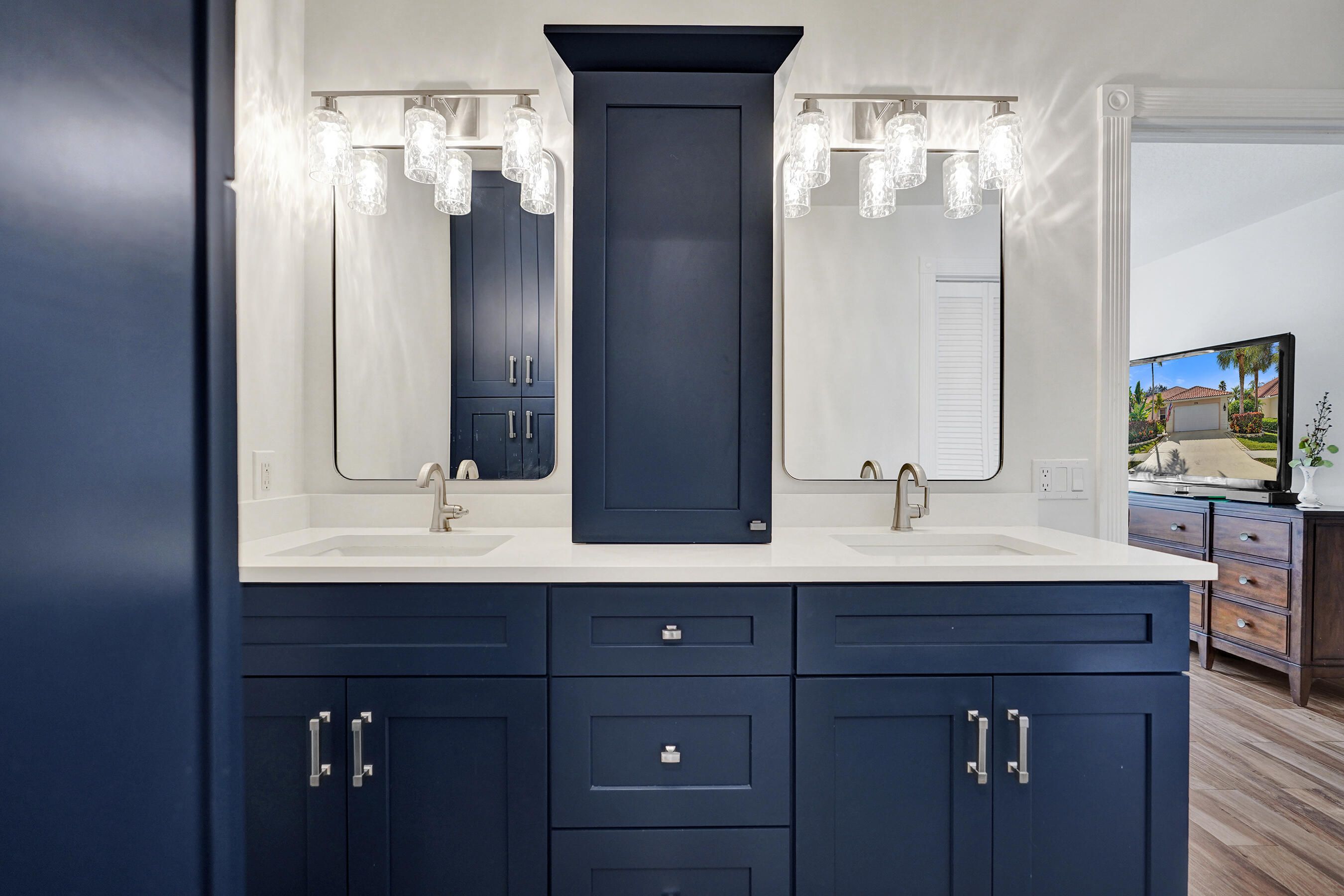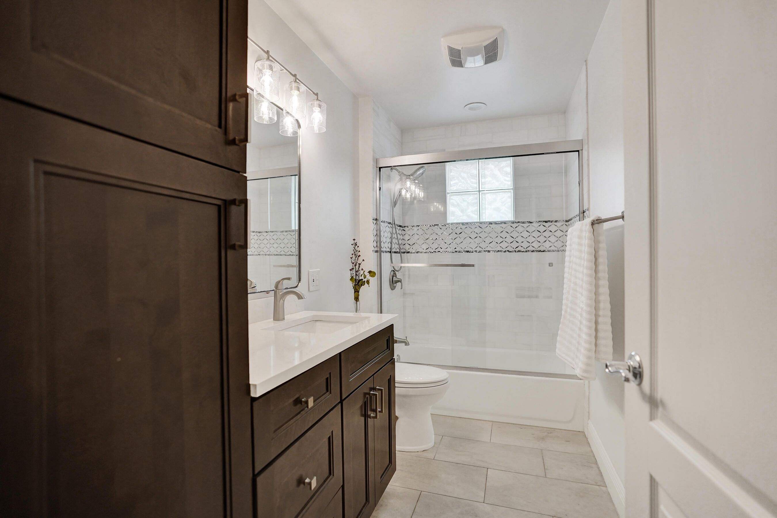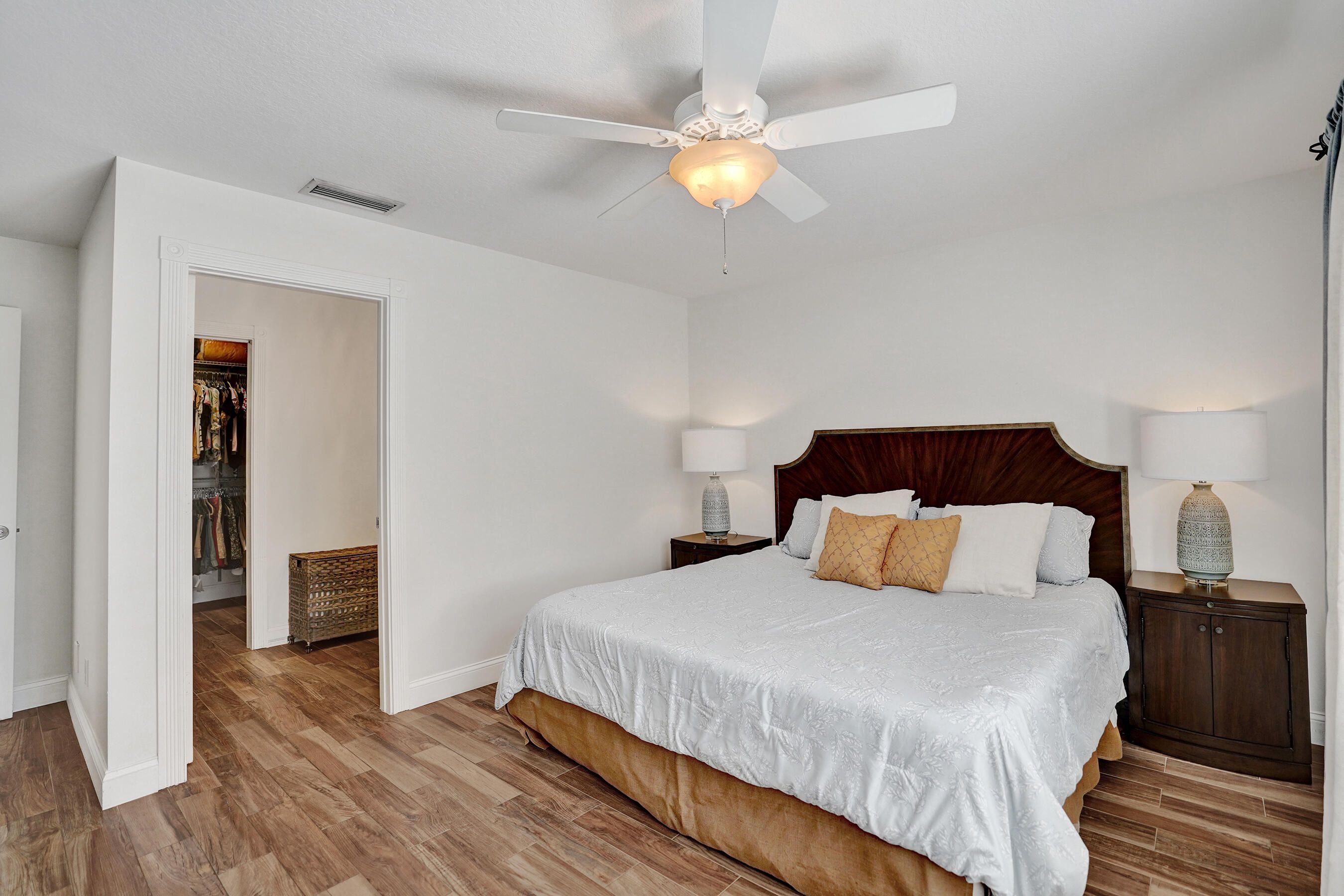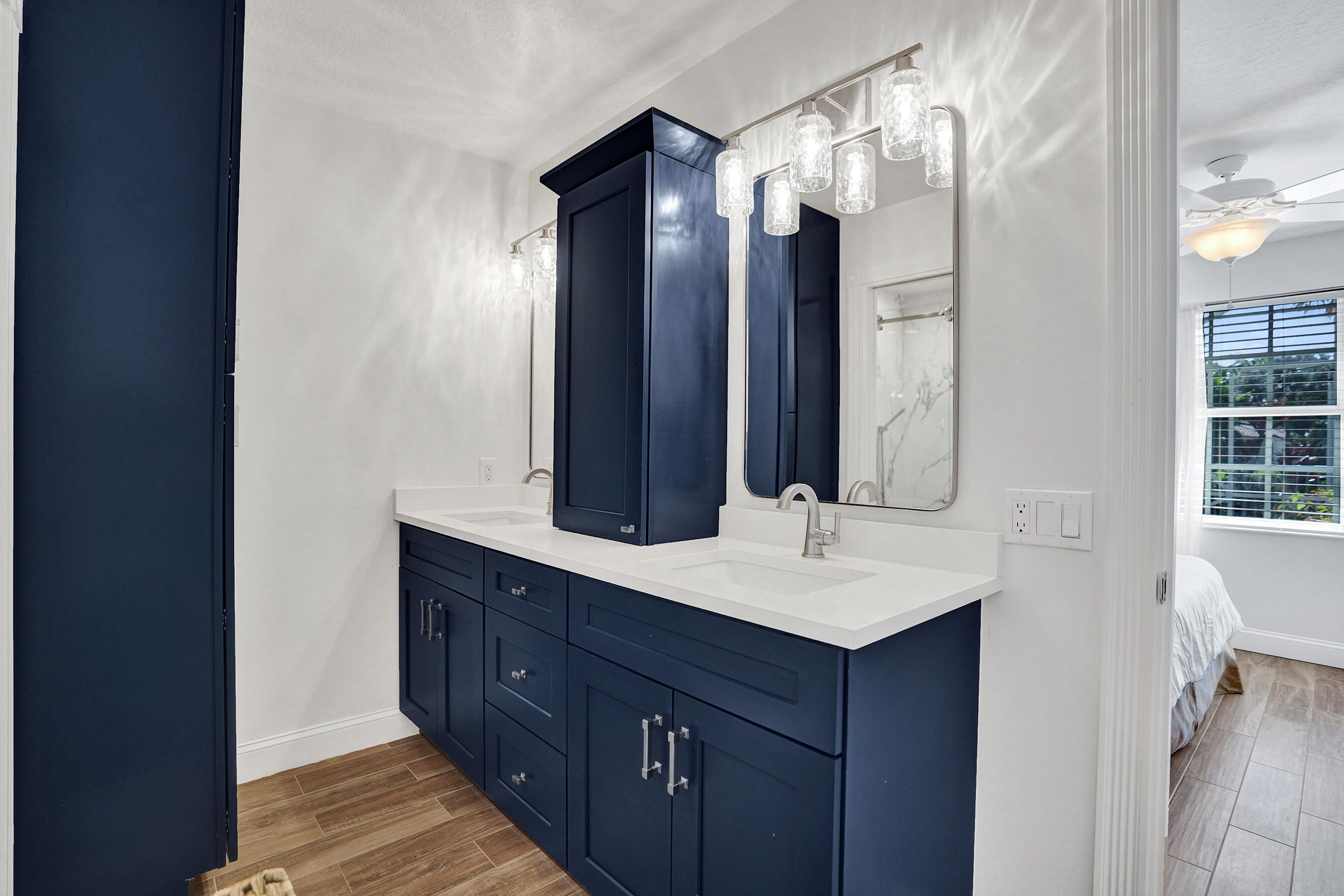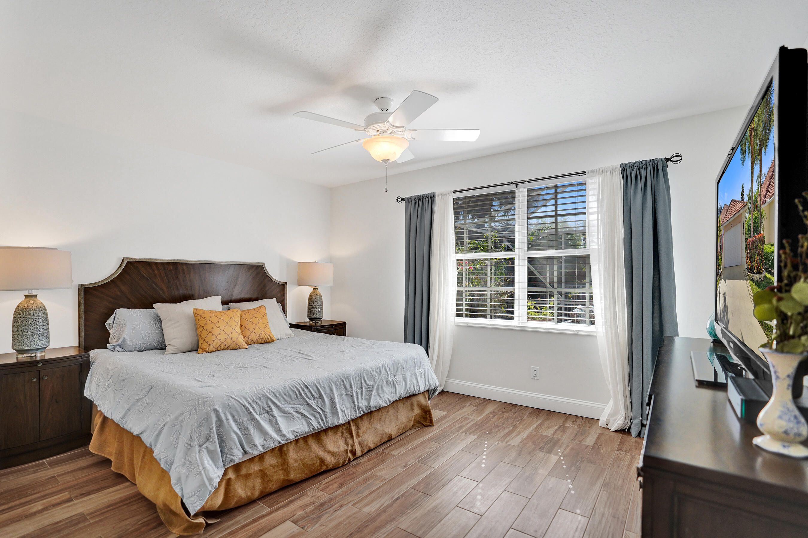 Beautifully updated Regent model villa in RiverWalk, West Palm Beach. This 3BR/2BA home features wood-look ceramic tile flooring throughout, a renovated kitchen with marble countertops, abundant cabinetry, and modern appliances. Bathrooms are tastefully updated, including a luxurious primary ensuite with dual sinks, rainfall shower, and walk-in closet. Enjoy tranquil lake views from the screened patio and professionally landscaped, fenced backyard with pet area. Located on a quiet cul-de-sac with 2-car garage, 2 driveway spaces, central vacuum, and newer HVAC, water heater, and appliances. RiverWalk offers resort-style amenities with no country club fees. Prime location near Turnpike, I95, PBI Airport, Palm Beach Outlets, Kravis Center, Downtown, pristine beaches and Palm Beach Island.