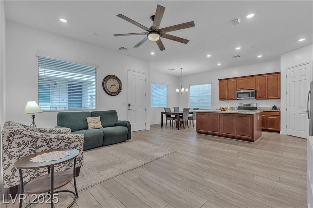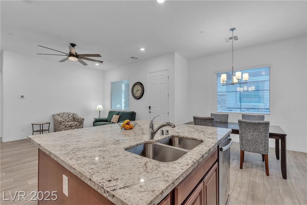 You could be HOME FOR THE HOLIDAYS in this Beautiful, Modern and Move-In-Ready 2BR + Den / 2BA home in 55+ Guard-Gated Heritage at Cadence featuring a popular single-story courtyard design and open-concept floor plan. The kitchen boasts granite countertops, large island, stainless steel appliances and walk-in pantry. Additional features include luxury vinyl plank flooring throughout, decorative ceiling fans, Rheem water softener, Brisa retractable screen door and LV Pro Tint on select windows for heat/UV protection. Garage includes NEMA outlet for EV/golf cart charging and Genie Garage Door opener compatible w/Aladdin Connect. Enjoy resort-style amenities: clubhouse, indoor/outdoor pools, pickleball, tennis, fitness center, dog parks, social events and more. Located in Cadence - ranked in 2025 as a Top 3 U.S. master-planned community—near trails, parks, golf, shopping, world class dining and entertainment!