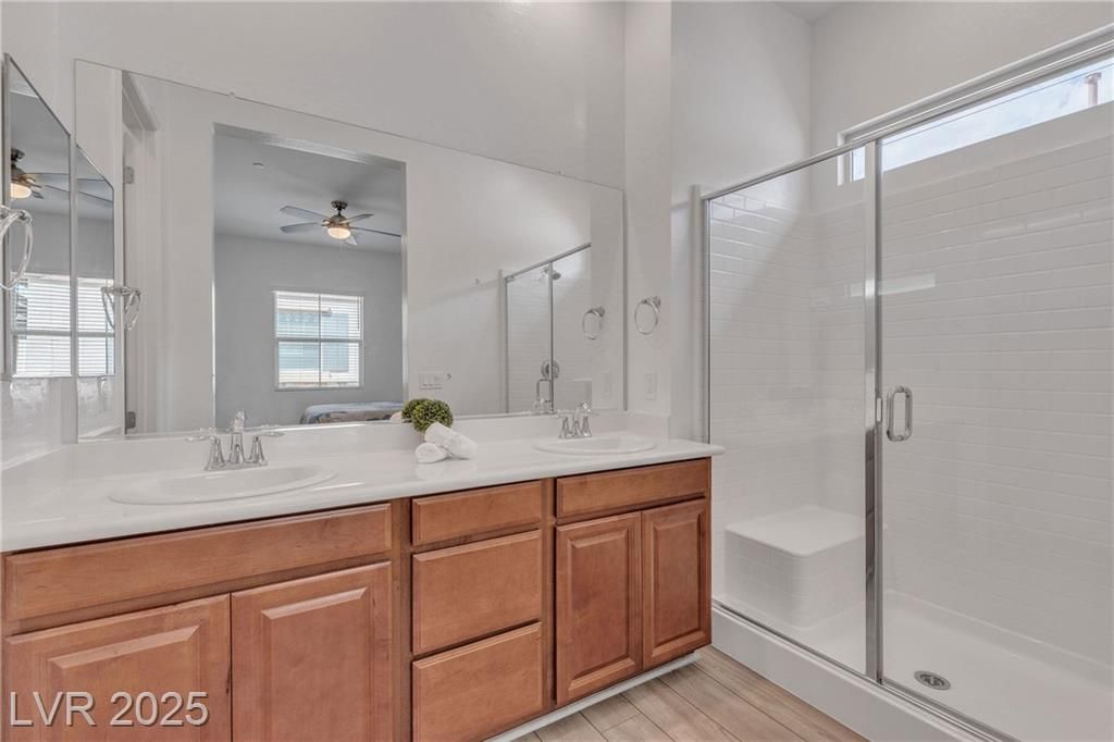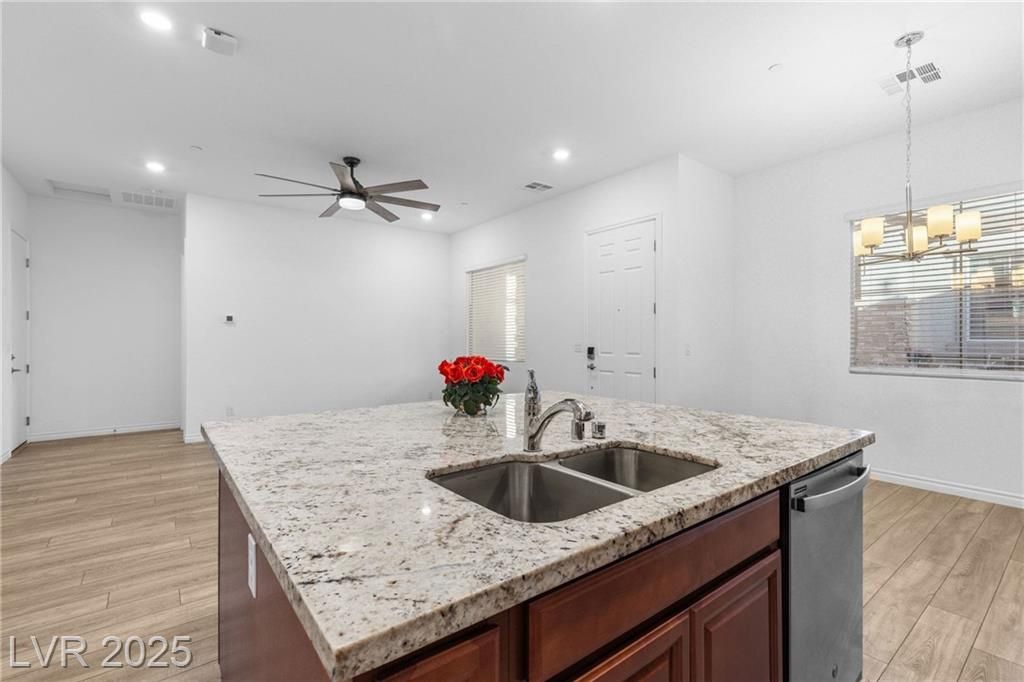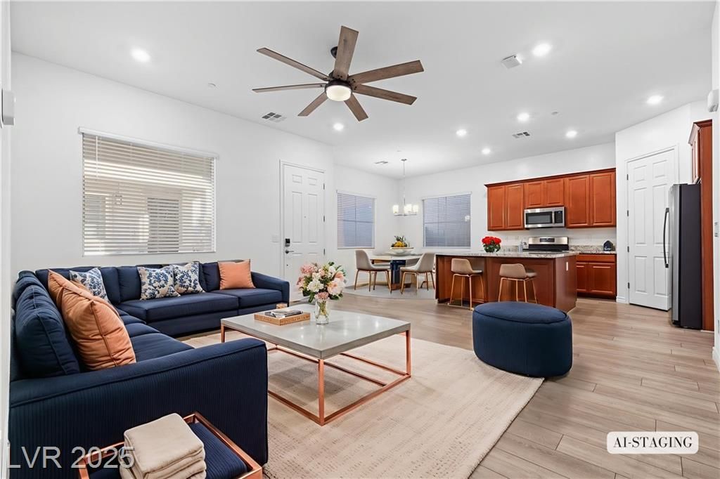 Everyday is a getaway at Heritage Cadence, Henderson's only Guard Gated 55+ Community! This Beautiful, Modern and Move-In-Ready 2BR + Den / 2BA home features a popular single-story courtyard design and open-concept floor plan. The kitchen boasts granite countertops, large island, stainless steel appliances and walk-in pantry. Additional features include luxury vinyl plank flooring throughout, decorative ceiling fans, Rheem water softener, Brisa retractable screen door and LV Pro Tint on select windows for heat/UV protection. Garage includes NEMA outlet for EV/golf cart charging and Genie Garage Door opener compatible w/Aladdin Connect. Enjoy resort-style amenities: clubhouse, indoor/outdoor pools, pickleball, tennis, fitness center, dog parks, social events and more. Located in Cadence - ranked in 2025 as a Top 3 U.S. master-planned community—near trails, parks, golf, shopping, world class dining and entertainment!